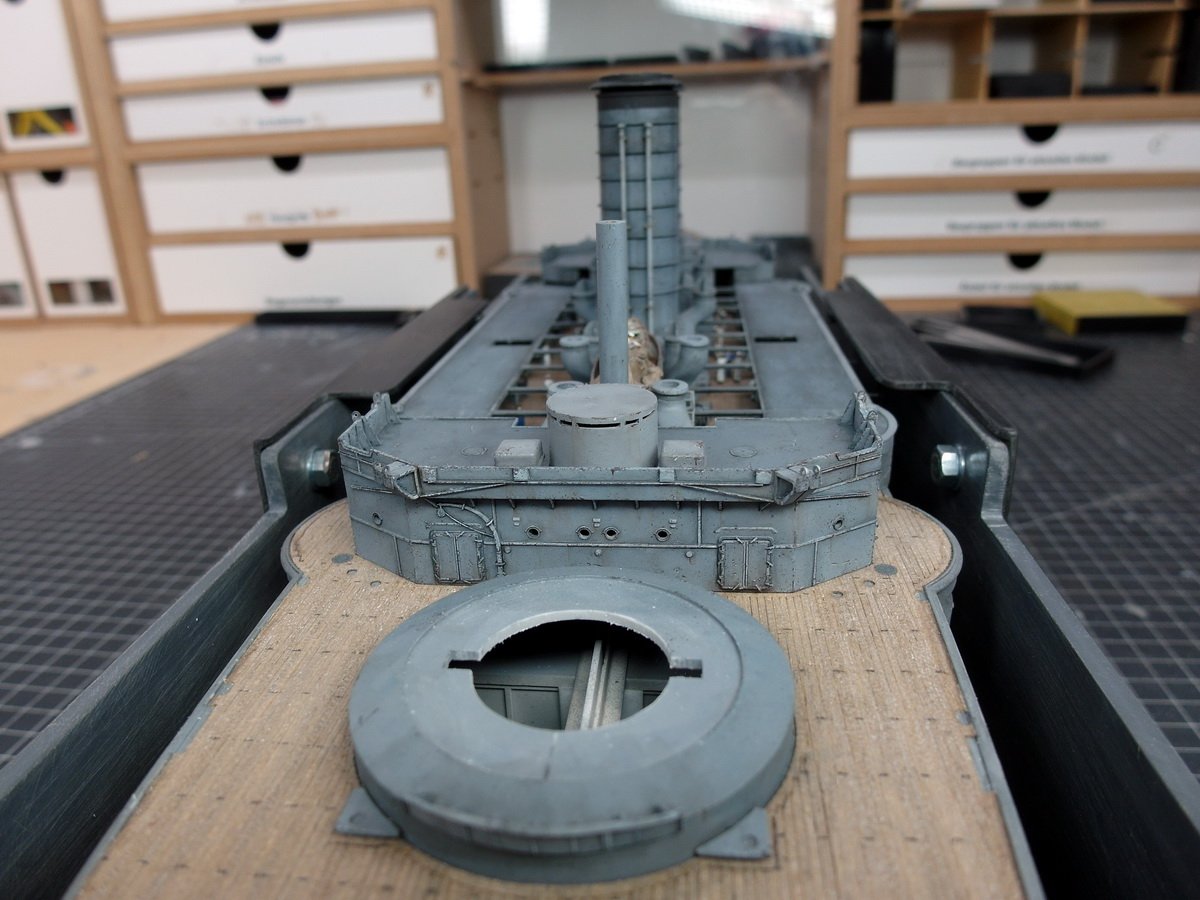 Hello everyone and happy first Advent. I've finally finished installing the tarpaulins on the bridge, completing another delicate task. And here's how it looks now. After consulting with users, the supports on the railing for the sunshade were removed and will be folded up and stored on the deck later. This was likely related to the work being done on the tarpaulin. Since the bridge is roughly finished, I wanted to continue working amidships before attaching it to the Mikasa. So I turned my attention to the three missing lifeboats. And subject them to the usual procedure of painting details and weathering. The first cutter is finished. Micro Master makes truly first-class 3D prints. Painting the rope neatly on the side of the cutter was truly a test of patience. But the middle deck is also slowly filling up. Starboard deck complete.