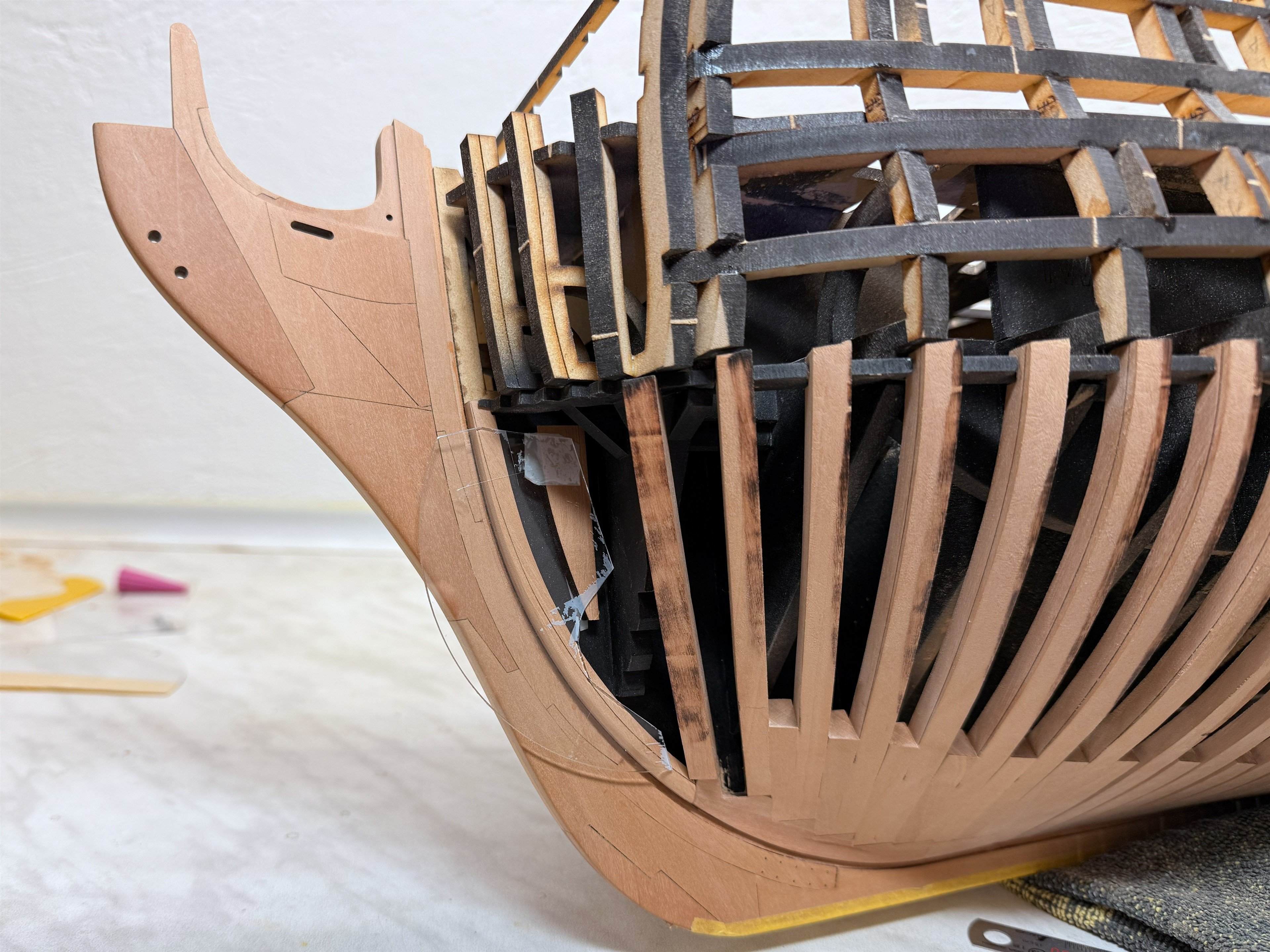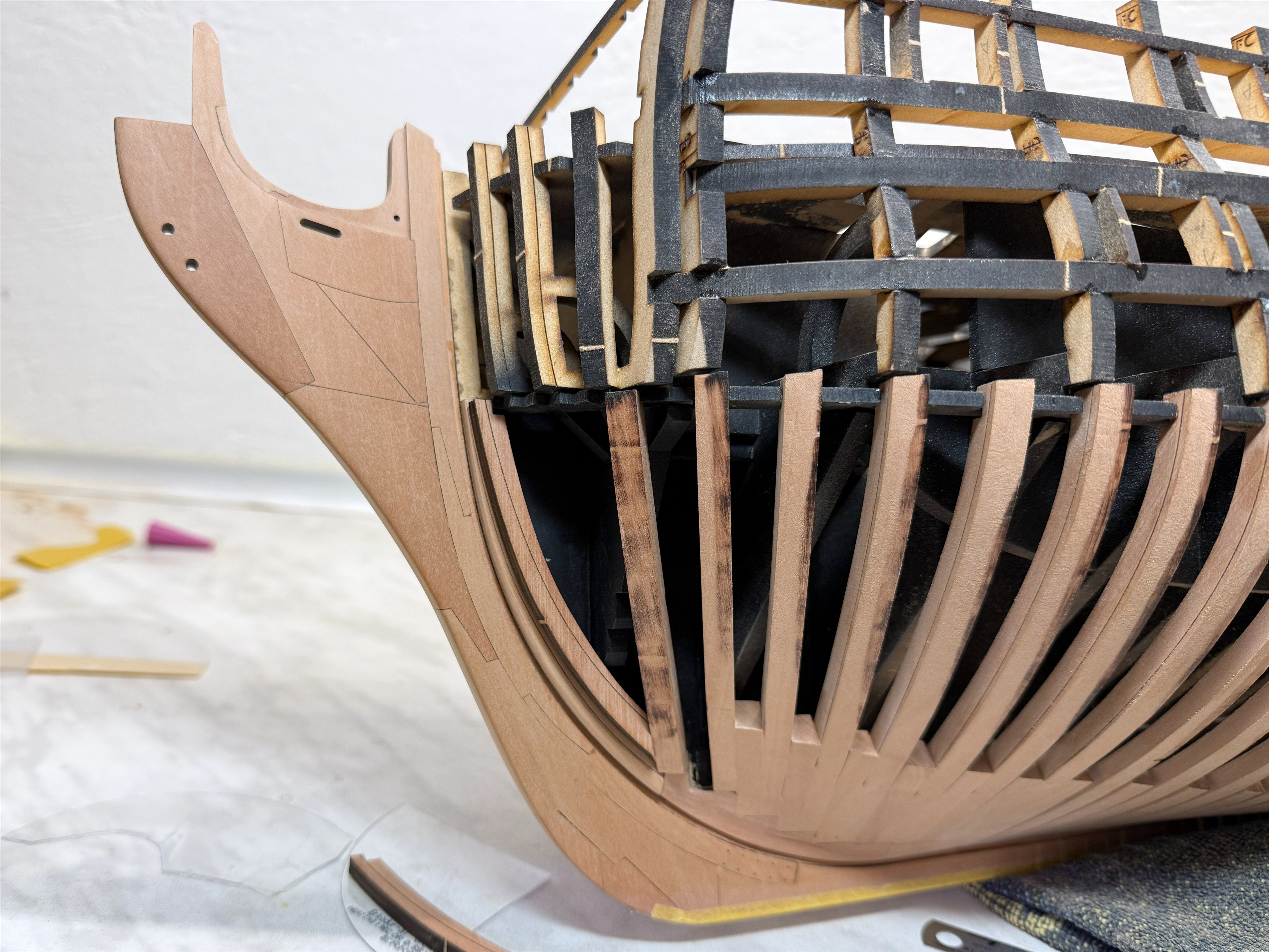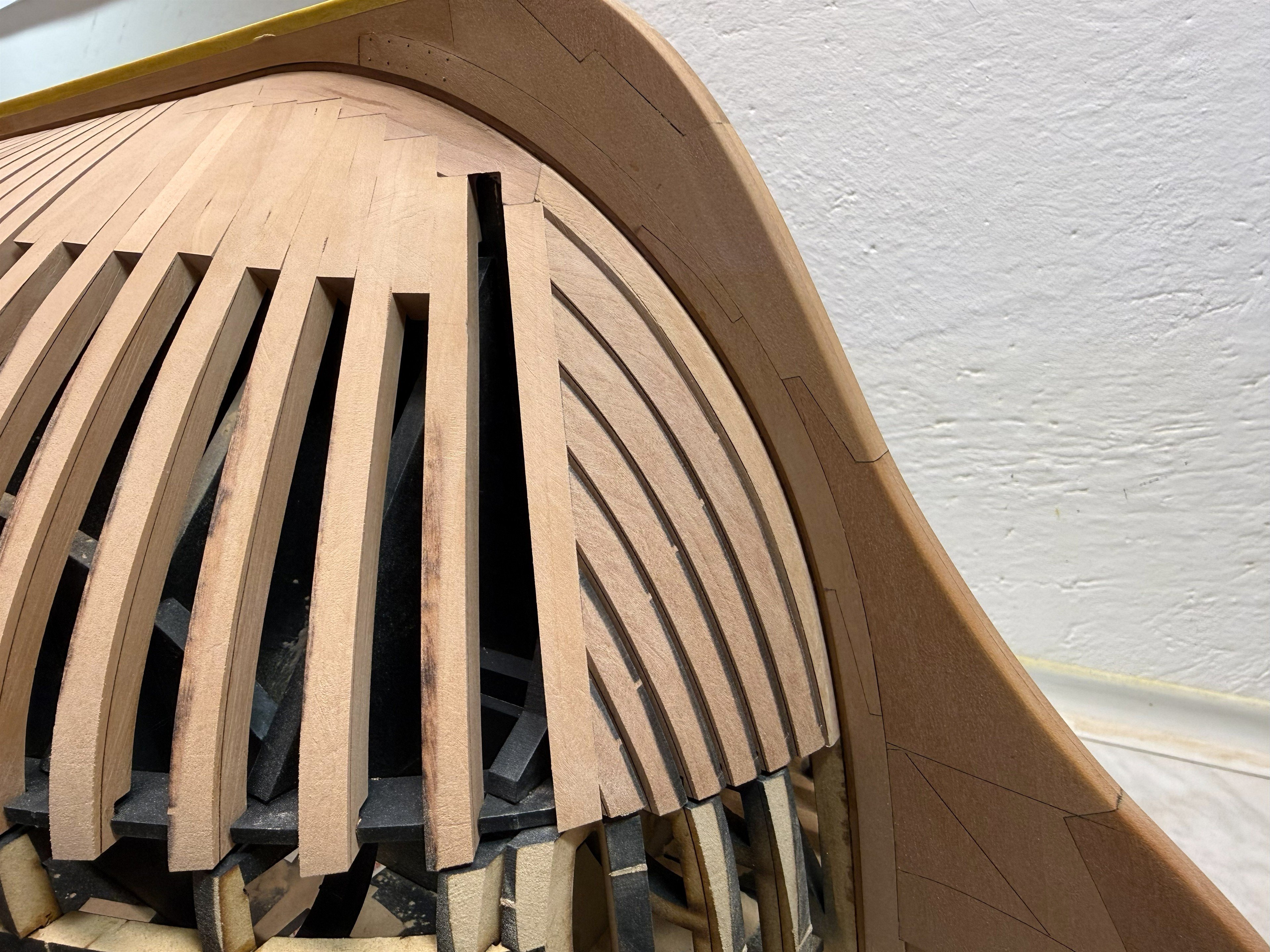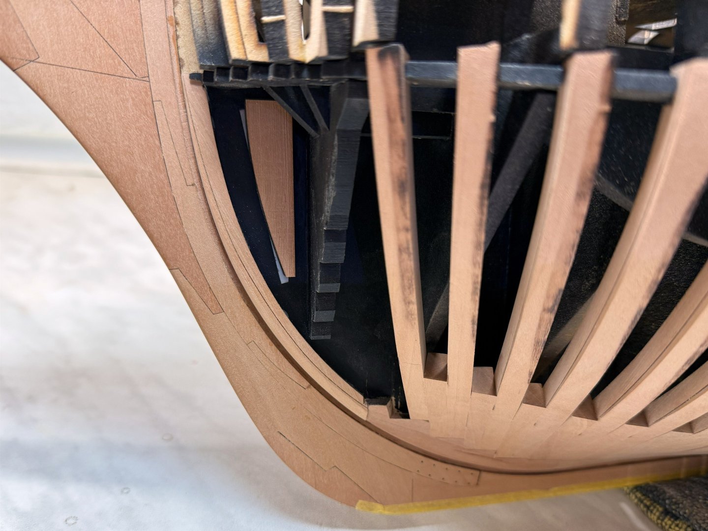 That piece was maybe 3 mm thick but now that I've sanded it down a bit, it's about 2.5 mm wide at frame 8a and gets even thinner towards the front. Wait a bit with the modification, JJ, while I do some more sanding. Then I'll check it, take a photo, and write to you. I'll also send a photo of how much I've adjusted the front step for frame 1a. Now, today's progress. I glued the last one, even though it's actually the cant frame no 1. And then the hawse pieces or bow timbers, which name is correct, or both? During assembly I used 0.8 mm foil and some scrap to support and define the same distance between them. And of course, I couldn't wait because I was curious to see how it looked, so I immediately started sanding. Now, however, the last half frame and the same thing awaits on the starboard side.