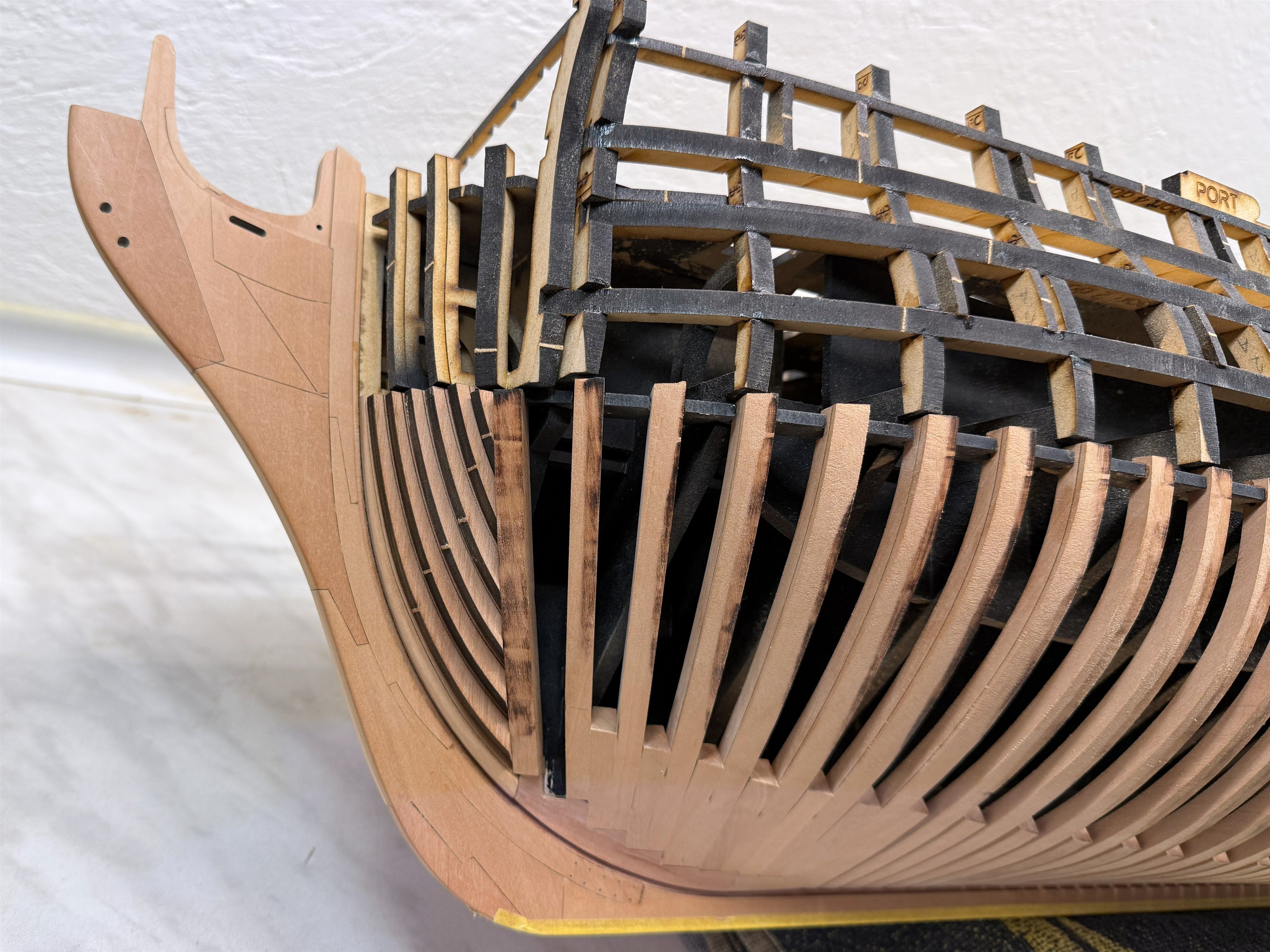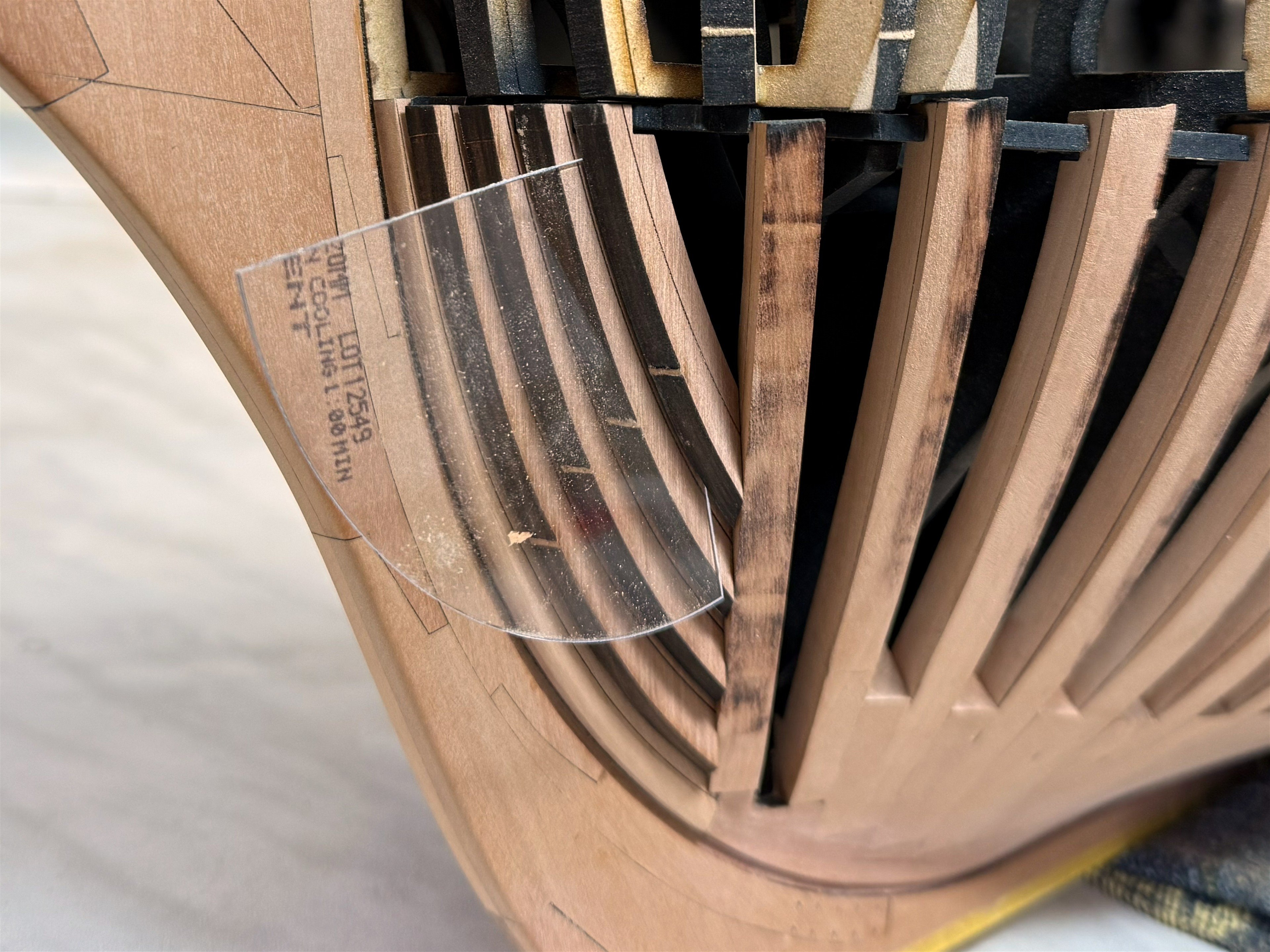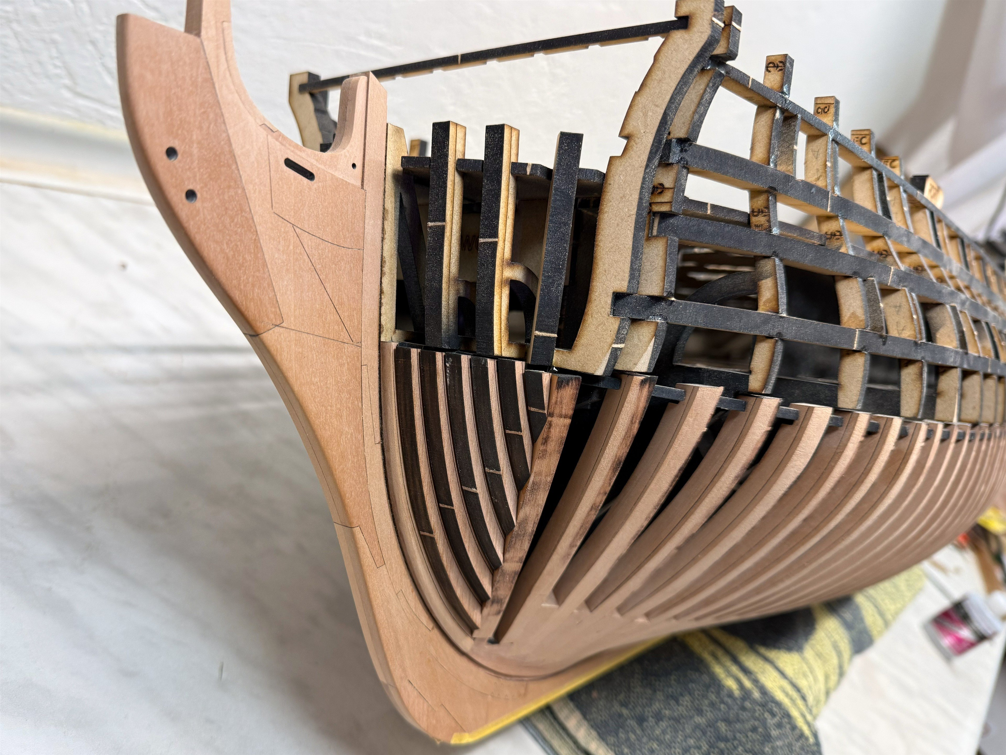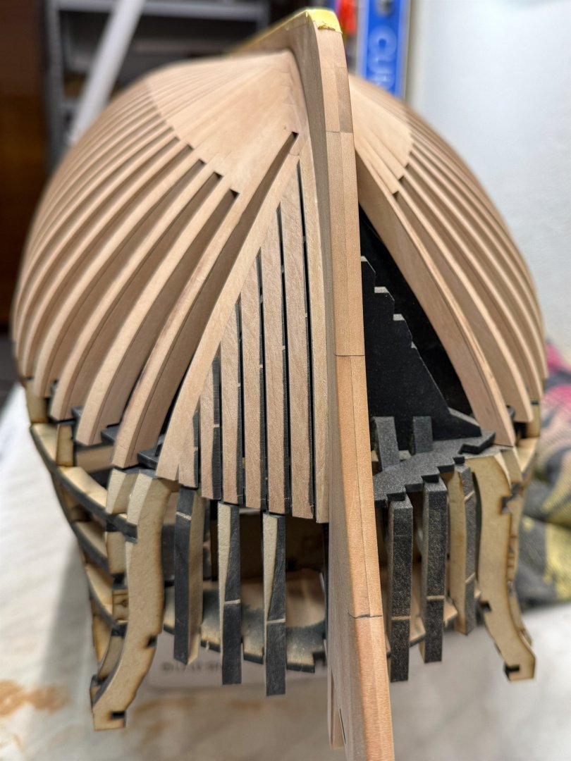 That piece was maybe 3 mm thick but now that I've sanded it down a bit, it's about 2.5 mm wide at frame 8a and gets even thinner towards the front. Wait a bit with the modification, JJ, while I do some more sanding. Then I'll check it, take a photo, and write to you. I'll also send a photo of how much I've adjusted the front step for frame 1a. Now, today's progress. I glued the last one, even though it's actually the cant frame no 1. And then the hawse pieces or bow timbers, which name is correct, or both? During assembly I used 0.8 mm foil and some scrap to support and define the same distance between them. And of course, I couldn't wait because I was curious to see how it looked, so I immediately started sanding. Now, however, the last half frame and the same thing awaits on the starboard side.