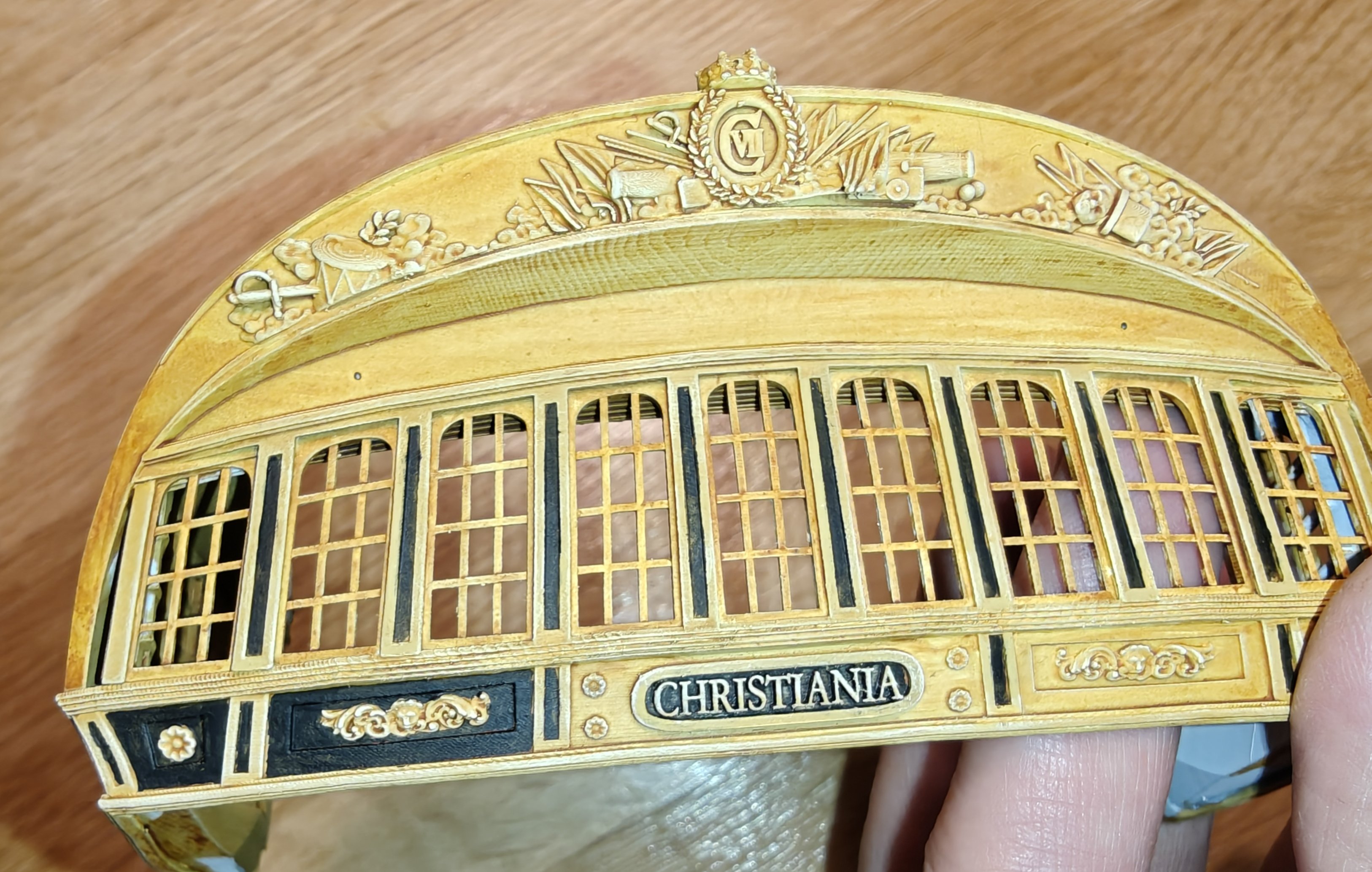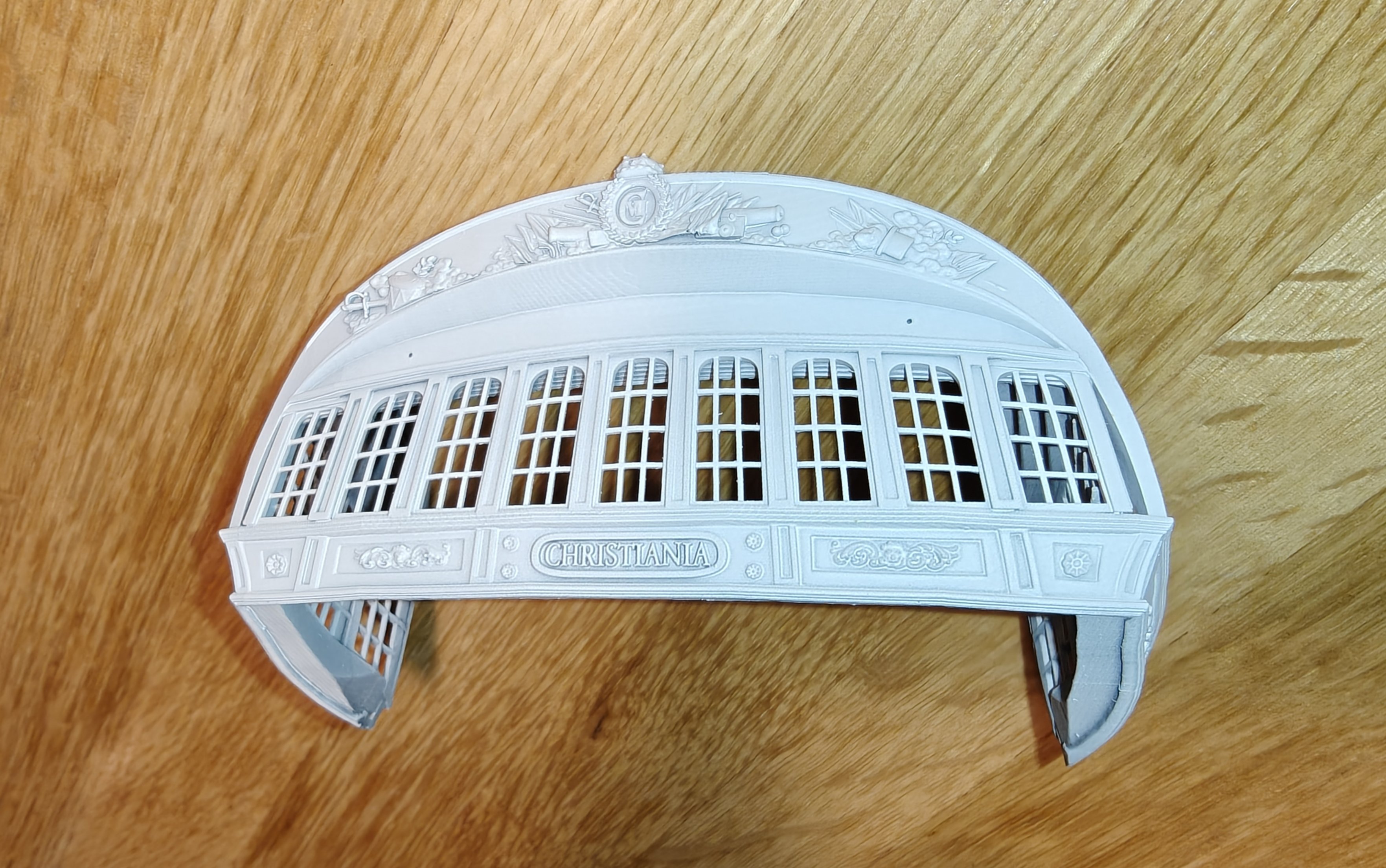 Log entry 29 - test print of stern I have tried to make a model of the stern that include everything in one part: windows, friese, side galleries, etc. I have a bit of issue with the print itself - I think I need to change the release film on the resin vat as I may have a tiny leak with a bit of cured resin underneath that blocks the light. Here is what it looks like: Overall, I am very excited to see this as it really shows what the stern will look like eventually, and I am very happy with how the different parts look. But... The fit is absolutely terrible 😅. Especially around the lower parts of the galleries. And the curvature of the rear window panel is also causing issues as the model is not a great fit there either. What I will try do do is this: re-model the rear window panel with a curvature and remove the lower parts of the galleries and make these separately or in wood to insure a tight fit. It will probably take a few more iterations to get it good enough, but I think I will get there eventually. BR TJM