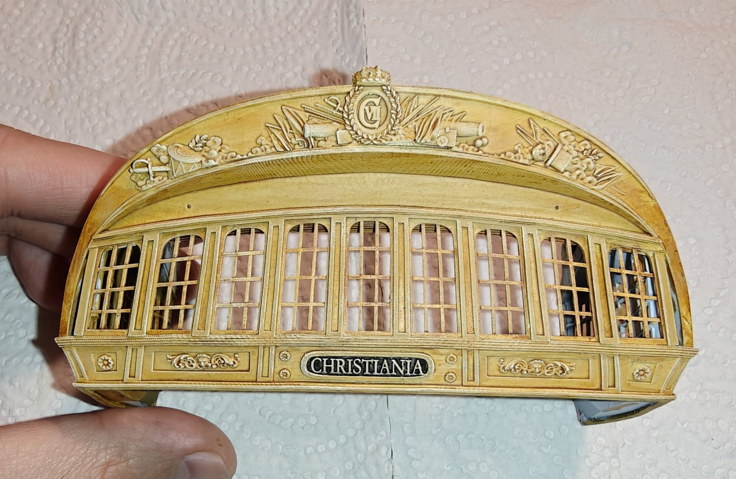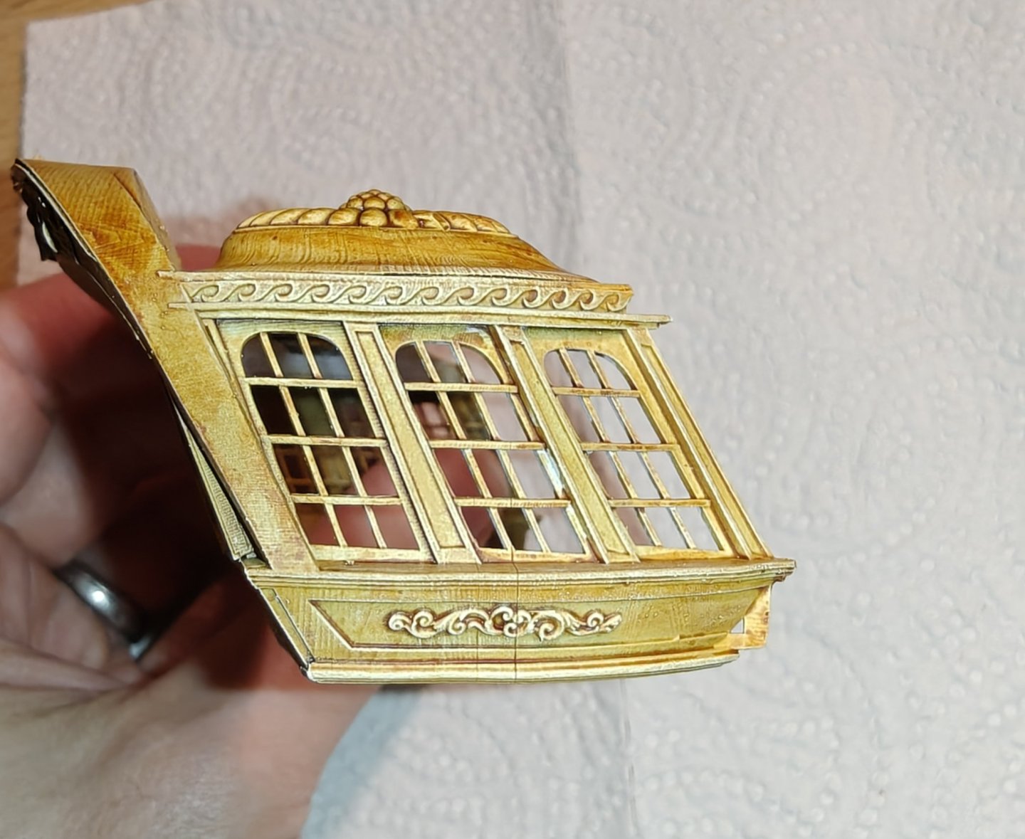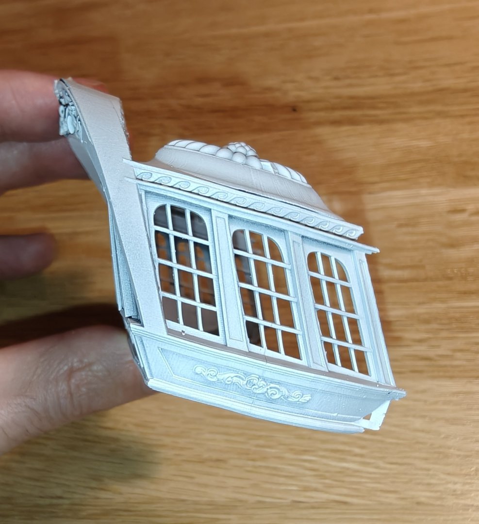 I made the adjustments but it is really hard to see on the photos. The whole window section is now curving and I took the opportunity to add lower stern decorations. These are made with Meshy.ai, see the recent discussion on the 3D modelling sub-forum, and will be the first aI generated elements I use. The fit is much better, but there are still room for improvement. I also have a weird bend at the top of the side galleries, symmetrical on both sides. This is a printing issue, but I am not sure what happened. Something shifted or there is a lack of supports that make the model sag or compress. I also have a lot of support residues on the side galleries, a result from trying to support the bars to prevent bending during printing. But i changed the release film on the resin vat and am getting crisp prints across the build plate again, so that is nice! I have to look into the printing technicalities and also make another small adjustment to the angle of the side galleries to improve the fit further. But it is getting closer 🙂.
