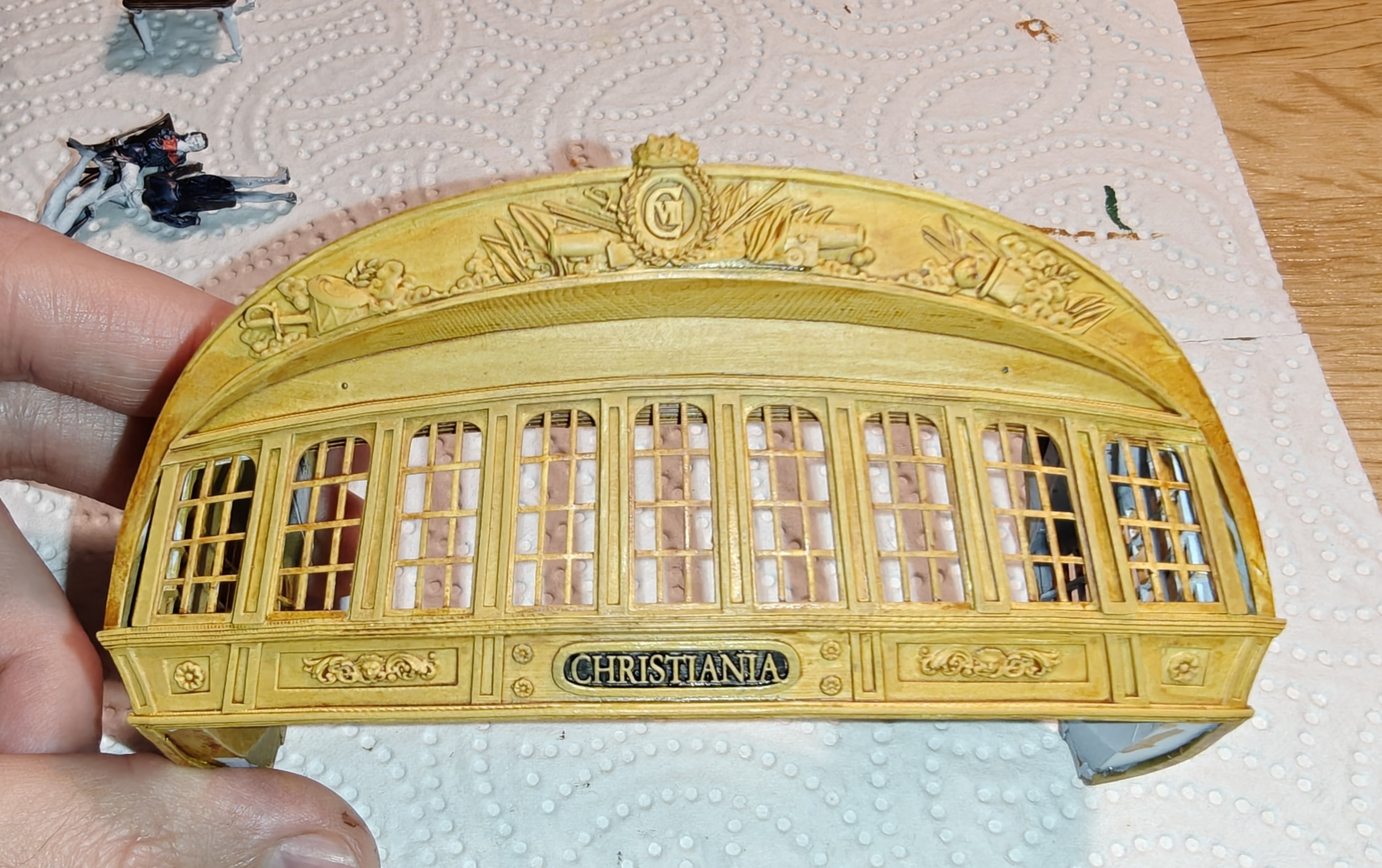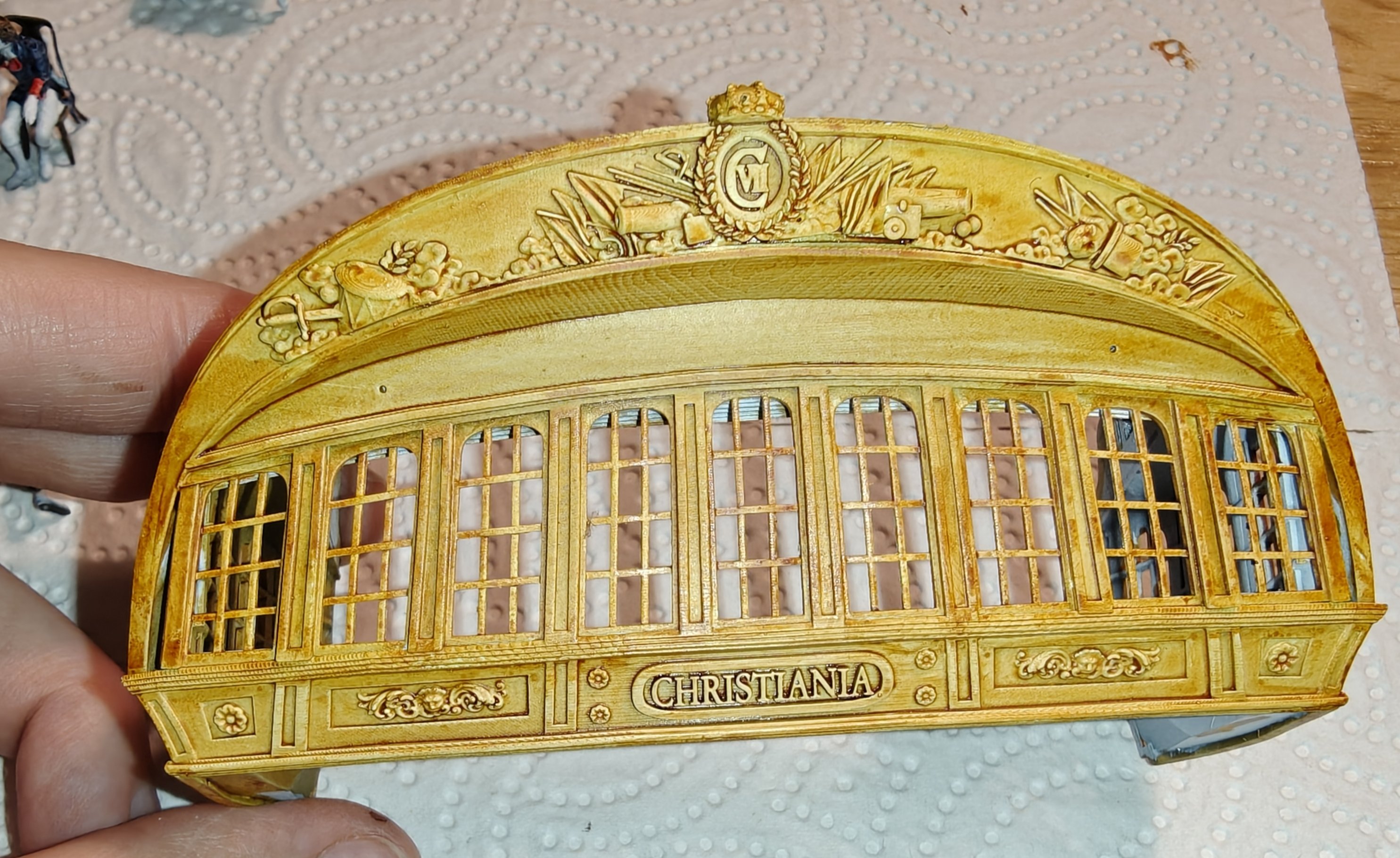 Ok, so I tried the reverse strategy for the painting. It may seem a bit foolish but there was a reason to try this, that I will get to. Here's how it went: The part was base coated, first with black, then with white. I use an airbrush for this. Then I used an Army Painter brown Speedpaint to get a dark yellow base. Speedpaints (like Citadel Contrast paints) are basically heavy pigment acrylic inks that will run into the recesses, but also leave a nice base colour on the raised parts. It is meant to be one coat and done. It looks super blotchy, as it is not so well suited for flat surfaces, but that is ok, it works where the yellow will be, particularly the friese. Next, I went owe the yellow with the ochre, mostly drybrushing: And then topped it off with a drybrush of beige for the highlights: After this I sealed it with an acrylic varnish and let it dry completely (a full day). So far, so good. Now comes the tricky part: tye recessed black parts. I did my best to mask off the yellow: But even then, the black seeped onto the yellow 😭. This was not really unexpected, but I had hoped masking it off would work better. I stopped here, as even if I could go over and clean up the yellow, the black edges are not straight enough and the point of doing it this way disappears if I have to re-do the yellow. So, the reason for trying this way is that drybrushing is very messy, especially when you have large, flat areas of a very different colour around the areas being drybrushed - as I do. Drybrushing the yellow gave a really nice result, the best I have achieved so far, but I can't get the black good enough. It is almost impossible to paint recesses without messing up the higher parts. Oh well. I will go back and do it the traditional way, building up the colours from lowest to highest. That just means I have to extremely precisely paint the yellow parts (of which there are many!) several times as I built up the colours... 😅. After white, yellow is the most difficult colour to get a good finish on. Anyways, back to painting the second version.... BR TJM