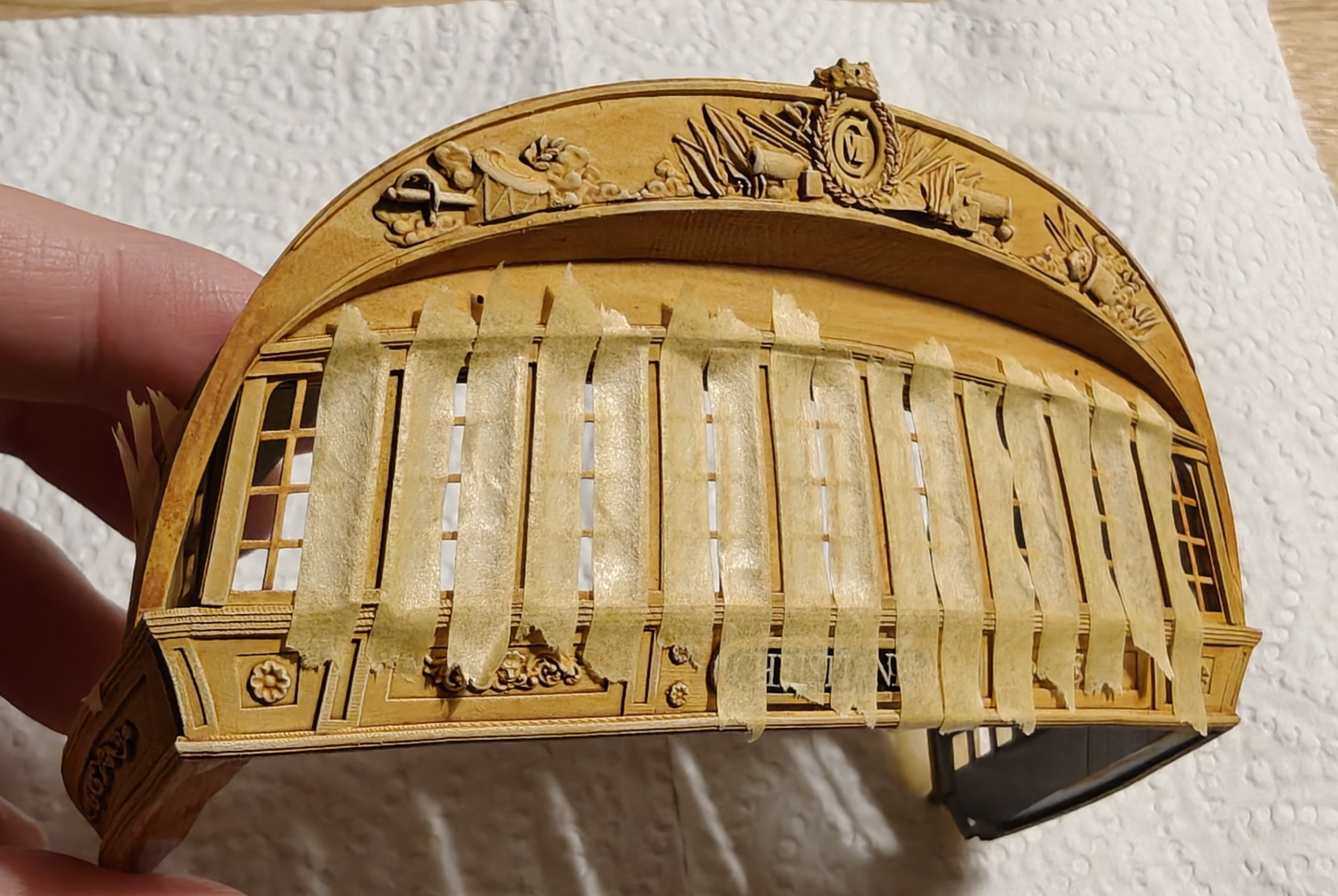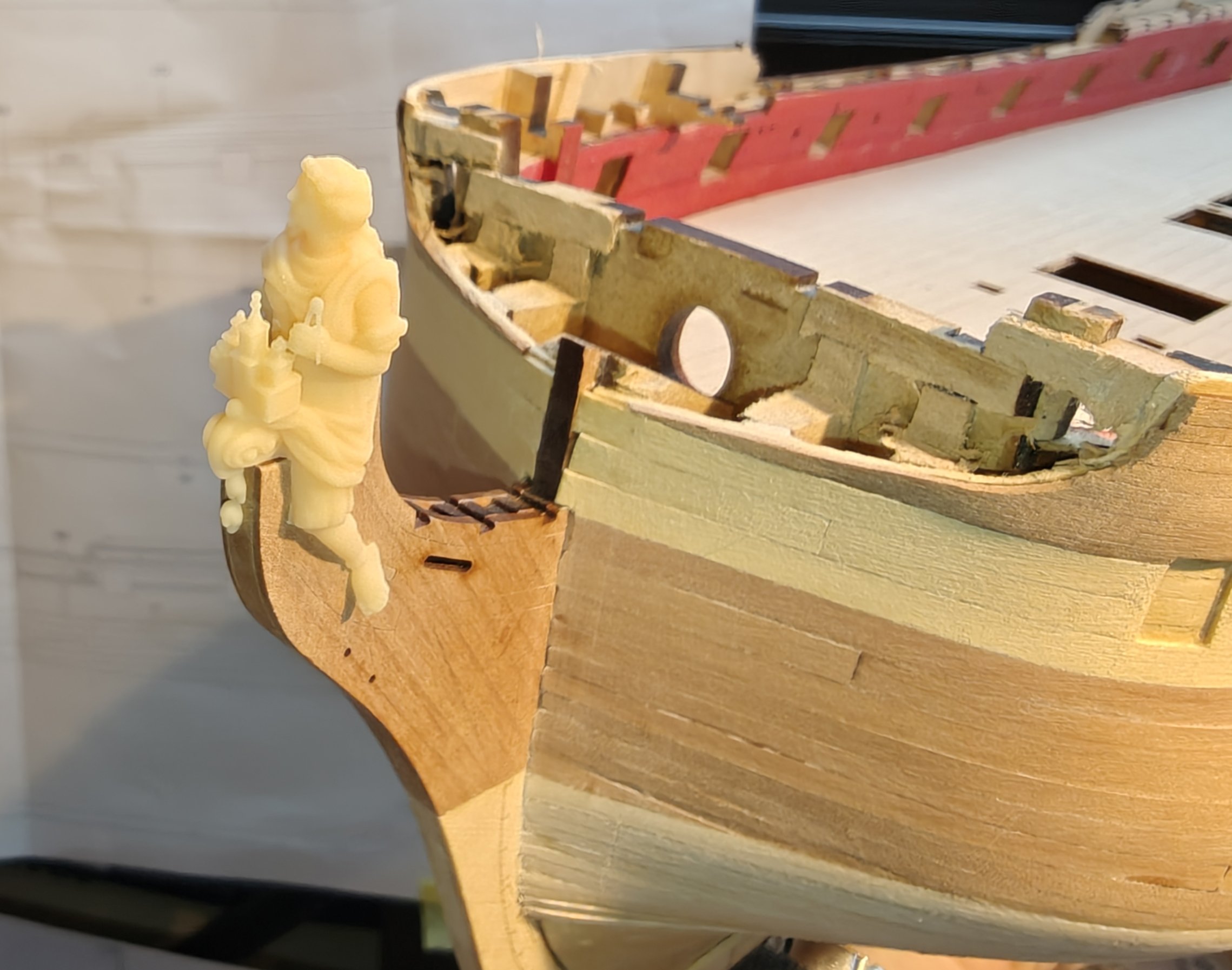 Log entry 30 - final(?) stern version and a colour test After a few quite some iterations, I now have a fit that I am happy with. And I like the design. With an additional plank added below the stern and the lower parts of the side galleries made from wood (that will be a small challenge as well), I think this will be good. I made a colour test from the last version (the one that didn't fit as well as this newest one), as the only things I am 100% settled on is that the windows will be red and the friese and ornaments will be yellow ochre. So I did not aim for a super neat paint job here and have used mostly flat colours with minimal shadows and highlights. This is just to evaluate the colour palette: I am resonably happy. Or, I should say, I like this colour scheme, but I am a bit apprehensive about the prospect of actually trying to make a super neat paint job. It is extremely difficult! And even though I am out of training, I have been doing miniature painting for over 25 years and this is really some of the most difficult I have tried. The print is so crisp and nice and I feel I butcher all that lovely detail with globs of paint! Organic shapes are much easier to paint than flat surfaces or straight lines! This test took me at least 4-5 hours to paint, and I will have to go much slower, with more, thinner layers for the final version. I am considering if I should try a contrast paint method, basically a wash method, to get the basics colours in and then do a single pass of main colour and highlights for the yellow. I could perhaps also mask off and airbrush the red in after the initial wash. Or I could airbrush it all yellow, mask off and do the red and then add the black after. Hmmm, I will think about this while I continue with the planking .... BR TJM