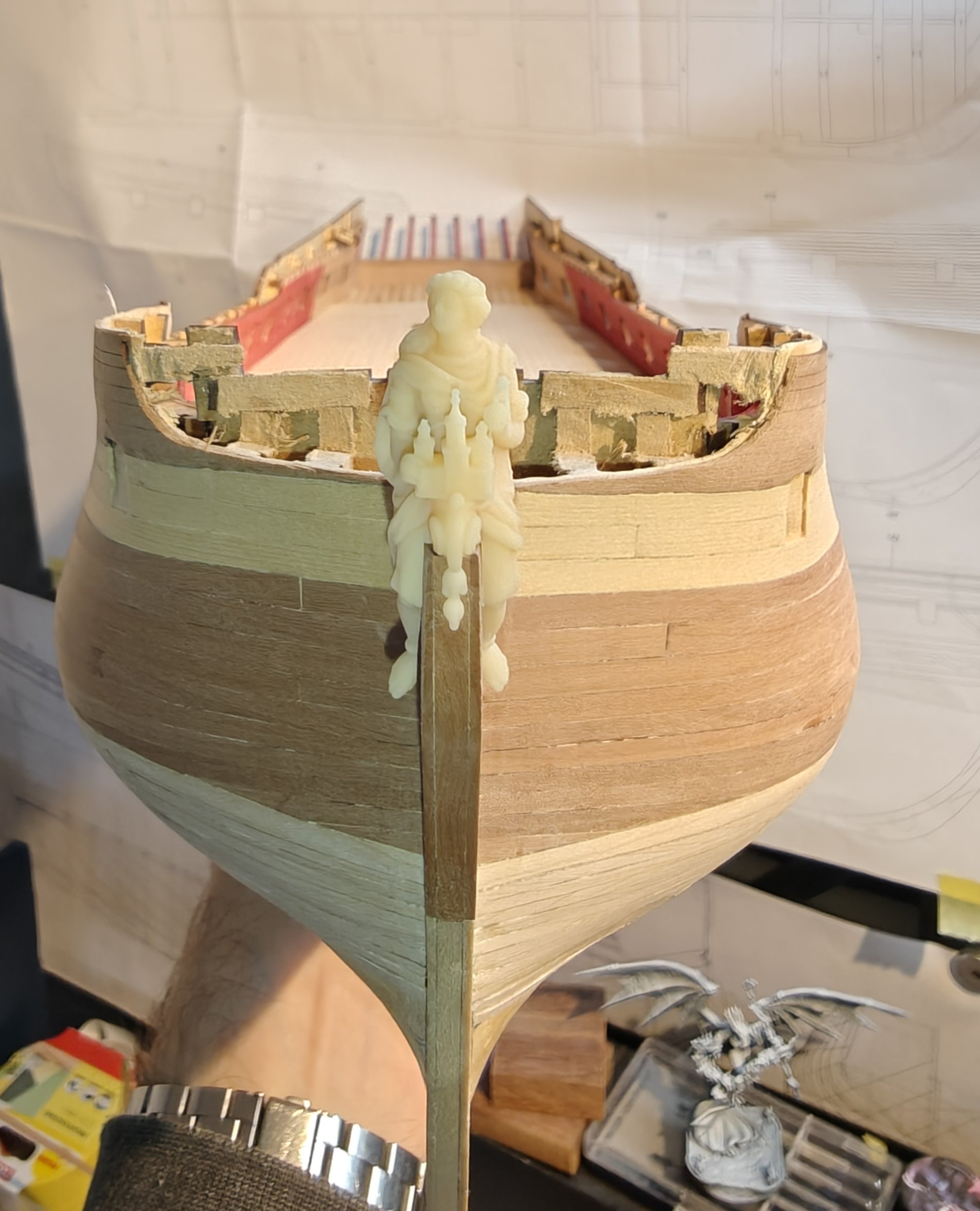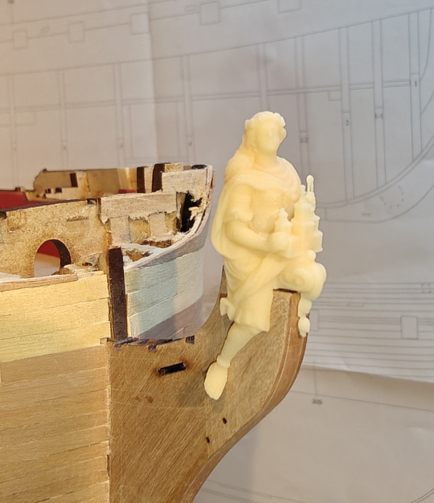 Log entry 31 - a new figurehead A while back, I made a figurehead for Christiania using Hero Forge. I was quite happy with it, as the pose and motif was faithful, though the details were somewhat different to the original. But now, as can be seen in Chucks recent post in the 3D modelling sub-forum, Meshy AI has become really good at making a 3D model from just one image. So I had to try to re-do the figurehead with this new tool. Here's the cleaned up image I fed to Meshy: Here i have removed headworks and the other details on the keel. I have taken this photo myself at Krigsmuseet in Copenhagen where the model of the figurehead is displayed. Meshy gives you 5 runs/tries when you submit a task. I submitted twice, and used 7-8 runs to get the version I went with. They were all very good, but I needed a version with space for the keel between the legs and with no weird stuff in the left hand. The Meshy models look great and can be printed as is, however I need a slot for the prow and it is really a pain to get a single solid with no topological issues. but after a few hours of trial and error, I managed. Here's a comparison of my Hero Forge figurehead and the new Meshy one: Honestly, the Meshy one is much better, as the style is correct. It is very close to the original model at the museum. Btw, I did the callipers myself, the AI could not get that right from that angle. Here's printed comparisons: I know there is a bit of a size difference here as well, but you can clearly see that the pose is also much better and more natural in the Meshy version. Finally here's some shots of the figurehead on the model - the fit is great and I have just 0.5 mm of filing on the prow to make it perfect. I am super happy about this upgrade to the figurehead! BR TJM