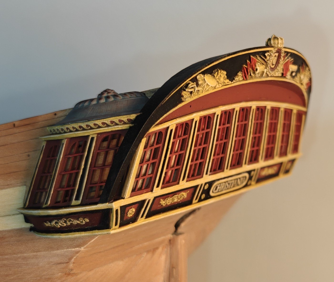 Ørnen, Royal Yacht of Christian VII I have been away from home and with no workshop, and have therefore been adapting some more historical plans. This time I am looking at a small Royal Yacht called 'Ørnen' (the Eagle). It is a curious little vessel entirely geared towards ensuring the comfort of the monarch. It is basically a large suite with two bedrooms (labelled king's and queen's, respectively) and a living room. Midships there is a finely decorated dining hall and at the bow a kitchen with two stoves. Armament consists og 26 4 pound 'houbitzers' that seems to be essentially small swivel mounted carronades. Good for defence! Here are a few of the many original drawings: The dining hall is an interesting feature to model, and in general it would be fun to model the interior of the ship to a reasonably high level. Here are the lase cut sheets I made: Mostly 3 mm MDF and then a little 2 mm and 1 mm ply. Most of these thinner pieces I would do in pear if I was to continue with this model (I would like to, but that will be in the distant future, if ever...), but the ply is fine for checking if it works. And here are a some photos of the puzzle fitted together (very little glue for now, just at the stern and bow): And a few with the test cardboard bulwark patterns: It is a small ship, 45 cm at 1:64. Here it is on top of Bornholm from the last post: I am a bit torn on whether I like the ship due to it's curiosities or if I think it is a little ugly with that dining room protruding in the middle. But it has nice enough hull lines, and is a bit of an unicum. But now that I am back home, having spent an evening cutting this, I will get back to planking of Christiania 😁. BR TJM
