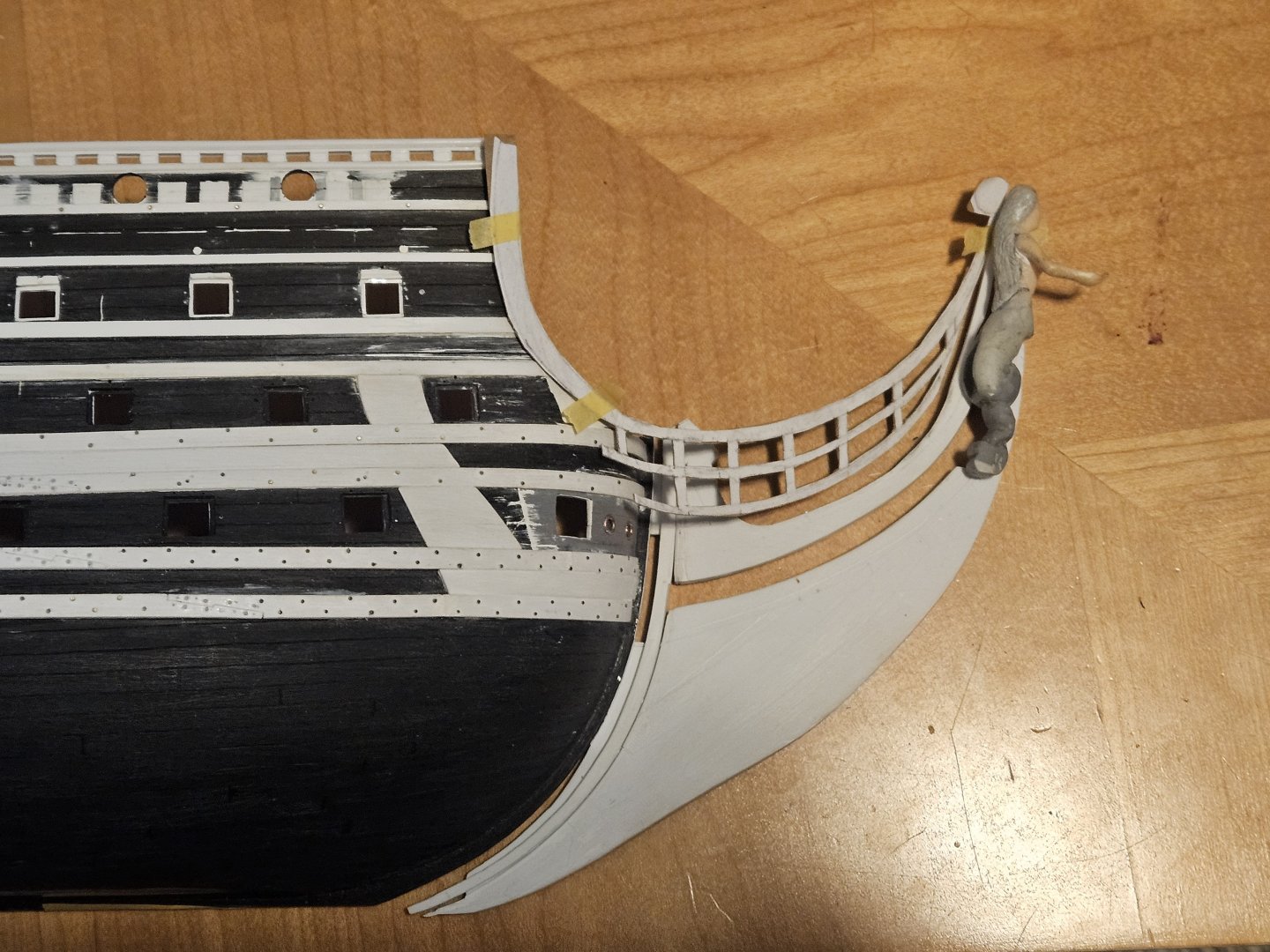 Well... I have made a slight change in my scope.... I went from this... To this, by ripping off all of my timberheads and railings and mouldings....why?!?! One reason was that I made the timberheads a year ago... and my skills have continued to improve. The other day, I noticed the glue smears and the framing of the timberheads, which weren't uniformly crisp and clean, and decided... I can do better. So the timberheads were ripped off like a Band-Aid. And that also allowed me me to look with a very critical eye at the various little imperfections that I had "let go" when I proceeded on with the timberheads last year... for example, plank lines, and other tiny items that now bugged me. Stripping away the timberheads allowed me to focus on the entire hull, which was now a blank canvas again. But... a primary reason is that I didn't anticipate the offerings that I would get from SKUTZNIK (Kris in Poland). I first saw what Kris and his team could do with the cannon they made for NMBROOK and his Soleil Royal, and ordered a full set of cannon from him... I am very happy with the cannon, and that opened my mind to other possibilities from Skutznik, possibilities that I didn't plan for as I didn't know the existed. 1) Gun port decorations... it will be so much easier if I carve inlets in the mouldings in advance, especially for the circular wreaths. 2) Gun tackle bolts/wedges... I have made jigs for the various gun port sizes to drill holes, so that I can insert the gun bolts after painting. I know that I have to make and use jigs whenever possible, so that I get uniform results. Note that a few of the prior holes (lower left bolt) are slightly too big, so I have to fill them in. 3) Dolphin ornaments for the upper gun deck ports... yup, I painstakingly carved two dolphin masters that I was happy with, and then cast 60 resin pieces. However, I was always bother by the thought.. "how will I glue each of 60 pieces into the same, precise position every time... without making a mess of glue smears and paint?". As I have said many times before, I need a jig whenever possible... so, could Kris make my dolphin pieces on a 3D resin printer and have mounting pegs moulded in? If Kris could do that, my results would be some much more precise and cleaner, needing just a dab of glue in each hole, then insert dolphin. Would that be possible?? Of course it was possible with Kris! 4) Royal poop deck/poop deck rail scrollwork... looking at the St. Phillipe monoograph, I envied the scroll work on the rail, whereas at that portion of the deck, I had a solid rail, in effect, a low wall. I don't know how yet, but I will create the scrollwork seen in the monograph. It may sound crazy, but stripping off the timberheads and railing has allowed me to "start over", and make use of my improved skills, but also the exceptional 3D resin work from Skutznik.