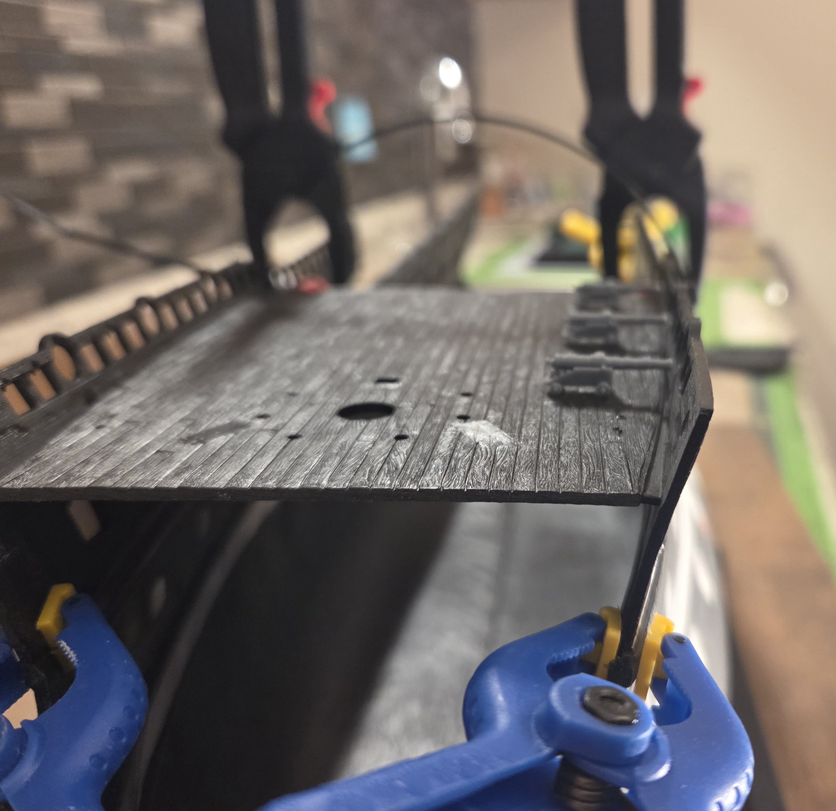 Ian, thank you for the comments, and, when I display SR 1671 down the road, I am definitely thinking of a waterline display. When I changed the sweep of the wales I started with the lower most wale and lowered it several millimeters, so that the middle (and lowest) part of the wale would dipping into the water. Even with that, I think I still would set the hull into a base to make a "waterline display"... I have no idea yet if I would make a realistic wave panorama like Marc LaGuardia plans to do. I thought initially about sawing off the lower section like Marc did, but... twobyears ago that was way behind my skill set! Theoretically I could do it now, but... talk about opening a can of worms!