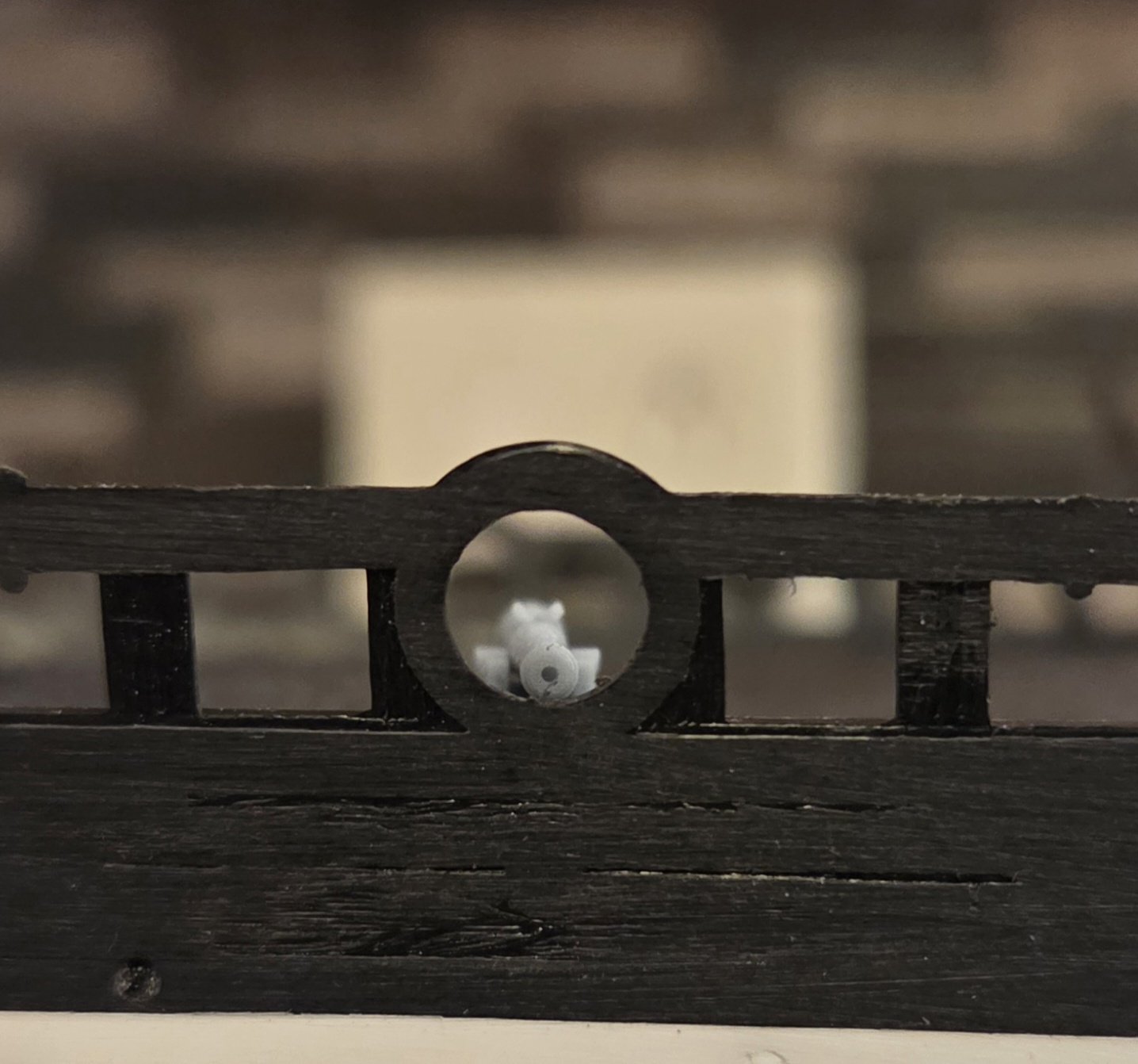 I managed to install the forecastle deck and lay on the 6# cannon, as the cannon and carriages from Kris (Skutznik in Poland) have a lower profile than the kit cannon/carriages. The cannon bore is approximately 3mm lower, as you can see. I now have a very good idea on the ultimate timberhead/caprail height, and can do most of the work on the bulwarks before I affix them to the hulls.. obviously this also applies to the quarterdeck as well.