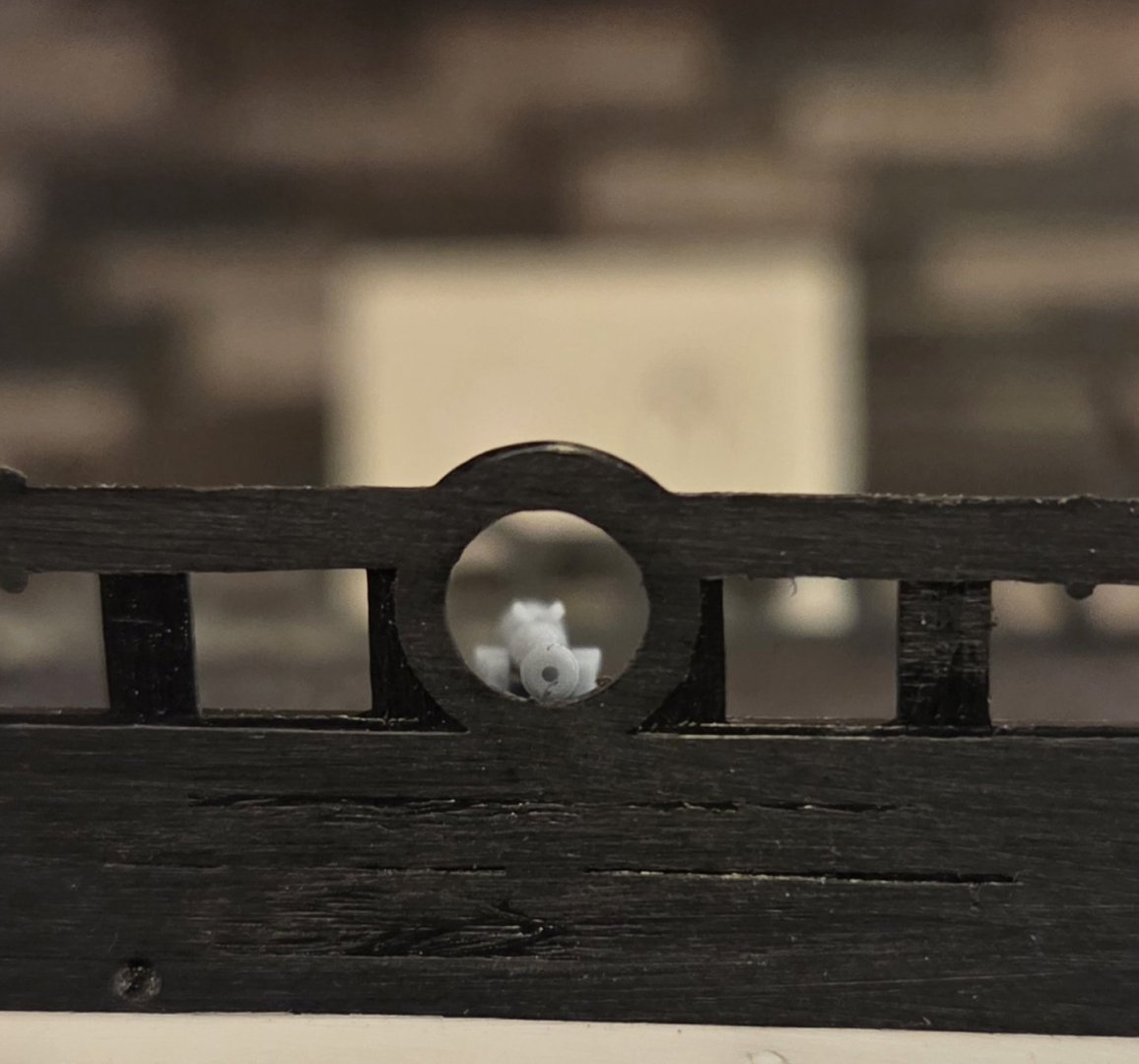 The wales on the port hull are almost sanded flush.... WAIT! didn't I already post this in May, 2024?? But this happened on Tuesday. I heard a "pop", and then the bulwark felt wobbly (starboard hull, where the front bulwark joins the hull in a several inch long area at the waist). I peeled off the planks and found this crack. The bulwark was always going to be the Achilles heel for this model. Many modelers report some difficulty in aligning the bulwarks - especially the front pieces - on the little bitty rabbet on the hull. And due to me sanding off the wales, I had a very thin area on the bottom of the bulwarks to glue to the hull. I used liberal amounts of Apoxie Sculpt, and glue tabs in areas where they couldn't be seen. THe joint seemed robust enough... until Tuesday. I tried several times to glue and Apoxie Sculpt the bulwark back in place, but the joint was clearly too tenous to risk... I could only imagine doing the rigging down the road when this would break again. Fortunately, I picked up a spare hull on Ebay last year, for all of $29.... I thought about it overnight, and then started sanding the wales yesterday morning. The good news is that I have all of my measurements, all of my jigs.. the work I did on the head and the new beakhead bulkhead will just slip into placde on this new hull. Honestly, I won't be doing any "experimenting" on this new hull.. I just have to follow the plan and measurements that got me to this point. Speaking of measurements... I would appreciate any advice/opinions on the following matter.. guns and gun carriages! You might recall I purchased a full set of cannons, and many gun carriages, from Kris/Skutznik in Poland. I first saw what Kris could do when he supplied the cannons/carriages for Nigel (NMBROOK) on his SR build at 1/48. Kris scaled the parts down for me to 1/96. In the next photo in the center, you can see a 12# cannon from Kris on the left facing off against a kit 12# cannon... to the left is a 6# cannon, and then a 4# cannon on the far left. In general, the cannons from Kris are a little beefier and more robust. I have a full set of cannon, but not of the carriages; I planned on using the kit carriages for the 36# and 24# cannon on the lower and middle gun decks (where the carriages won't be seen). Note how the carriages from Kris are lower in profile than the kit carriage (this lower profile seems visually correct to me); this places the center of the bore several millimeters lower on the Kris cannon compared to the kit cannon, which changes the height of all of the fo'c's'le, quarter deck, and poop deck gun ports. Not a big deal, I already have the measurements that I need for the gun ports, but.. does this seem accurate to everyone else, i.e. the carriages from Kris compared to the kit carriages (remember, these are the same parts that Nigel ordered several years ago for his build) Finally, I have a question on gun port spacing. Following the Rule Of The Cannon Ball Diameter, not a screenshot from my Excel spreadsheet that contains all of my measurements. Note the blue column is the predicted gun port measurements and spacing, while the green column is the kit spacing. The lower and middle gun deck spacimgs are close enough - calculated vs kit. But they start to diverge as we move up the deck to smaller cannon. For example, the 6# cannon on the fo'c's'le and quarter decks should be 22.2mm apart... whereas the kit spacing is 35mm. Now, SR 1671 - per Guy and his treatise - had 5 cannon on the quarterdeck... spacing them 22.2mm apart (instead of 35mm) would leave a lot of room, BUT... per Guy, SR 1671 was SUPPOSED to have 7 cannon on the quarterdeck, but two cannon were removed in the construction process to add one more 12# cannon on the upper gun deck. So on the quarterdeck, spacing seven cannon 35mm apart.. there wouldn't be enough room! There would be plenty of room at 22,2mm spacing. Also, the tiny "toy" 4# cannon on the poop deck would be spaced 19mm apart... I currently have them (correction - HAD) spaced 24mm, and that means I have to move the royal poop deck bulkhead, as Marc LaGuardia detailed in his blog. BUT... if the spacing is actually accurate at 19mm, all of a sudden there is a lot more room for two cannon on the poop deck and maybe the royal poop deck bulkhead has to be moved less than 10mm, and maybe not at all? Does this make sense to the far more experienced builders out there?