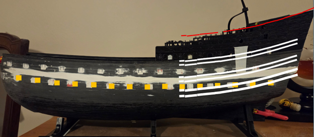 I scanned in my front port bulwark piece and played around in Word. Of course, this is nowhere near as precise as a CAD system... but it is what I have! I can create timberheads, gun ports, etc. to the precise size that I need and lay them on the scanned image. I now have a very, very close approximation of how things will look. On my SR 1671 #1, I filled in between the kit timberheads and then added new timberheads/railing on top. Tthis raised the entire side of the ship by 5mm and greatly contributed to a castle-like appearance at the foredeck, and the various aft decks... which was NOT optimal. At the foredeck, I will be able to use my framed timberheads and cap rail and still have the very same railing height of the kit! The reason is because the circular gun ports were downsized from 6.7mm to 6.0mm in diameter, and also lowered 3.0mm to center the cannon bore in the gun port. The yellow line is a drift rail... the run is not perfect, but good enough to show that if I increase the timberheads at the waist from my standard 2.5mm height to 5.0mm in height, I can continue a seamless drift rail run aft. I have seen drawings where these waist timberheads are clearly taller, and I assume this was also done merely to support a seamless run of rail. Again, I will be maintaing the exact height profile of the kit. I also layed in the circular holes at the waist that were used - I assume - to jab pikes or fire guns through to discourage boarding. Finally, I also laid in the Upper Gun deck gun ports. they are the size that I want and are 2.5mm lower than the kit height. The spacing that I show may not be the spacing that I use. The kit UD gun port spacing is 35mm.... that is a solid 10mm more spacing than suggested for this size of cannon, but I assume that the kit must use that 35mm spacing to maintain the staggered, quincunx pattern of the various gun decks. By adding a 16th gun port at the lower deck, I know that the quincunx pattern will change my middle deck/upper deck gun port spacing compared to the kit, but I don't need to worry about that yet. it took me about one hour to draw this, so on to the rear bulwark...