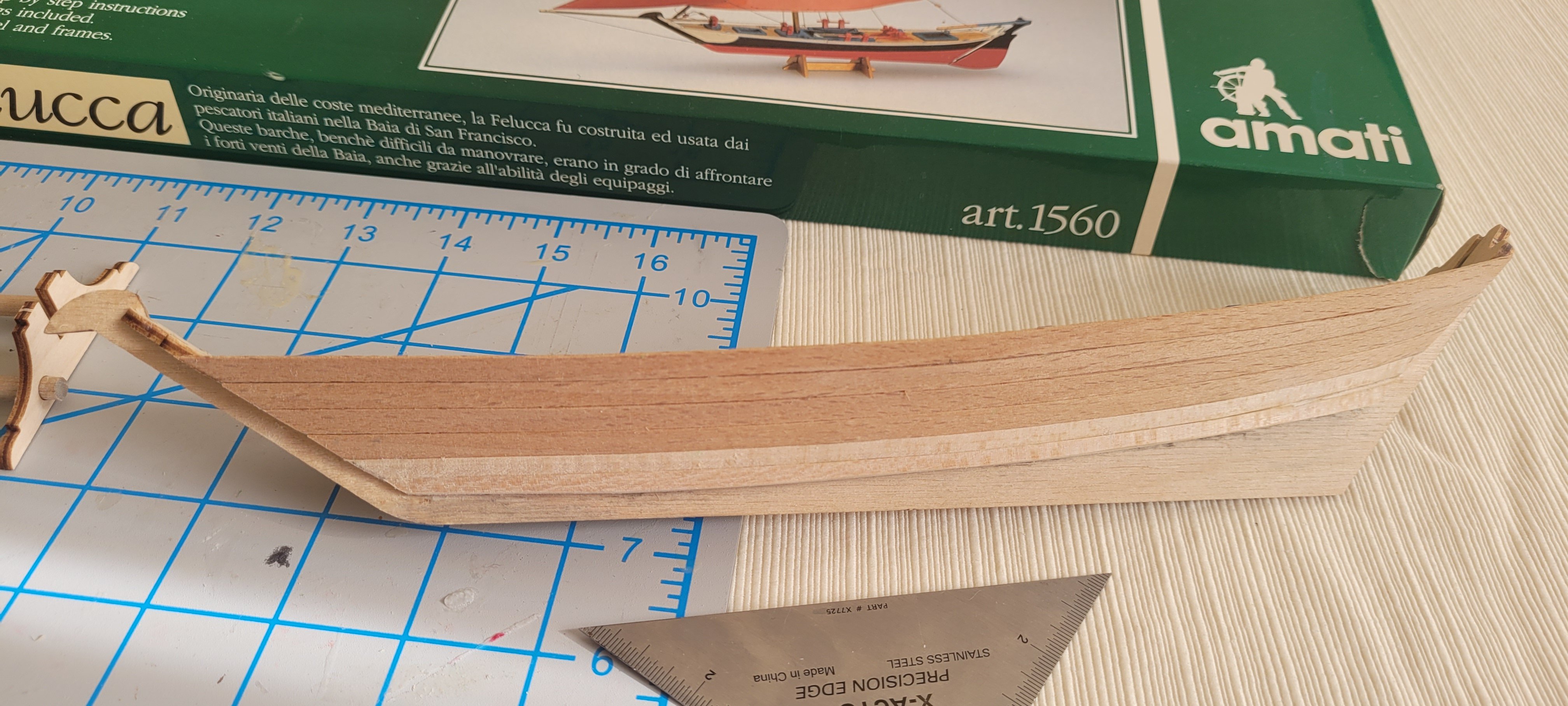 1. Hello all, This is my first post. I'm currently building the Amati felucca and had a question about the shape of the bow. The bow has a flat "face" (for lack of a better term)- see attached pictures. I've looked around the Internet and could not find any pictures of a felucca with a similarly shaped bow. Do you know if this bow shape is actually used on real ships or is it fictional and/or suited towards novice builders? As an introduction, this is my 2nd wooden ship kit (and my first planked kit), so I definitely consider myself a novice. My first wooden kit was the Mini-Mamoli Evergreen (for which I used MSW quite a bit to figure out the rigging). I'm a transplant from styrene plastic airplane kits. Thanks in advance. John