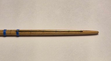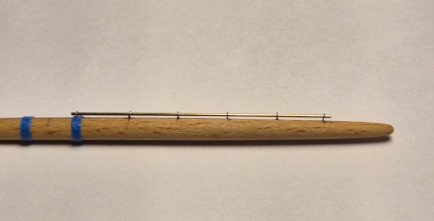 Progress has been slow and sporadic, but here's my latest bit of work. I wasn't sure if I wanted to include jackstays on the yards, or how hard it would be to make them, so I constructed a test yard (the size of the royal) with jackstays. The spacing of the supports is about double what the scale would dictate, but I can live with the variation. The jackstay is made from 0.50 mm (0.020 in) brass rod, and the support eyes are made from 32 gauge stainless steel wire (using the "twist around a post" method). The photos show two views of half of the yard (total length is 4 3/8"). The blue bands are on either side of center, and will also be the position of the eyes for the metal blocks for the clew lines (on the bottom of the yard). Nothing is glued or painted for this test. With the addition of the other attachment points, the entire yard, including the jackstay, will be painted CG spar color, with the yardarm painted white. I'm happy with the results, although the fabrication was tedious, especially making the eyes for the supports, and drilling the holes for the eyes. That's all for now. Lee