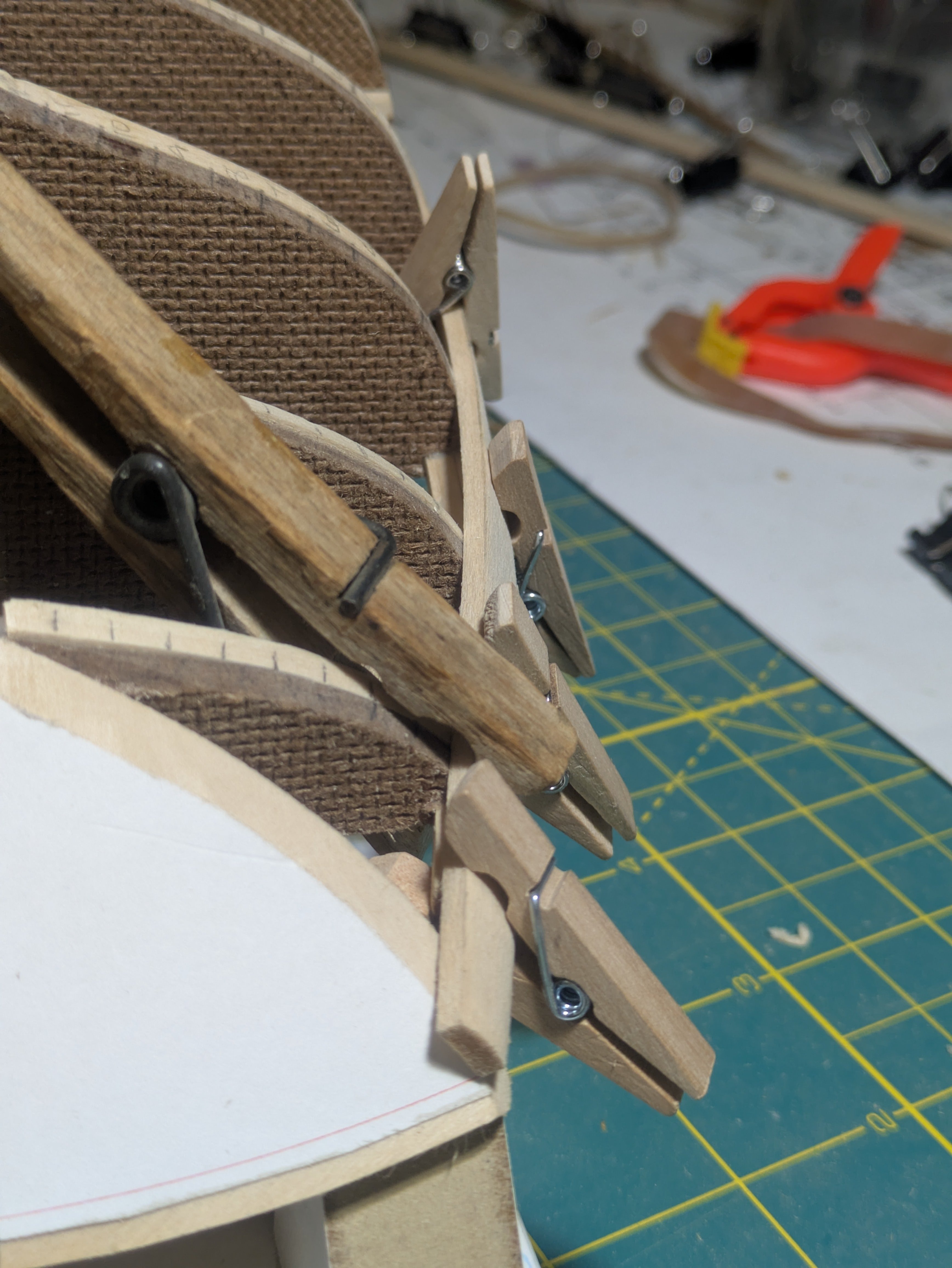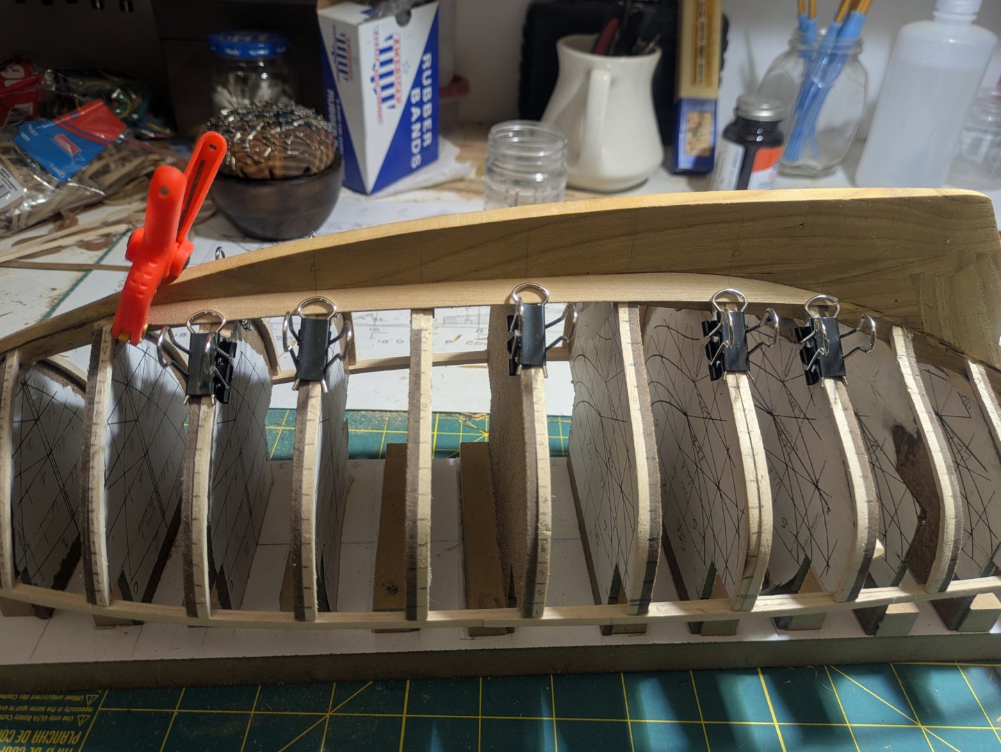 I tried to get the molds to stand vertical but carefully making them but I had to resort to shimming with a piece of paper under the back half of the mountings. I cut some basswood strips and and soaked them in a glass of water that I boiled in a microwave. I am forming the boxwood on the edge of the molds for added support for the planking.