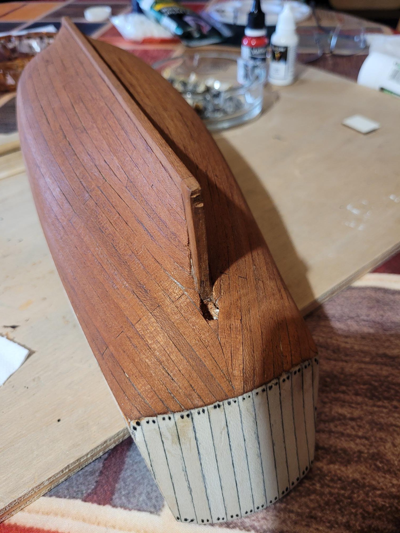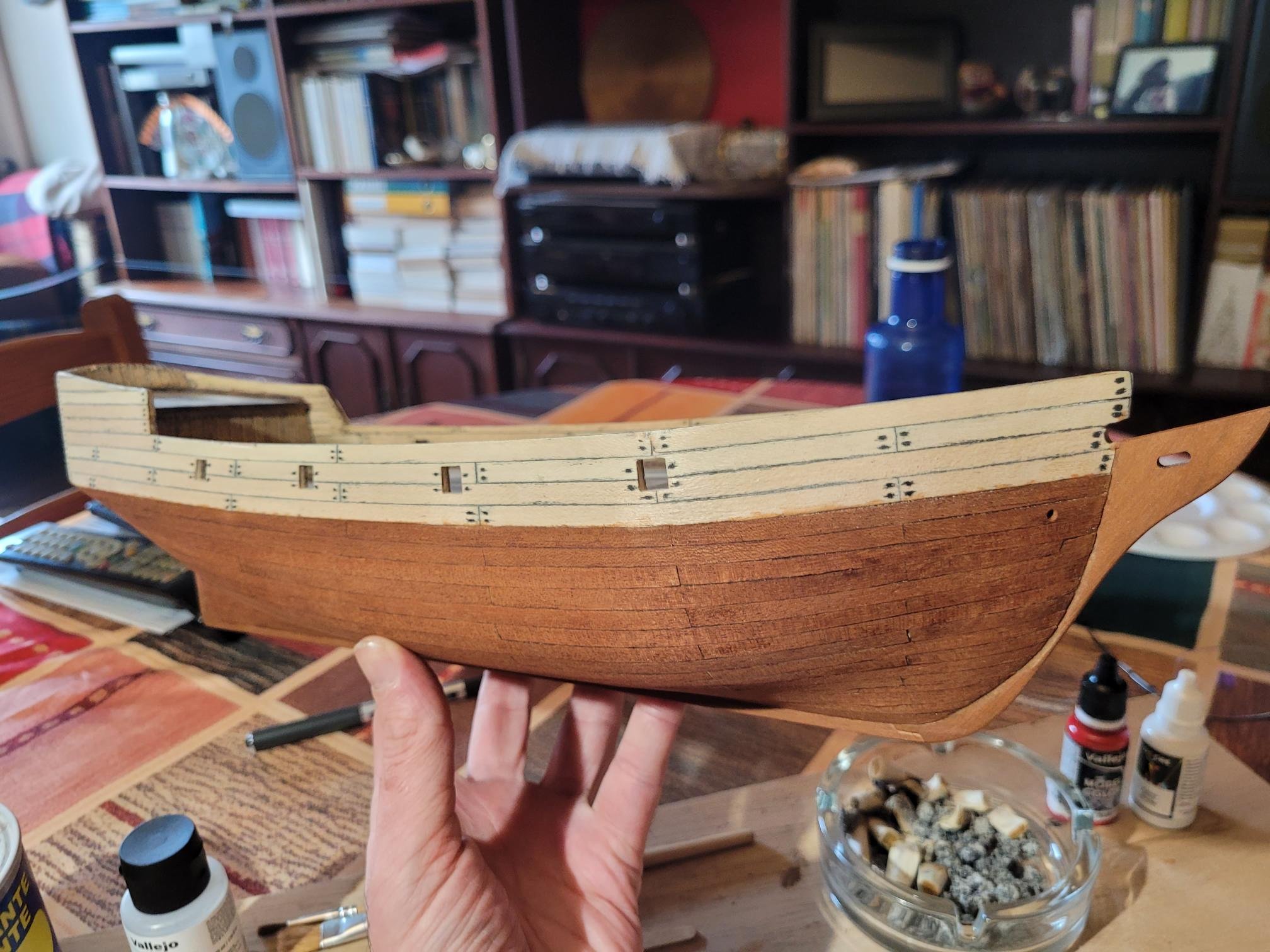 Hey, thank you for your remarks! Followed your advice regarding the holes, it looks nice. Pics soon I'd like your opinion on the clink I had at the bow both in first and second planking, it's been in my head this whole time and your remark on the "wood supplied" got me thinking further. Could it be that Occre's hull structure and plank width does not allow - at least for a beginner - deviations from their instructions and, thus, prevent a proper planking design? I started to consider this because: 1) looking at your scratch build, namely the fact that you have 10 planks and occre has 15 5mm planks. 2) when at first i fit a planking batten at the middle, indeed it went far up at the bow and to a lesser degree in the stern. Indeed, when I was planking the clink was the result of forcing the planks to the place they needed to be in order to fit the 15 planks, when naturally they wanted to go up. Could it be that, with the premade structure and planks supplied its impossible - at least for a begginer - to deviate from the instructions, meaning i would have needed less and wider planks? Or is it just begginers lack of skill? Thank you!
