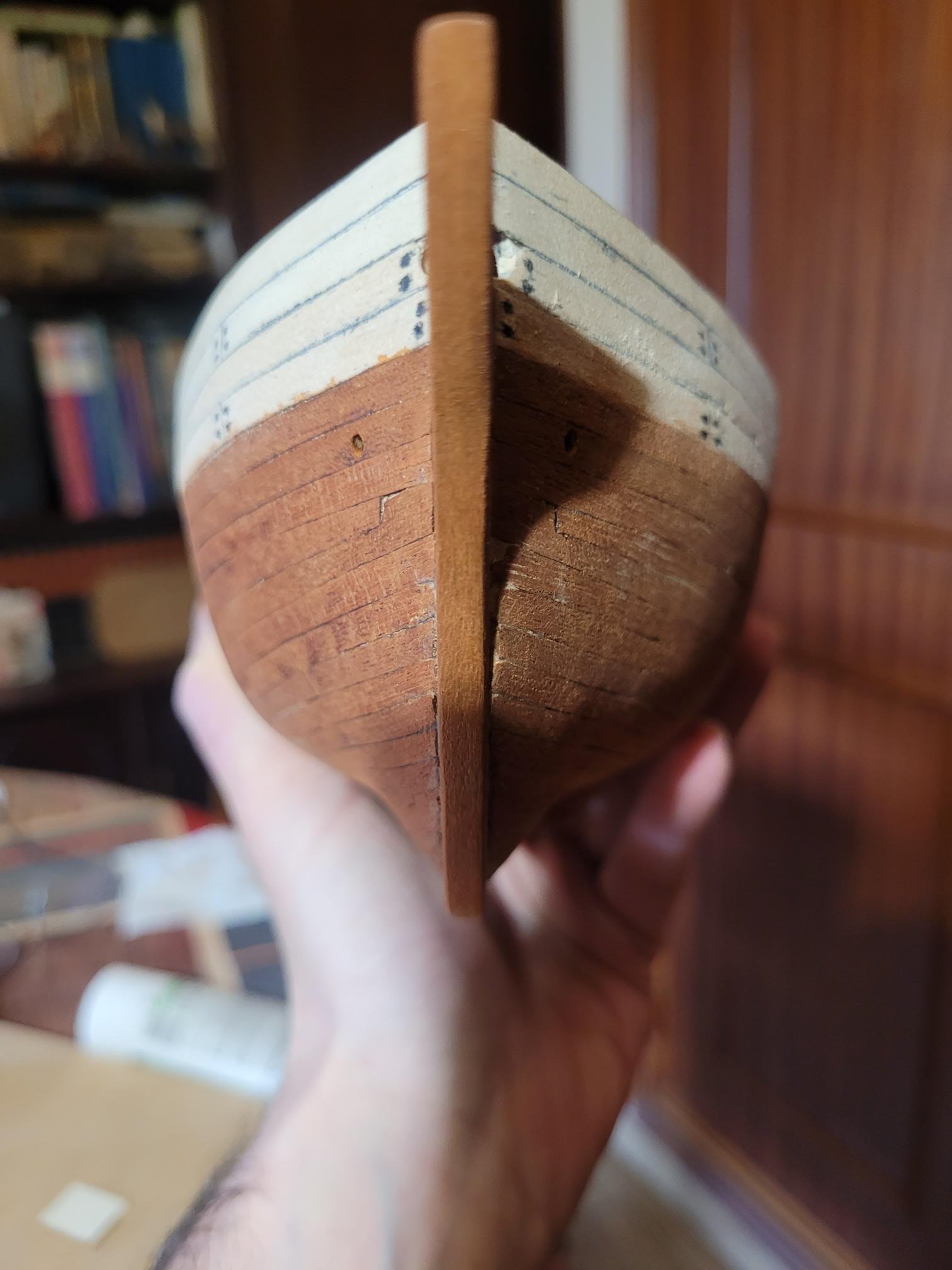 Well, it basically took me a month to do the second planking. I expected that, despite the awful result of the first planking, after filling and sanding the second planking would go smoothly. It was not so. The biggest problem was at the bow, where it proved impossible - for my hands - to plank properly, as the planks clinked at a certain point, leading to this ugly result. Furthermore, there are small gaps in many places, where i was unware that planks were not properly connected. You can also note the small holes left by the pins, but I couldn't hold the planks while the glue settled. Now, before i go further with the build, i'll take a bit to improve the result. I'll try to sand a bit to even the hull, filling and painting where necessary. Thank you all!