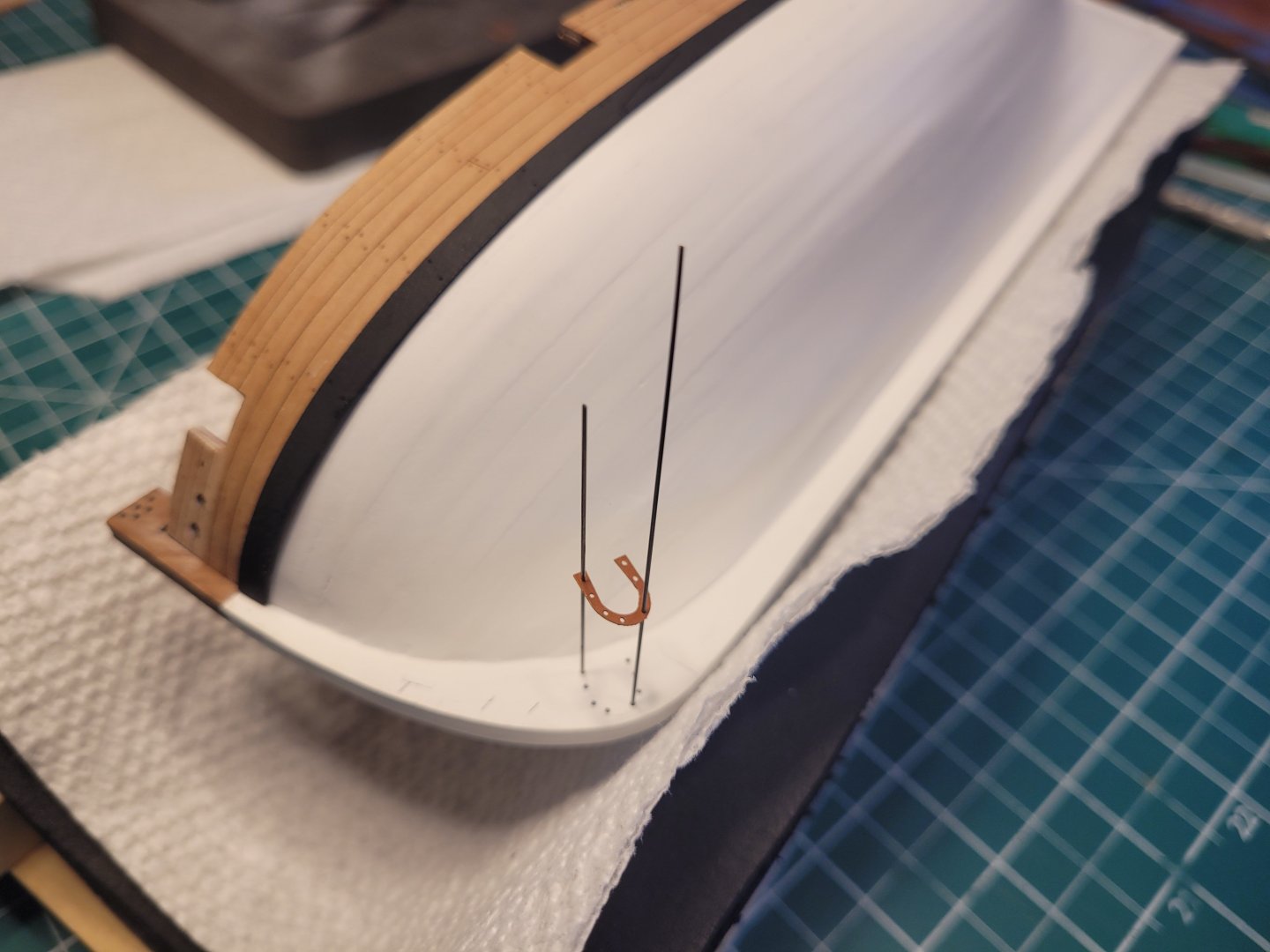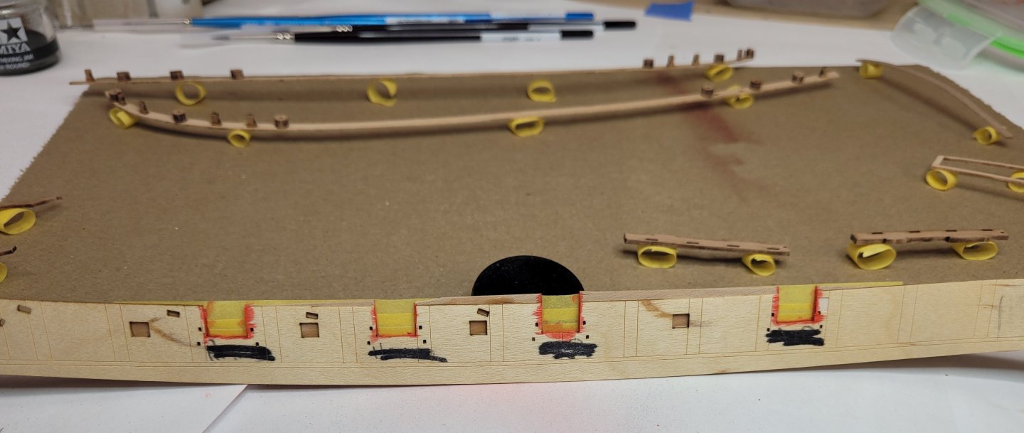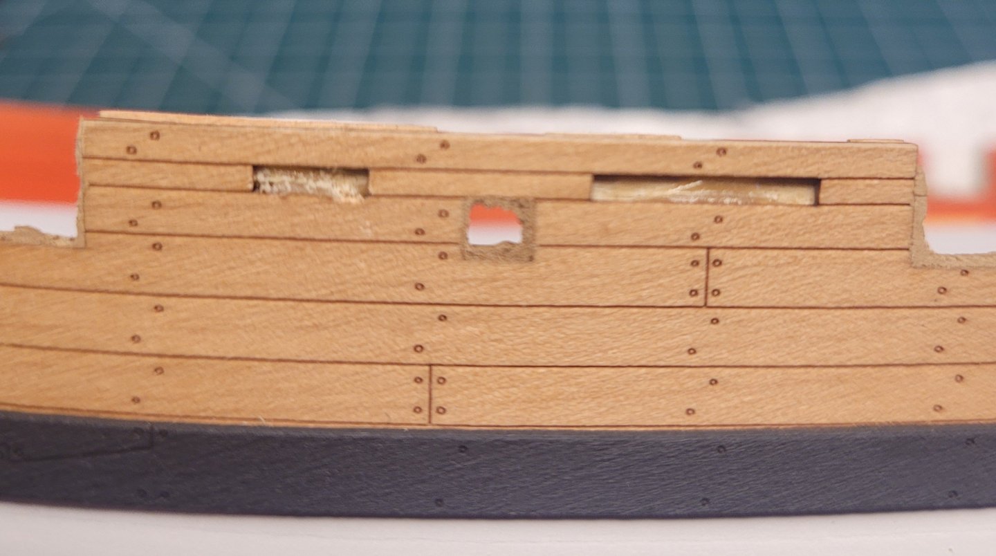 Here's an update; I went a few weeks without getting in any work on the model and then was away for a while. Next up was dealing with the pesky/tiny PE depth markings. I chose to paint them, and used the Vallejo Copper. They looked far too orange but when on the hull, look ok imho. I managed to clog up holes etc, but some finicky work with a drill bit and hobby knife cleaned them up ok, although I'll probably have to do some minor touch-up after they're on the hull. I started with the horseshoes. After glaring at them for a while, which didn't really accomplish anything, I fiddled with various ways to put them in accurate position, and glue them. Picking them up as such with the wax pencil works great, but since the wax pencil obviously sticks, I couldn't keep or manoeuvre them into correct position. There ensued multiple tries, with the cussing increasing exponentially, no luck. Then I had the idea of using two metal rods of the same diameter as the holes to use as guides to slide them down into position. A few tense moments but it generally worked well, here's a pic. Putting on glue with the PE parts is a beast, particularly as you're putting the glue (I used superthin CA) on a finished surface and don't want excess glue to show. Putting some tiny dots of glue on the hull seemed to be the answer versus trying to put it on the part and then trying to slide the part down the rods. I had a bit of excess glue squeezed out, but not too bad. It's only when i went to do the numerals that I figured things out. I didn't take a pic but there wouldn't be much to show. I started by just placing the part on the hull, with the stem horizontal as per the above pic, then twiddled it into final position using the tip of my hobby knife. Then, very carefully, so as not to move the part, I put on a mini-clamp just catching the outside bit of the part. With the part solidly held in place, I used the smallest applicator I could find to dab on some CA at the interface of part and hull and get the capillary action to draw the glue in. That has worked pretty well on the whole. Then the clamp could come off and the other side of the part glued. This has worked ok through the first two numerals, but I have left off for the time being in favour of switching to the following. But I will have to go back to the depth markings to finish them before installing upper work stuff. Waiting off-camera are a bunch of parts that have been prepped, painted and ready to glue in place. These include the spirketting, the gunwales with installed swivel gun posts and timberheads, stern board strip, stern side timbers, stern transom rail, channels, hatches/gratings, rudder/tiller. Basically, except for steps 79-81, all parts are ready up to step 85. So I'm on the verge of a frenzy of installations. But first, I need to do some cleanup on gunports and oar ports so that the plywood middle layer of bulwark won't be seen. The idea was to tape over the outside of the ports, and then paint the insides. But experimenting with a piece of inner bulwark from my messed-up original build just confirmed the obvious, which is that paint would bleed through the external pearwood like crazy. Here's my dummy test: So I figure the best way is to put filler on the inside of the ports, sand that flush, and then WOP to seal. I don't think I can just go with filler, as that will soak up paint and possibly bleed through to the outer bulwark. So here's the work with the filler. I used a small palette knife for the gunports, but it was too big for the oar ports, so I made a palette knife out of some plastic strip held in tweezers. I used a just-damp sponge to wipe the bulheads right after applying the filler to remove any excess; that worked really well. The end result, which is where I'm up to now: Sanding/cleaning next. Finally, before I glue on the gunwales, I'm going to have to get rid of some excess glue that I hadn't noticed that's in a couple of the upper rail slots, pic below. I've previously hacked away at these with a hobby knife, but the wood glue is touch as old army boots. I'll resume hacking away, but if anyone has a suggestion, much appreciated. More soon. Nick