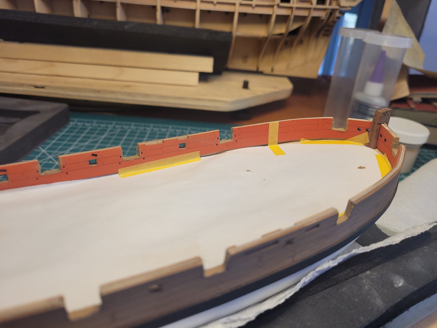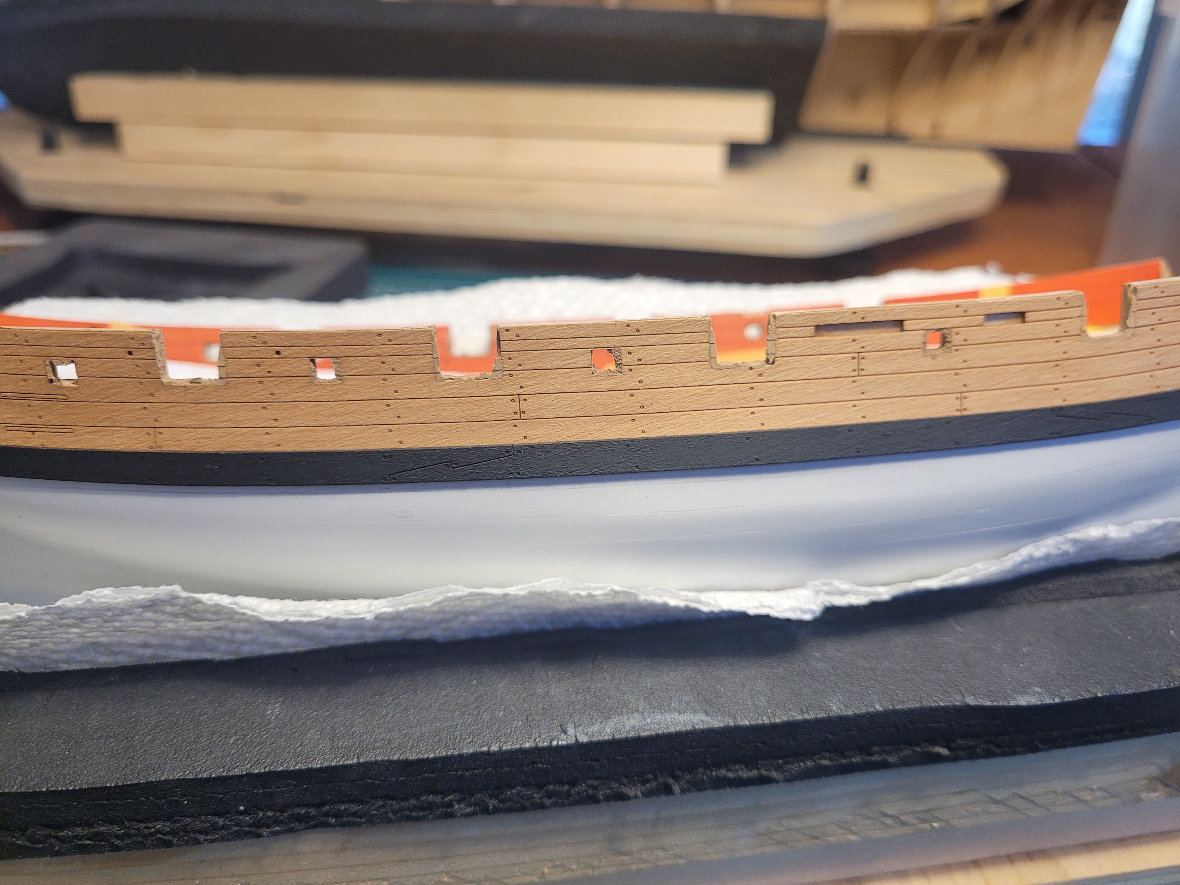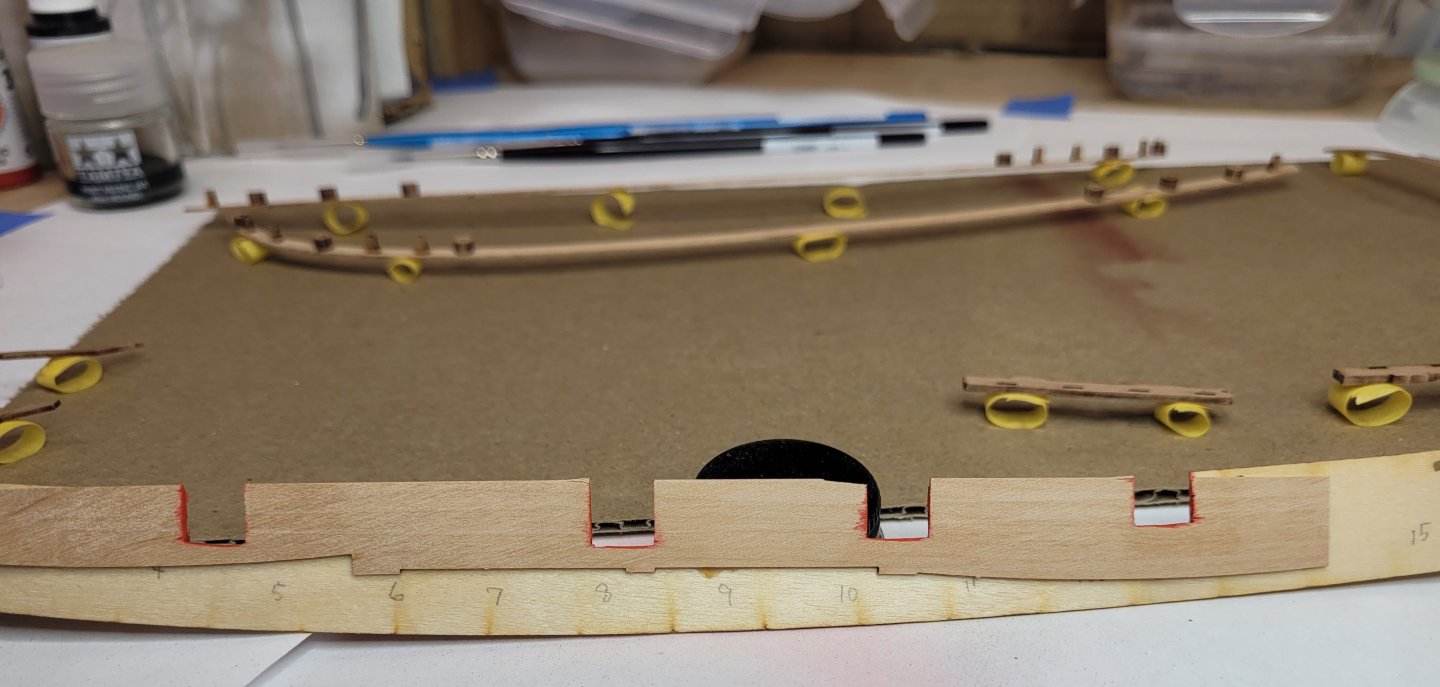 Well that fix worked pretty well. I carefully sanded down to final shape, cleaned off the glue residue, scribed out the etched lines as best I could, and painted. Glued in, it's not so noticeable. I've now glued on the other main wale and roughly cut out the gunports. There are a few little slip-ups here and there, but I'm pretty pleased with it. The red looks a bit orangey in the pics. Installing the main wales was kind of nervy, in part because I thought I was through with planking LOL. I decided to use CA; I just can't use those pins, they never go in right. I had pre-shaped the wale parts in the usual way, but I had to clamp them on a bit higher than the top line for them because I couldn't clamp down that far. I suppose that gave them an ever so slightly different shape, and on the starboard side one I should have backed off and re-shaped, especially the bit right at the stem, which wasn't curved enough. But of course I forced it down with glue on and luckily it held. It's a touch off but I'm not going to try to fix it. There's also a little bit of clinker effect on both just under the foremost gunports on each side, but again you can't really notice it when you're looking at the model normally, so best left alone I think. Except for the slight clinker, the portside wale wen down better as I did re-shape near the stem to fit better. Nick