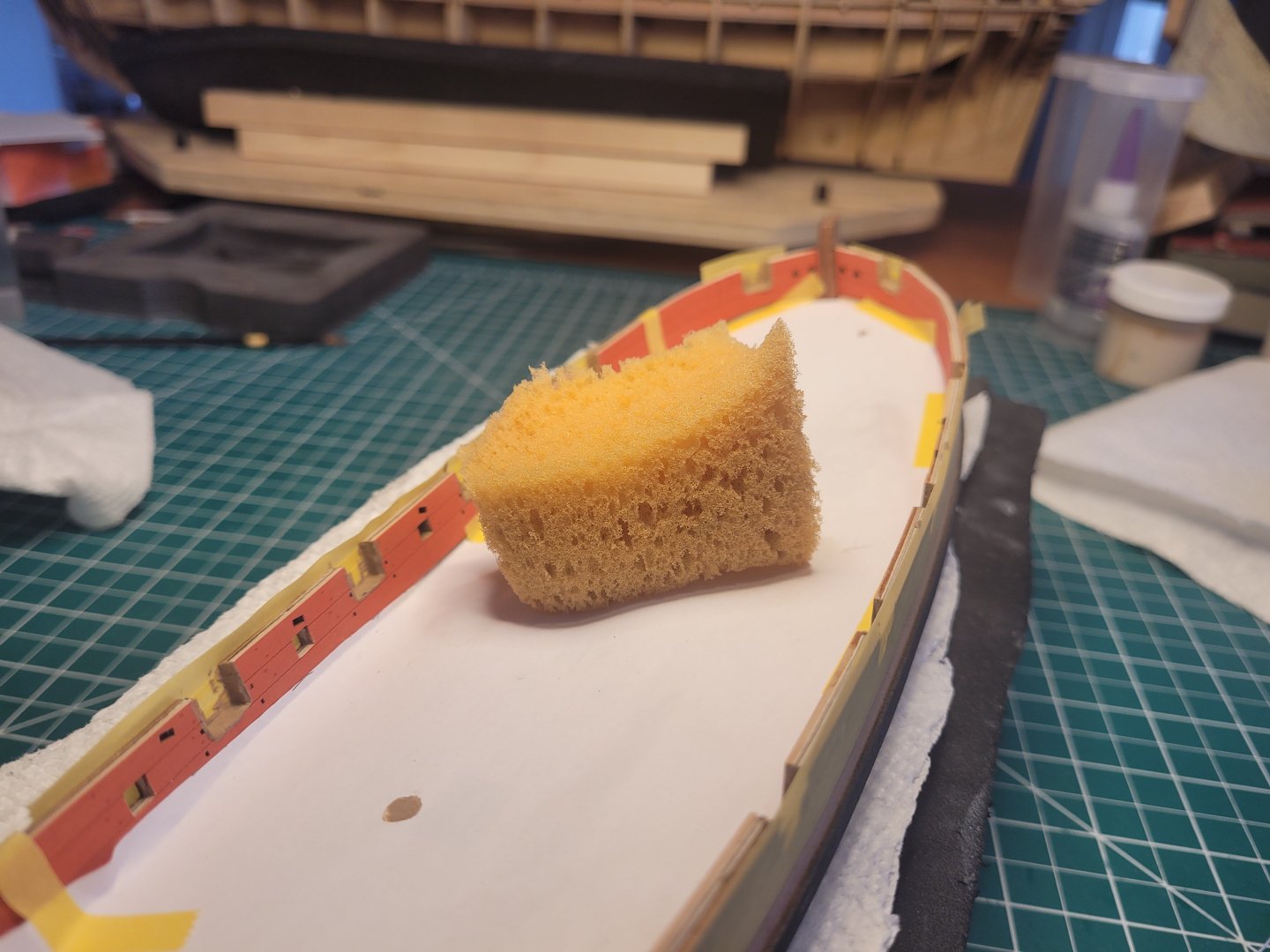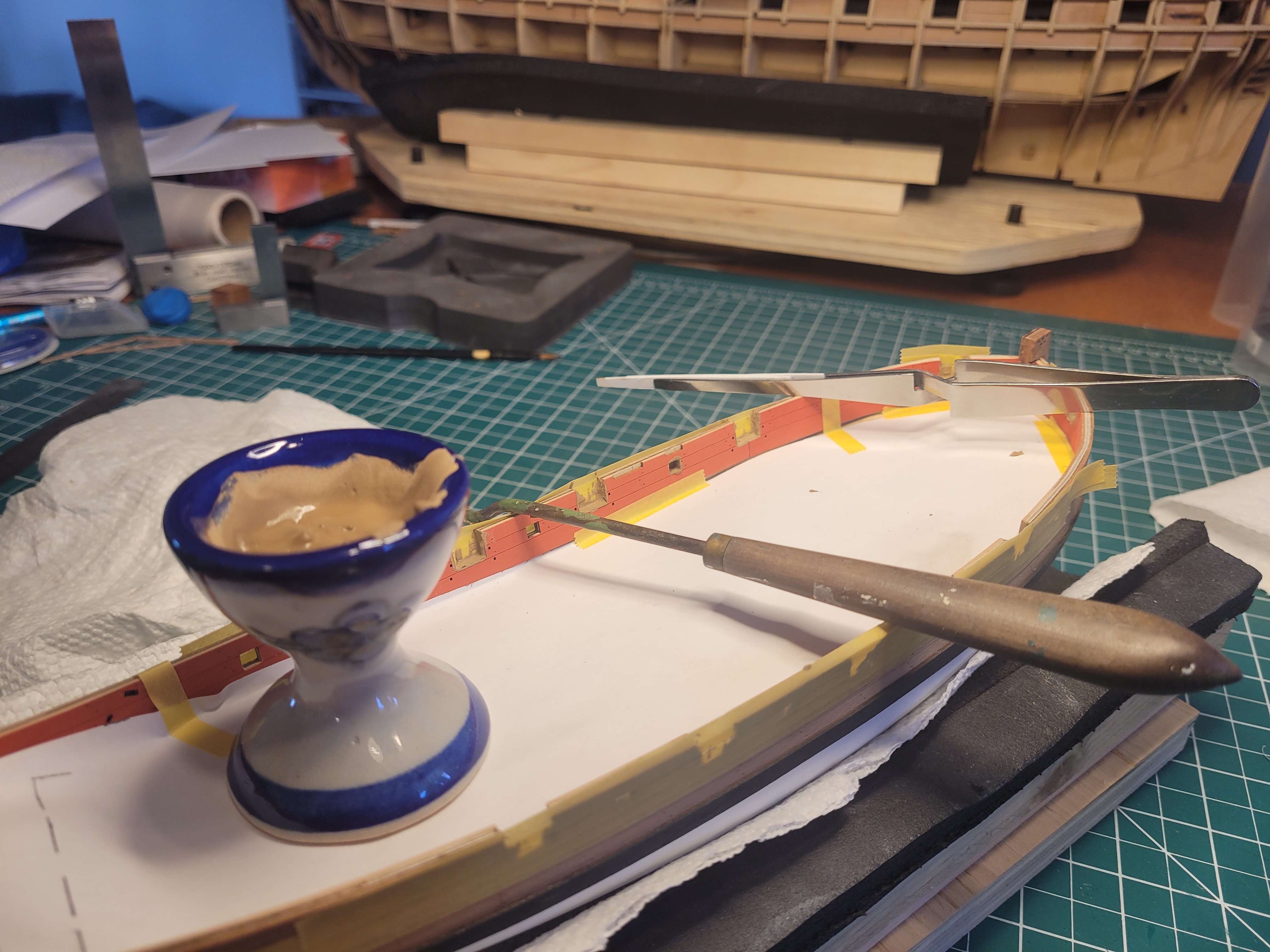 I ran into a little issue with the fit of the aft section of the starboard inner bulwark. Dry-fitting, I had a small gap at the stern end; it's only 1mm, but is plenty for the gap to show. The section lines up nicely otherwise, so I don't want to do a small insert at the section join, as that would throw alignment off imo. I measured from stempost corner to each quarter corner, and the starboard side measurement is indeed 1mm longer, so my starboard side is longer somehow than my port side. So my idea has been to try and tack on an extension to the stern end of the bulwark section, using the sprue form, so it will necessarily match, and then I'll just have to cut/sand the addition to match. So goes the theory anyway. So I've put down some wax paper underneath to prevent the glue from sticking everything to the cutting mat, put some glue on the sprue end, inserted the part and put some tape on to hold it as firmly as possible against the sprue end, some wax paper on top to prevent glue sticking to a board clamped on to hold it all in place. That was half an hour ago. Gonna leave it for at least two hours before taking a look to see if it's worked. Fingers crossed. Nick