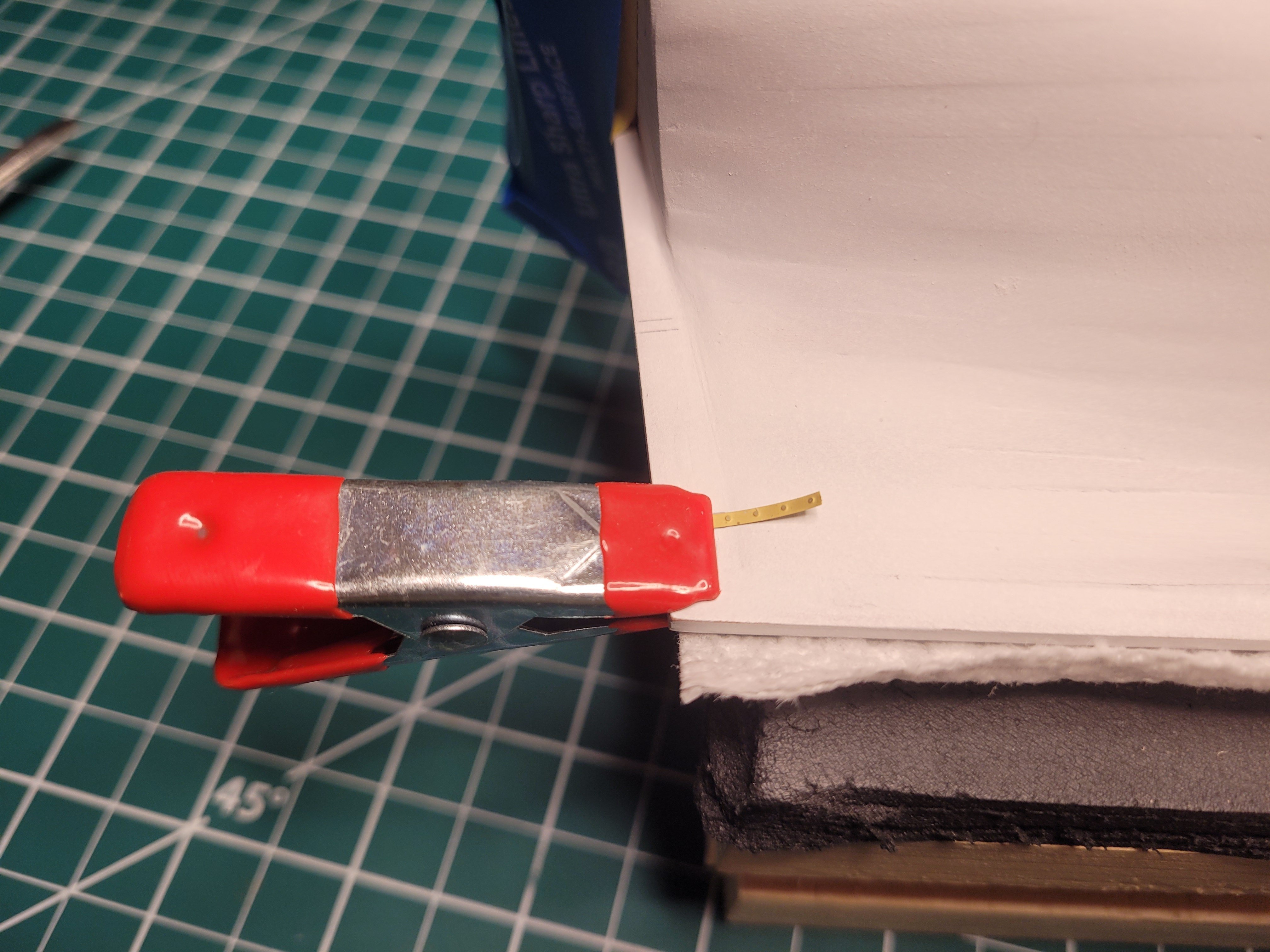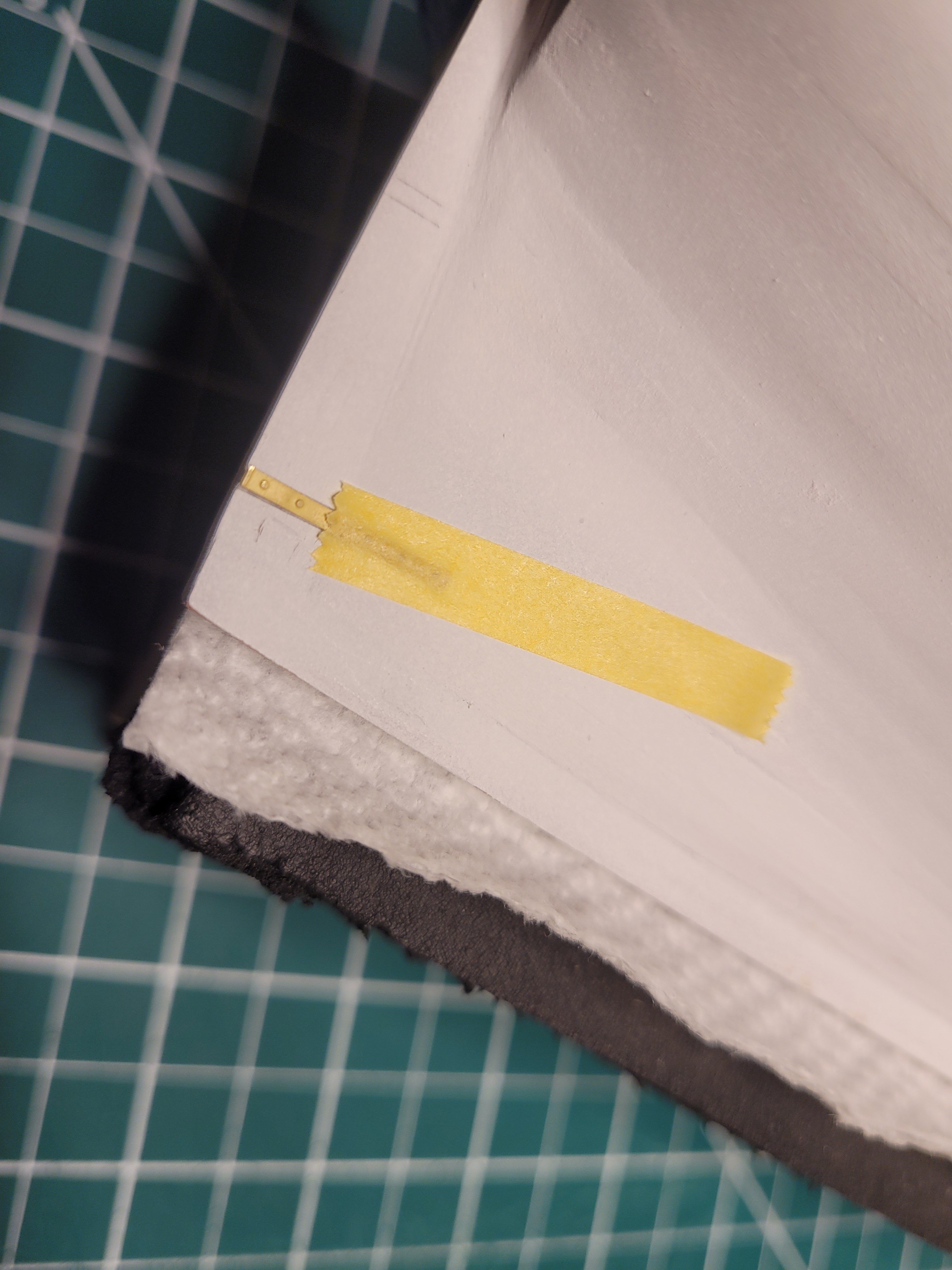 I'm finding as I say that picking up the PE parts with the wax pencil is a breeze, but getting an accurate placement is tricky because the wax pencil has just enough resistance to coming off that the part won't always stay where you want it, so doing it with glue is dicey. So I'm putting a length of masking tape on the part and then using that to get the right position and stick the tape down to hold the part in place. Then I'm putting a clamp on the other end and removing the tape, making sure to remove it starting with the end of the tape that's on the part to be sure not to move the part. Then I can gently lift up the exposed part, put some glue on and press it down. Then the clamp comes off and I repeat with the other end of the part. That's working well, although only for the lower two parts; there's just not enough space to do this for the upper part. So that's placement/glue with just the was pencil, which is a bit nerve-wracking, but one down ok and one to go. The rudder parts should be easy as it's not installed and is more accessible. I decided to use medium CA glue; the extra-thin is just too runny. I load up the microbrush, but smear off the glue so that there's a minimum left on the brush, and then apply it to the part or the hull. Nick