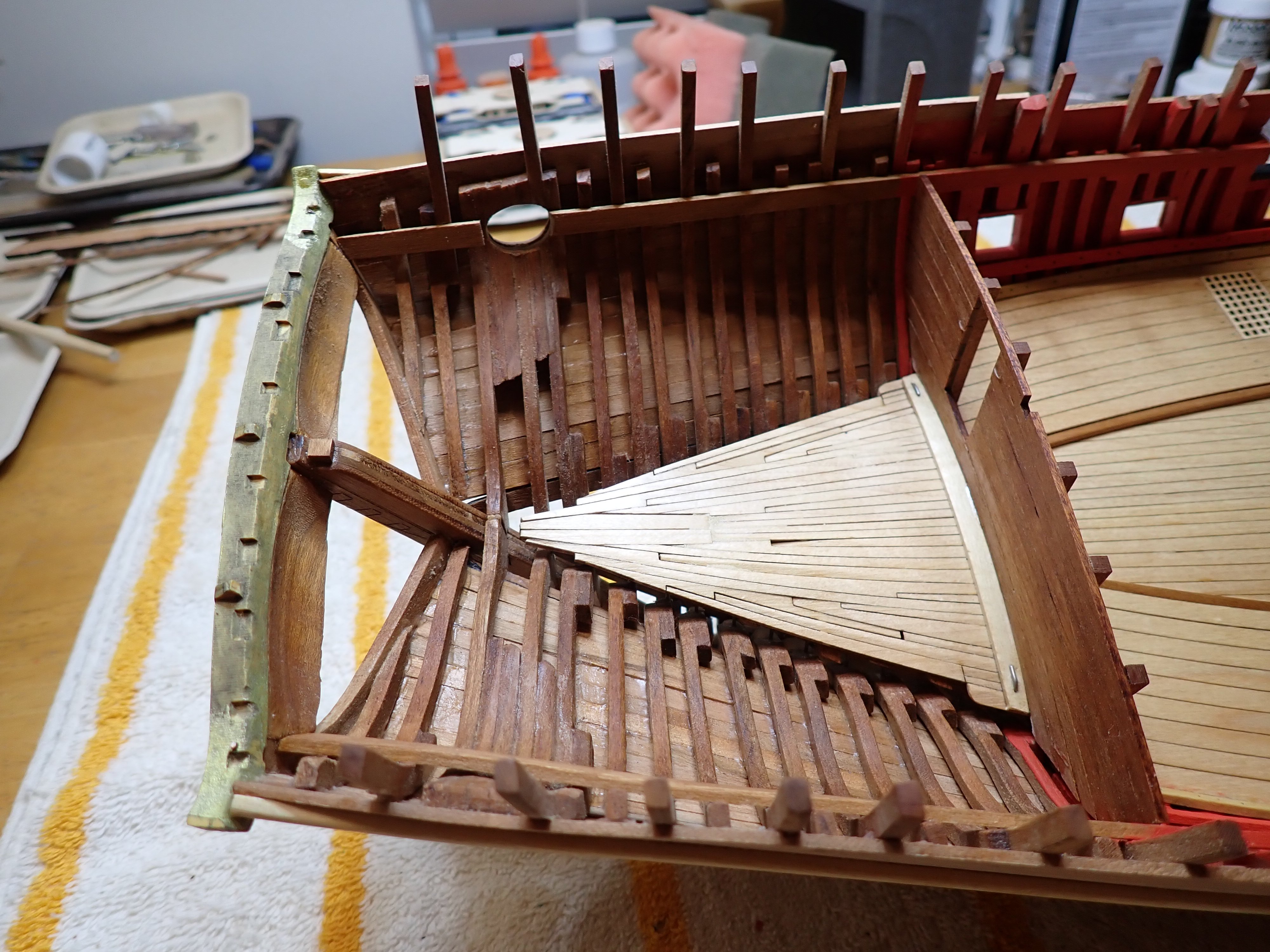 Before you butcher your nice decoration near the catheads, keep in mind that the Anatomy of the ship does not mention the presence of that knee pointing towards the stern, as you indicated. I think this element only belongs Slade's model and is not representative of the ships of that time. In my opinion, you should not add it as it makes the sleek lines of the Bellona less pleasant and is not required from a carpentry perspective. Yves