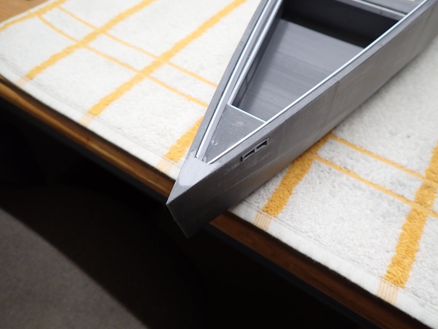 I am now working on the second module and after cutting a large opening in the middle, I have glued it to the bow: The very sharp and aggressive shape of the hull, can already be felt. To move at 60 knots on the water, you really need that. The third module is also prepared as the opening will protrude into it, as well (See below): Using Tinkercad (I am no expert in designing my printing parts), I created a long window that would fit and provide some transparency, as the prototype is equipped: For the first time, I am using PETG filament (versus the PLA used to make the hull parts) in green translucent color. On the ENDER 3v2, the bed should be heated at 85 C and the nozzle at 220 C for a decent result. Printing speed is reduced to 50% to allow for a good adhesion with the build plate. PLA uses 60 C and 200 C respectively. Yves