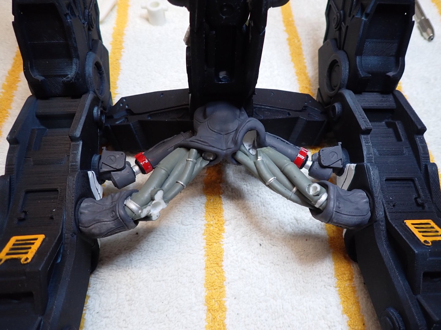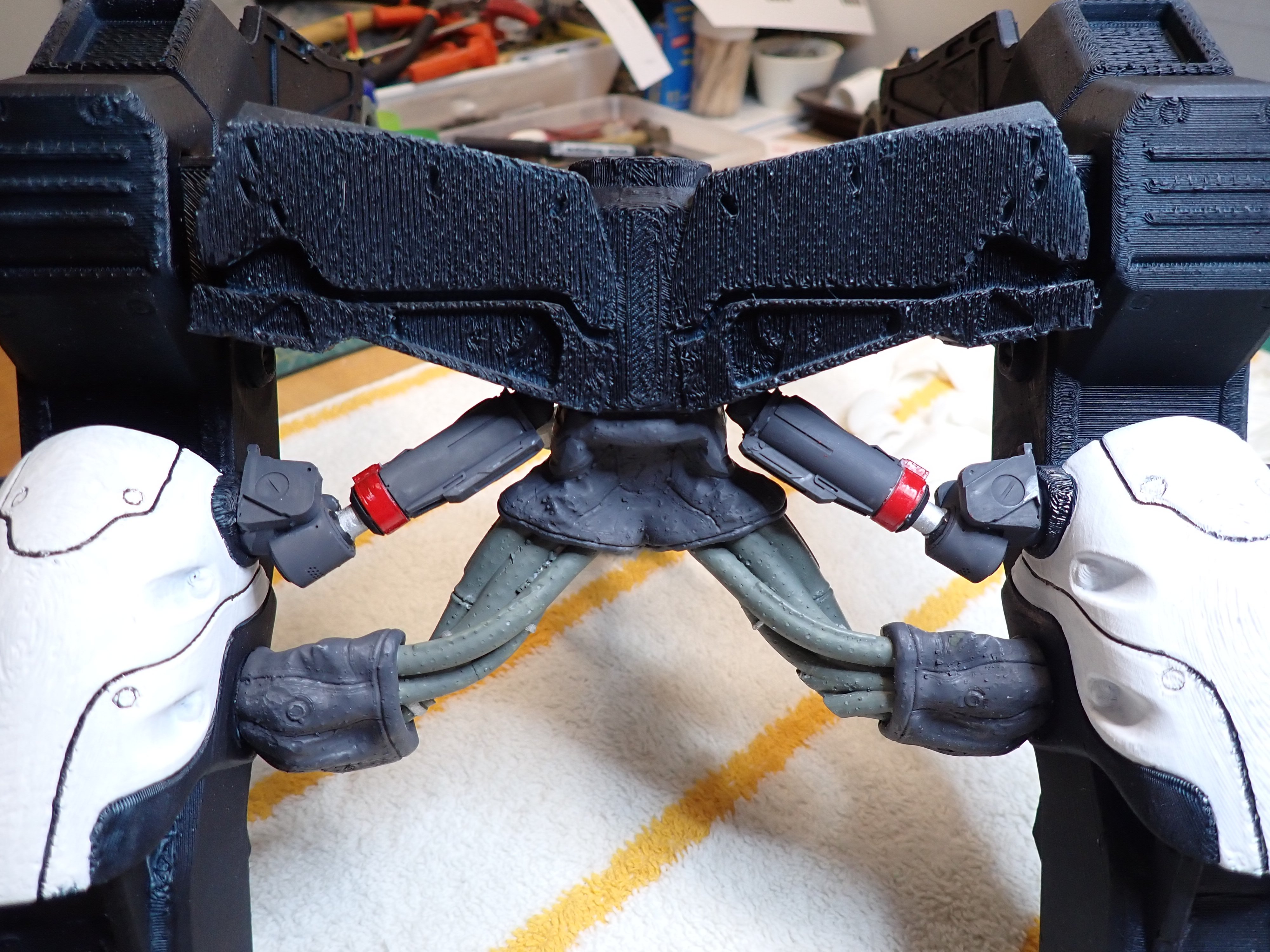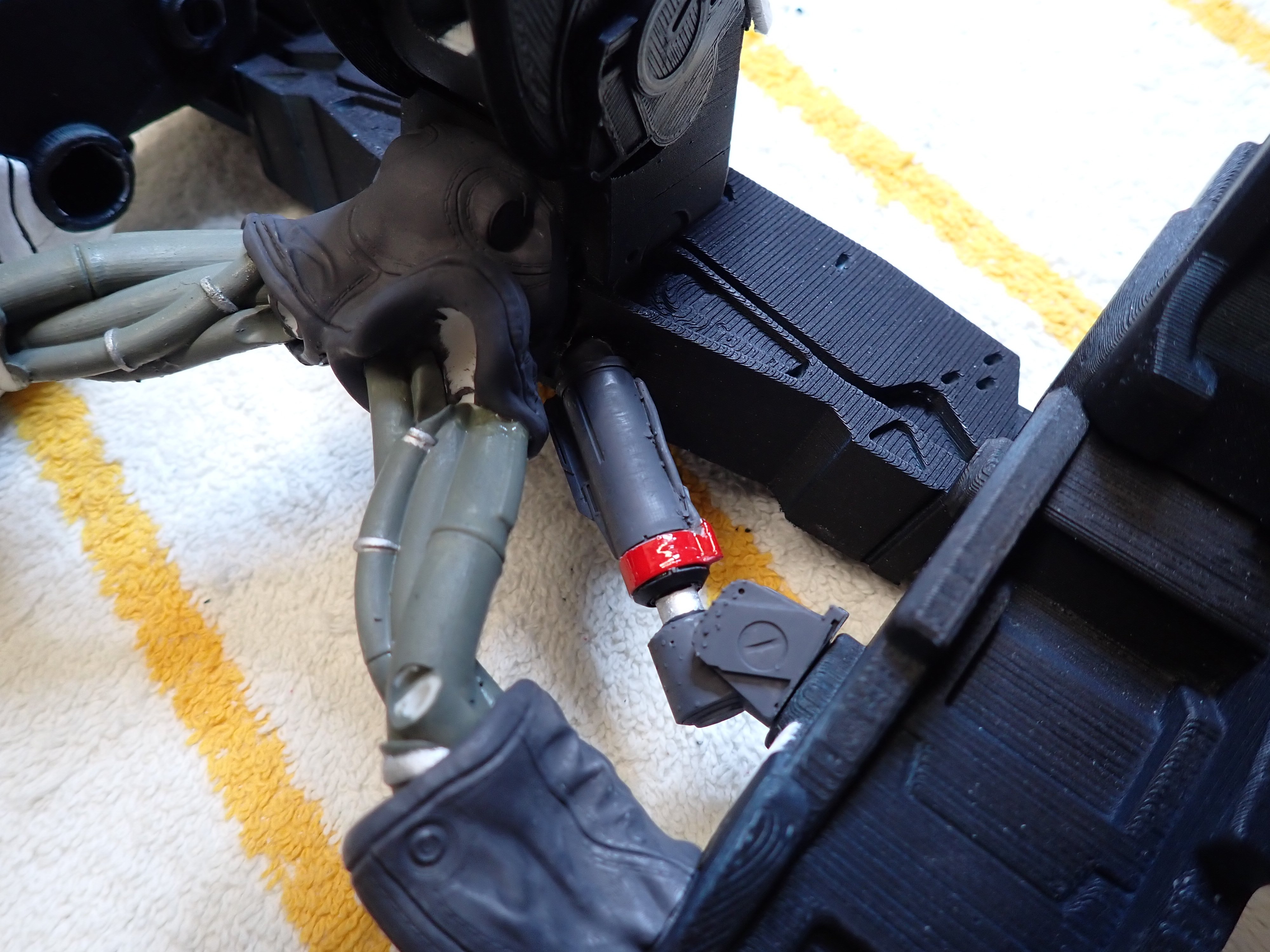 I decided to install some hoses, pipes and bags as well as the hydraulic pistons to control the "Hangar": It has that ominous look of a war machine.... Pistons, below: Above, you can see the coarse appearance and texture of the PLA printing with support. Fortunately, this is the back of the sculpture. Back of the AI creature in place (above). Overall view of the "Hangar" (below): Yves
