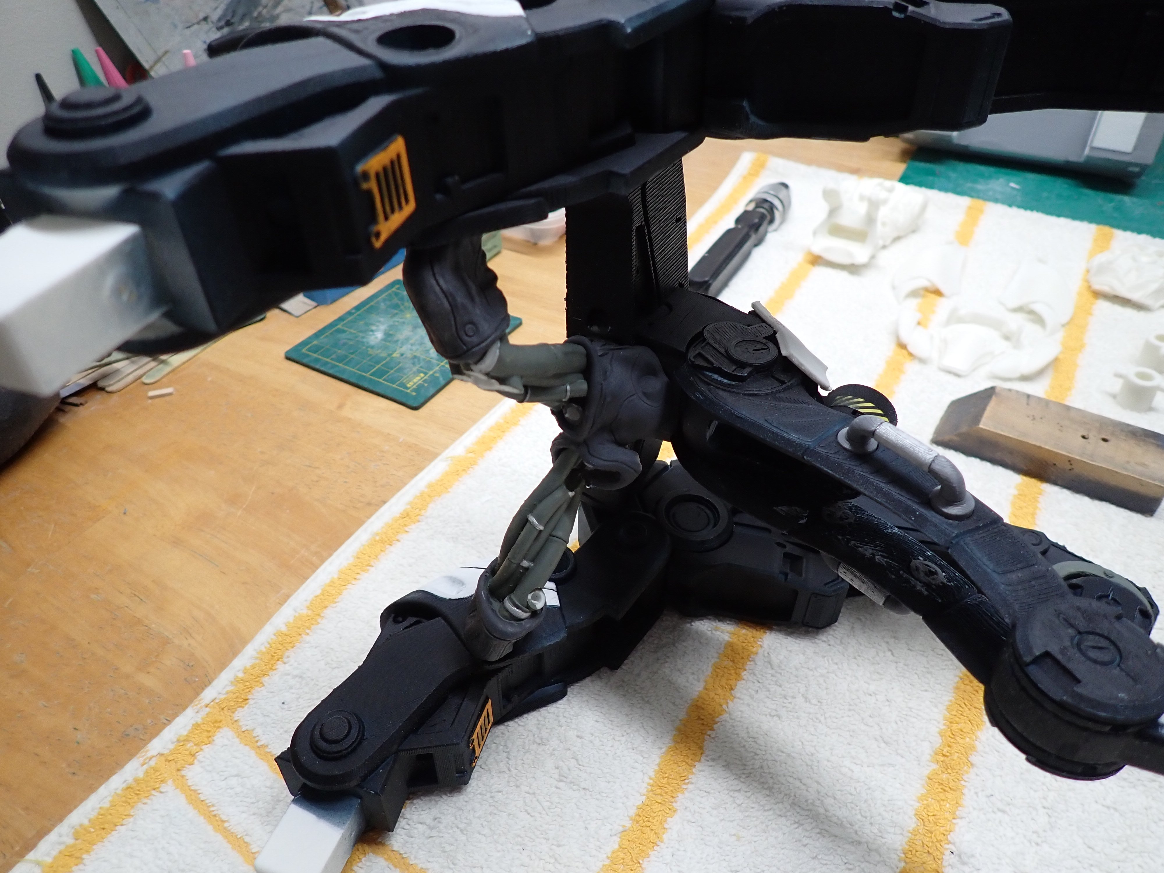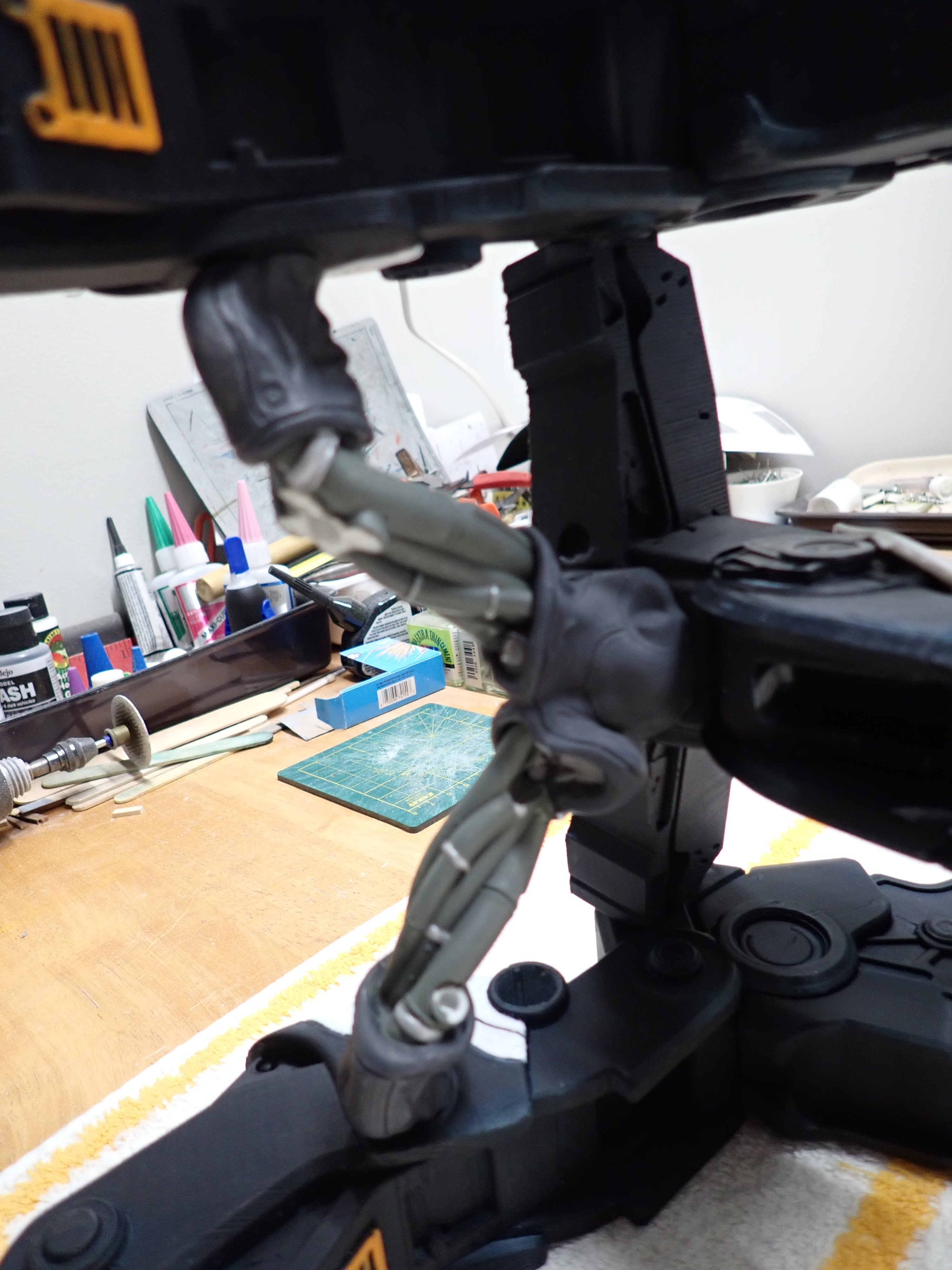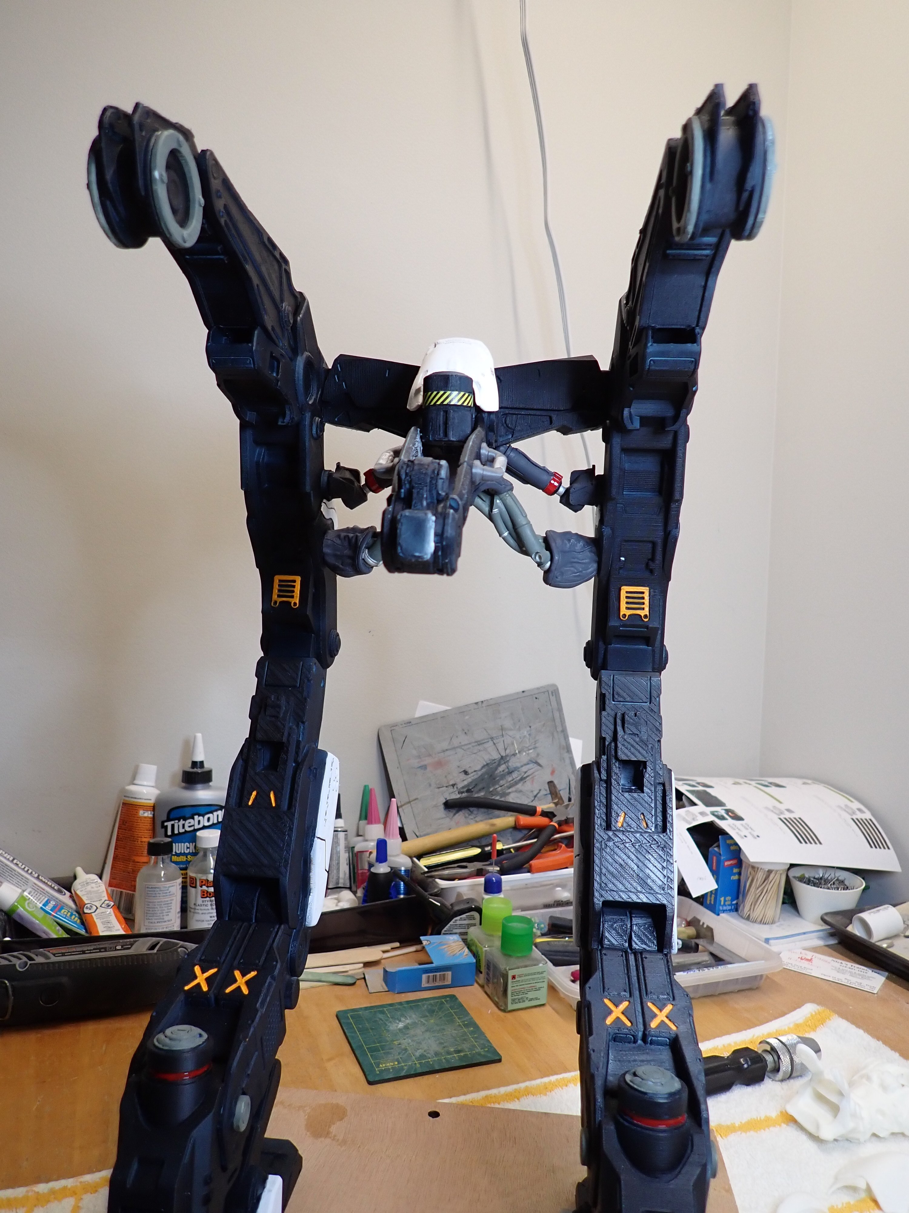 I decided to install some hoses, pipes and bags as well as the hydraulic pistons to control the "Hangar": It has that ominous look of a war machine.... Pistons, below: Above, you can see the coarse appearance and texture of the PLA printing with support. Fortunately, this is the back of the sculpture. Back of the AI creature in place (above). Overall view of the "Hangar" (below): Yves