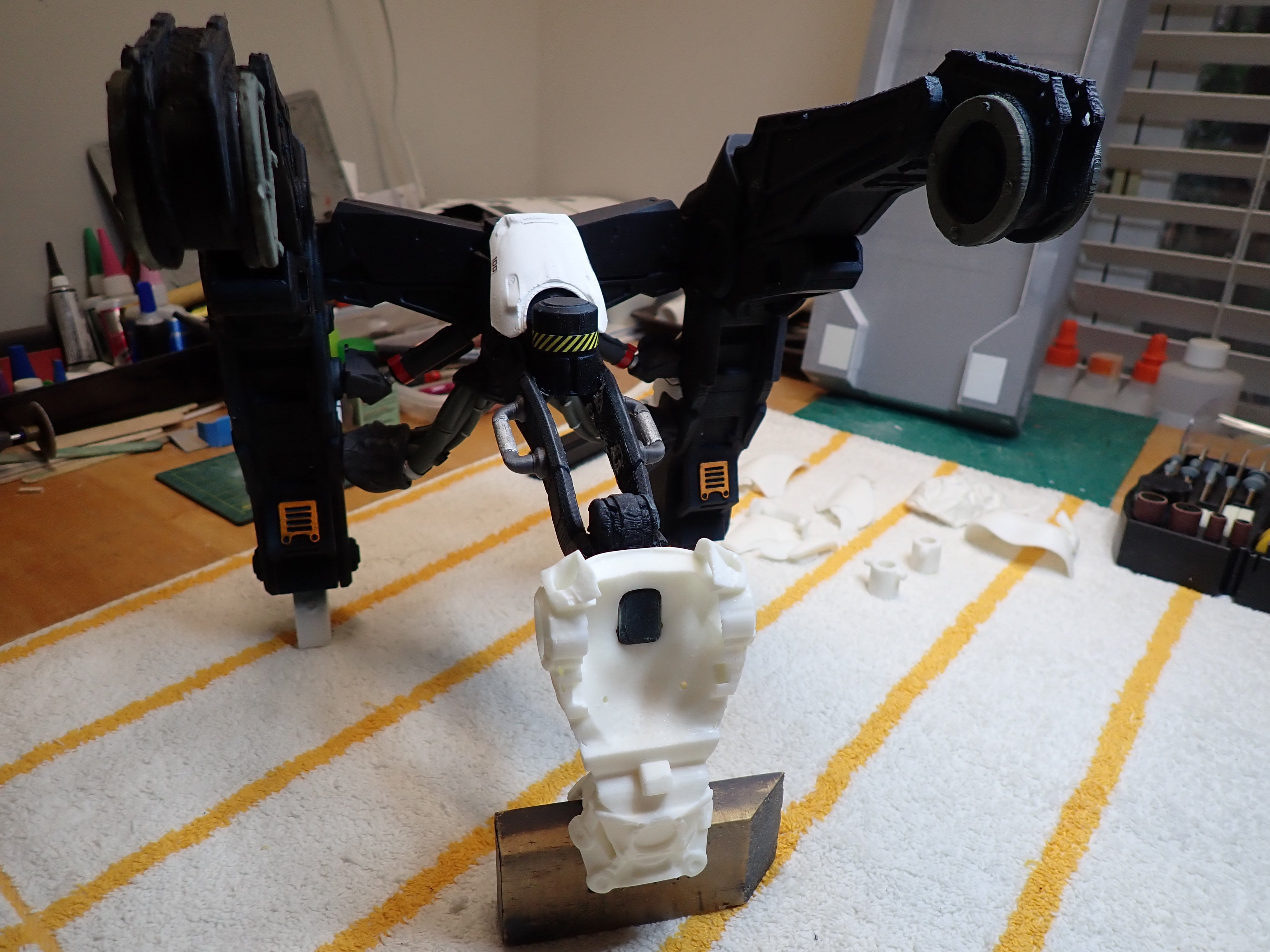Most of the parts for the AI creature have been printed: The neck and head were printed with PLA (Filament) whereas all the other parts are made of resin. I tried three iterations of the head: To the right, is a missed 90% resin printing. Supports were inadequate and half of her face went wrong. In the middle is a 85% scaled head printed with PLA. To the left is an 88% head printed with PLA. This one is perfect, it is filled at 100% PLA and the face shield fits perfectly on it. I may still try another resin print of her face at 90%, changing the supports. All the armor/shield parts are holding with mini magnets, so that they can be removed to show the guts of the machine. Yves