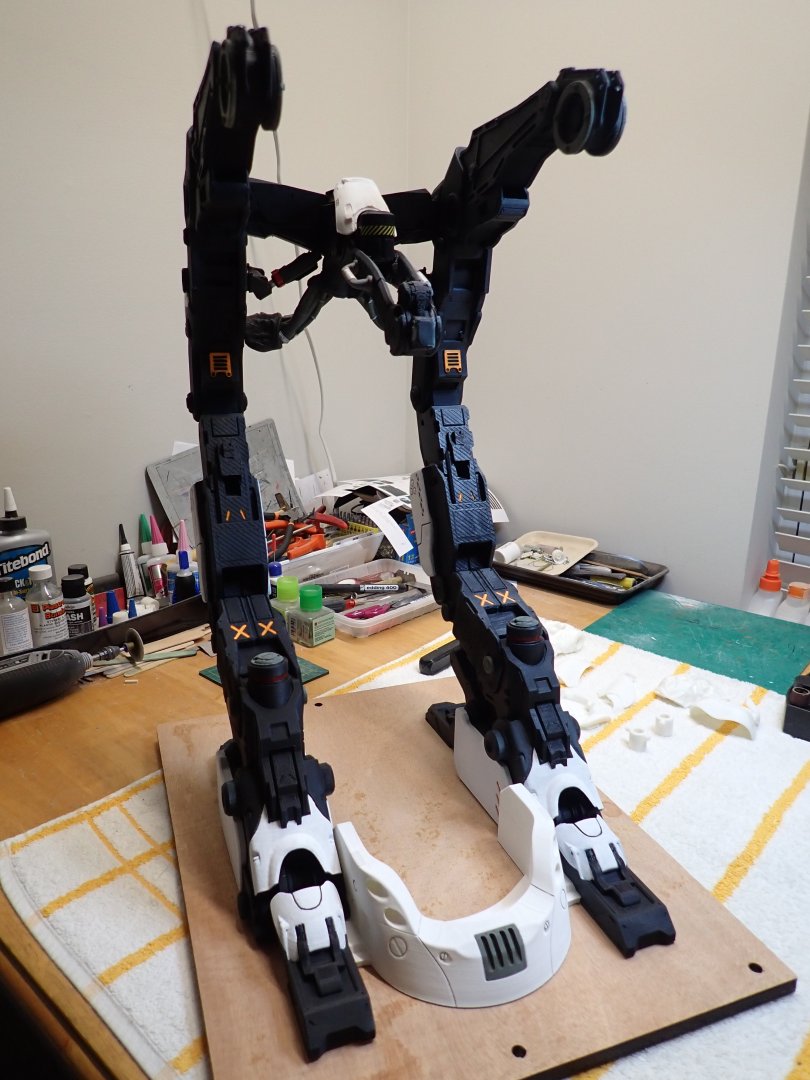 Moving along with this crazy project. The Hydraulic pistons providing some kind of motion to the AI creature: They actually stiffen very well the structure. I will paint them and glue them, later on. We have seen the back of the AI creature in a previous post. I printed three versions and will retain the 90% resin printed. The back is inserted into the main crane protruding from the hangar, but is also held by a long and massive set of hoses, wires and other cylindrical pipes. That enormous set creates a "robe", re-enforcing the feminine aspect of the creature. That part is massive and I cut it into two pieces using Meshmixer, as it does not fit into my resin printer in one part. It took 11 hours of printing and represents some 17,000 layers. After removing all the supports under scalding hot water, I place the part into the curing station for a few minutes: The result is quite impressive and very tall: You can see at the bottom, the second part that was glued using CA gel glue. On the last two pictures, the back has been set on top of the robe: You can almost guess the feminine appearance of that creature: Many more tubes, hoses and pipes will be added to the "robe". Yves