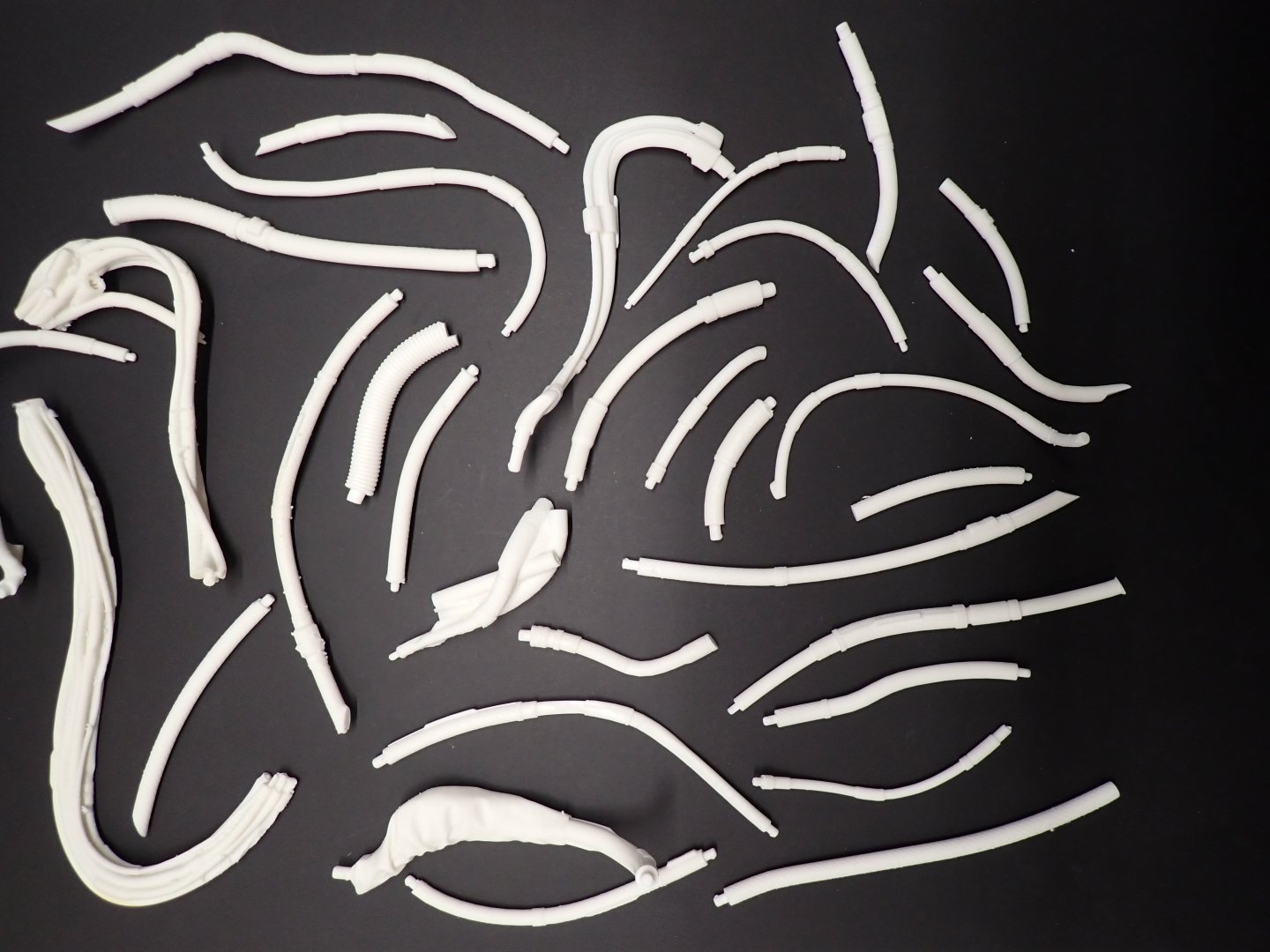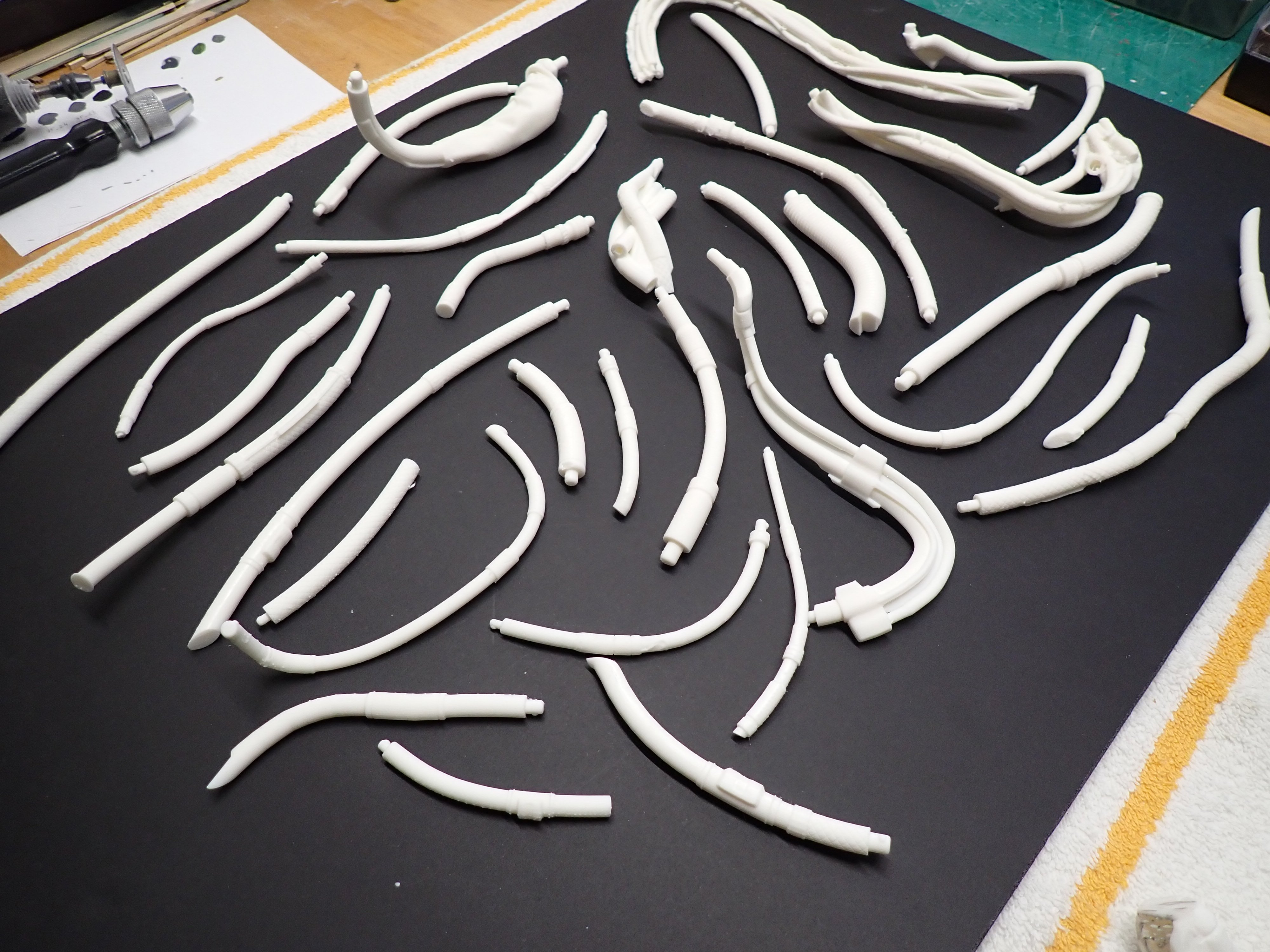 There are a lot of pipes, hoses and tubes on that sculpture.... It is actually kind of fun to replicate them... Below is a bundle of hoses that will connect to the back of the neck of the AI creature. There are definitely some pipes dedicated to cooling. Dry brushing is used to render the stainless steel braiding of the hoses: In situ, on the main spine of the "Hangar": Yves