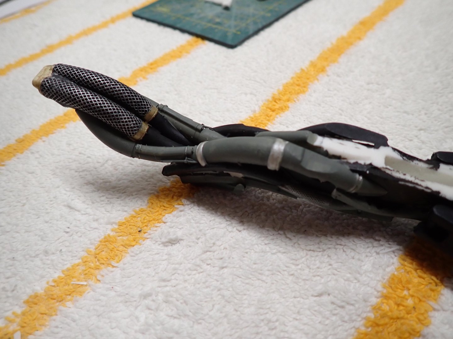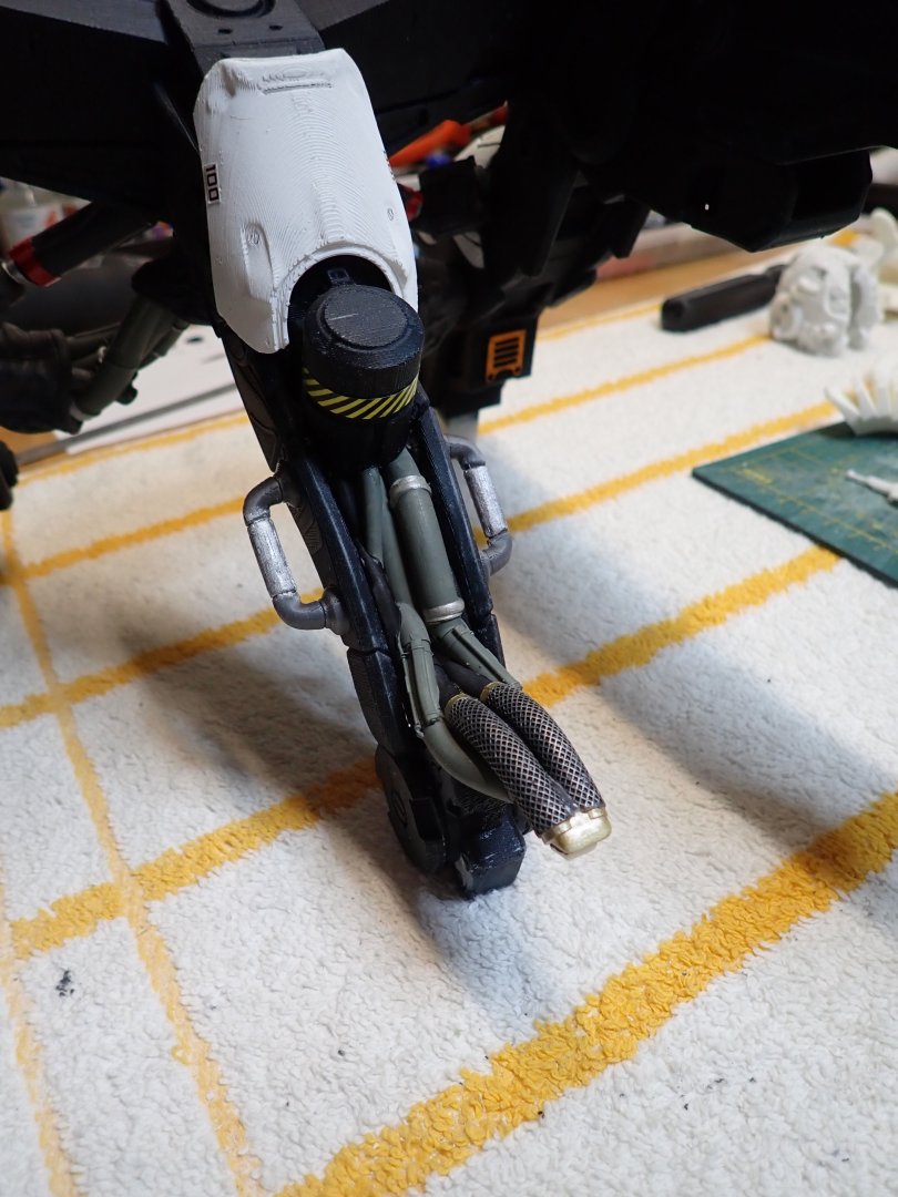 There are a lot of pipes, hoses and tubes on that sculpture.... It is actually kind of fun to replicate them... Below is a bundle of hoses that will connect to the back of the neck of the AI creature. There are definitely some pipes dedicated to cooling. Dry brushing is used to render the stainless steel braiding of the hoses: In situ, on the main spine of the "Hangar": Yves