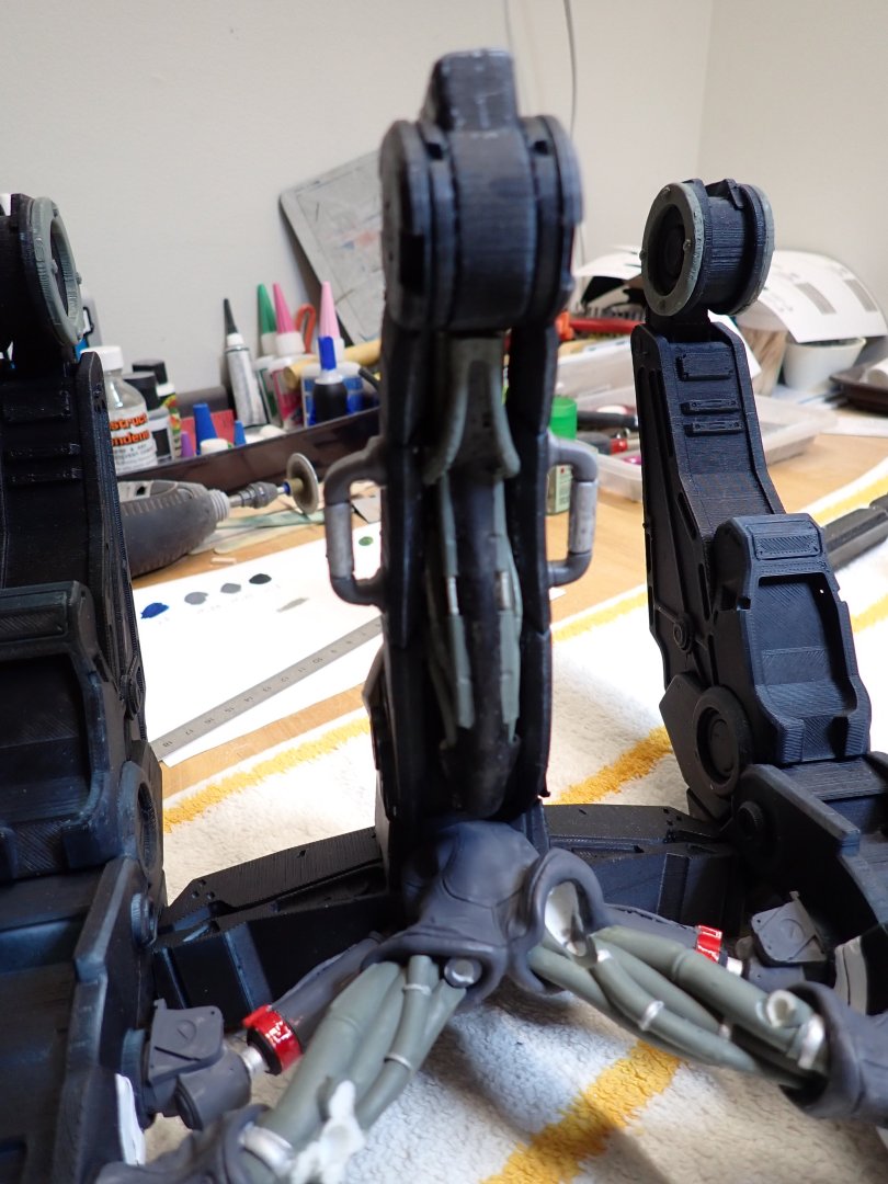 I decided to install some hoses, pipes and bags as well as the hydraulic pistons to control the "Hangar": It has that ominous look of a war machine.... Pistons, below: Above, you can see the coarse appearance and texture of the PLA printing with support. Fortunately, this is the back of the sculpture. Back of the AI creature in place (above). Overall view of the "Hangar" (below): Yves