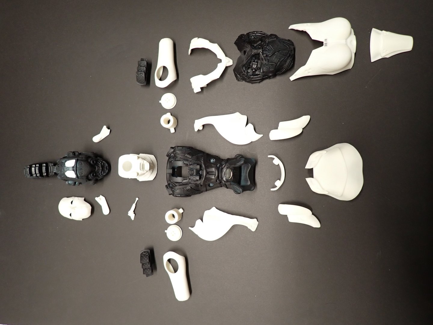 Most of the parts for the AI creature have been printed: The neck and head were printed with PLA (Filament) whereas all the other parts are made of resin. I tried three iterations of the head: To the right, is a missed 90% resin printing. Supports were inadequate and half of her face went wrong. In the middle is a 85% scaled head printed with PLA. To the left is an 88% head printed with PLA. This one is perfect, it is filled at 100% PLA and the face shield fits perfectly on it. I may still try another resin print of her face at 90%, changing the supports. All the armor/shield parts are holding with mini magnets, so that they can be removed to show the guts of the machine. Yves