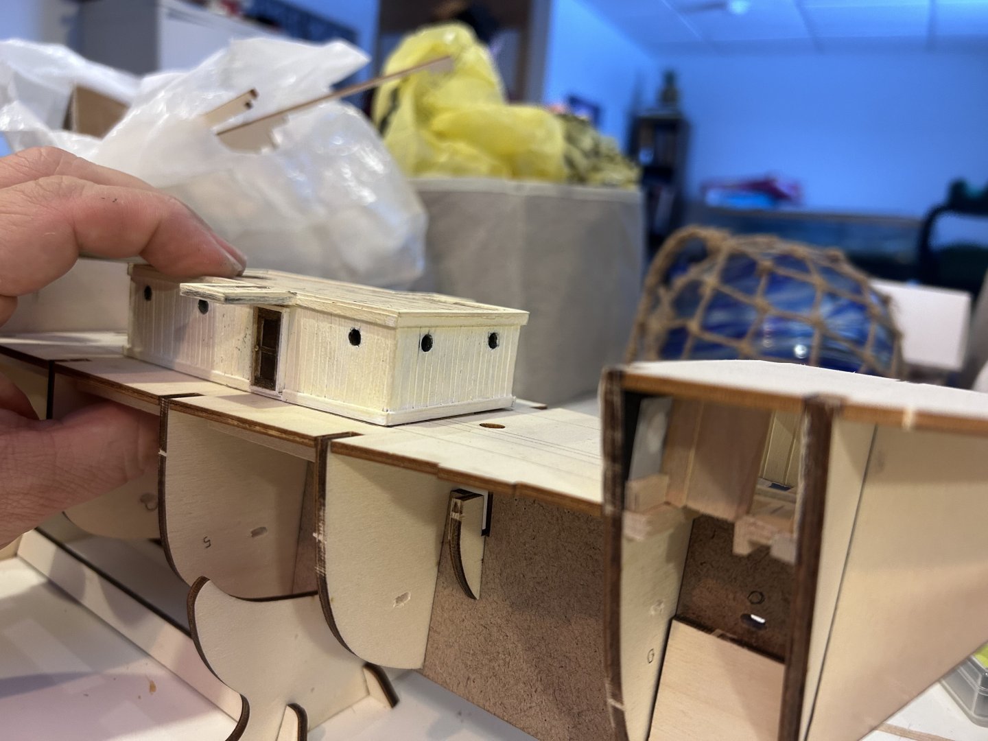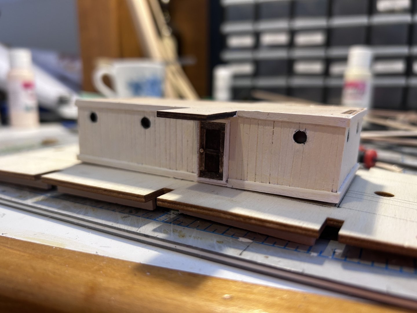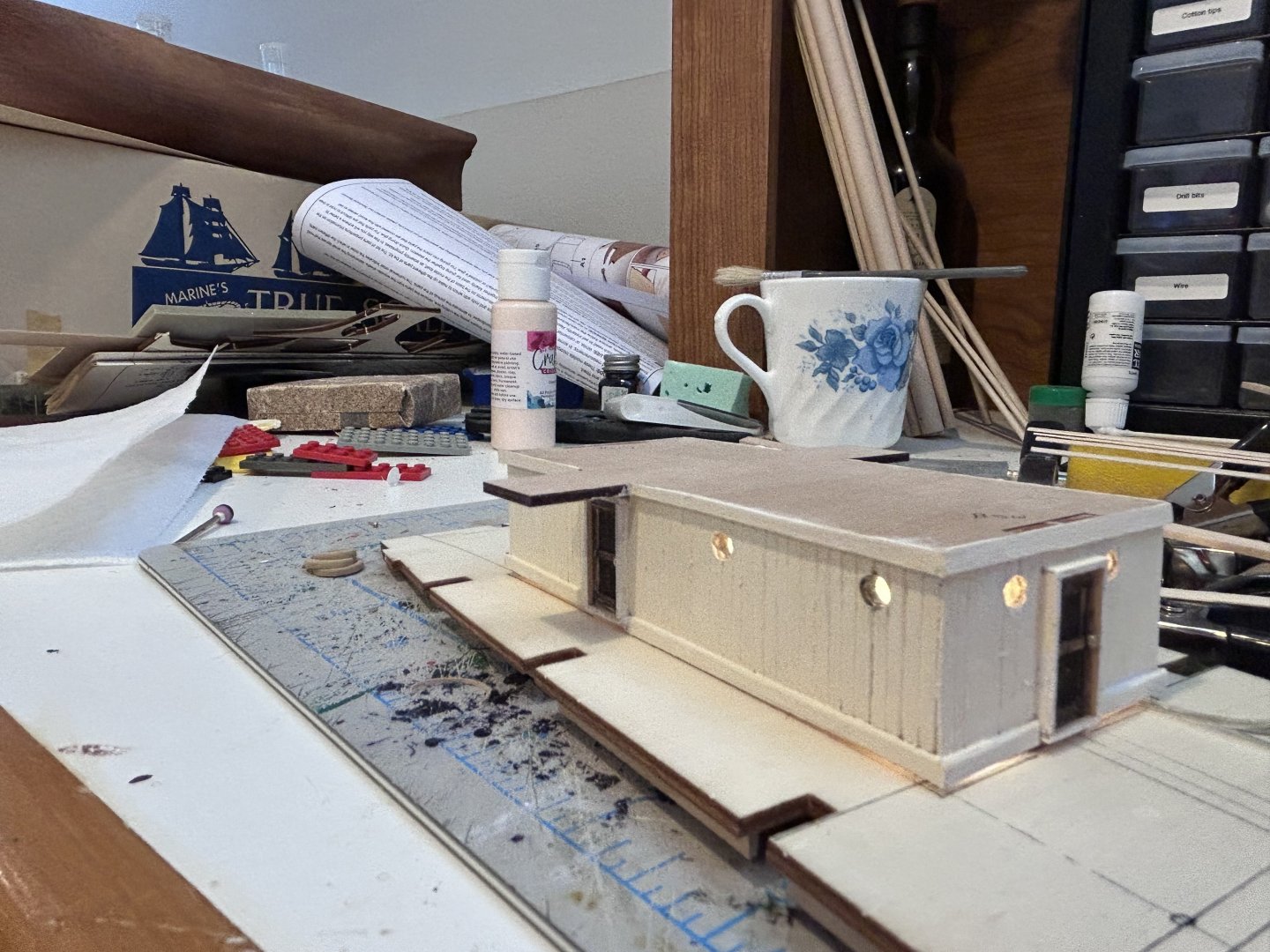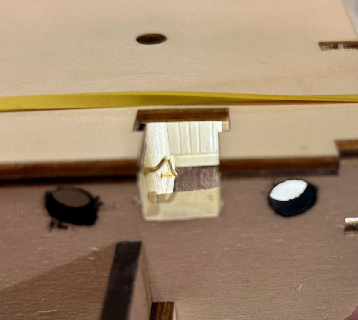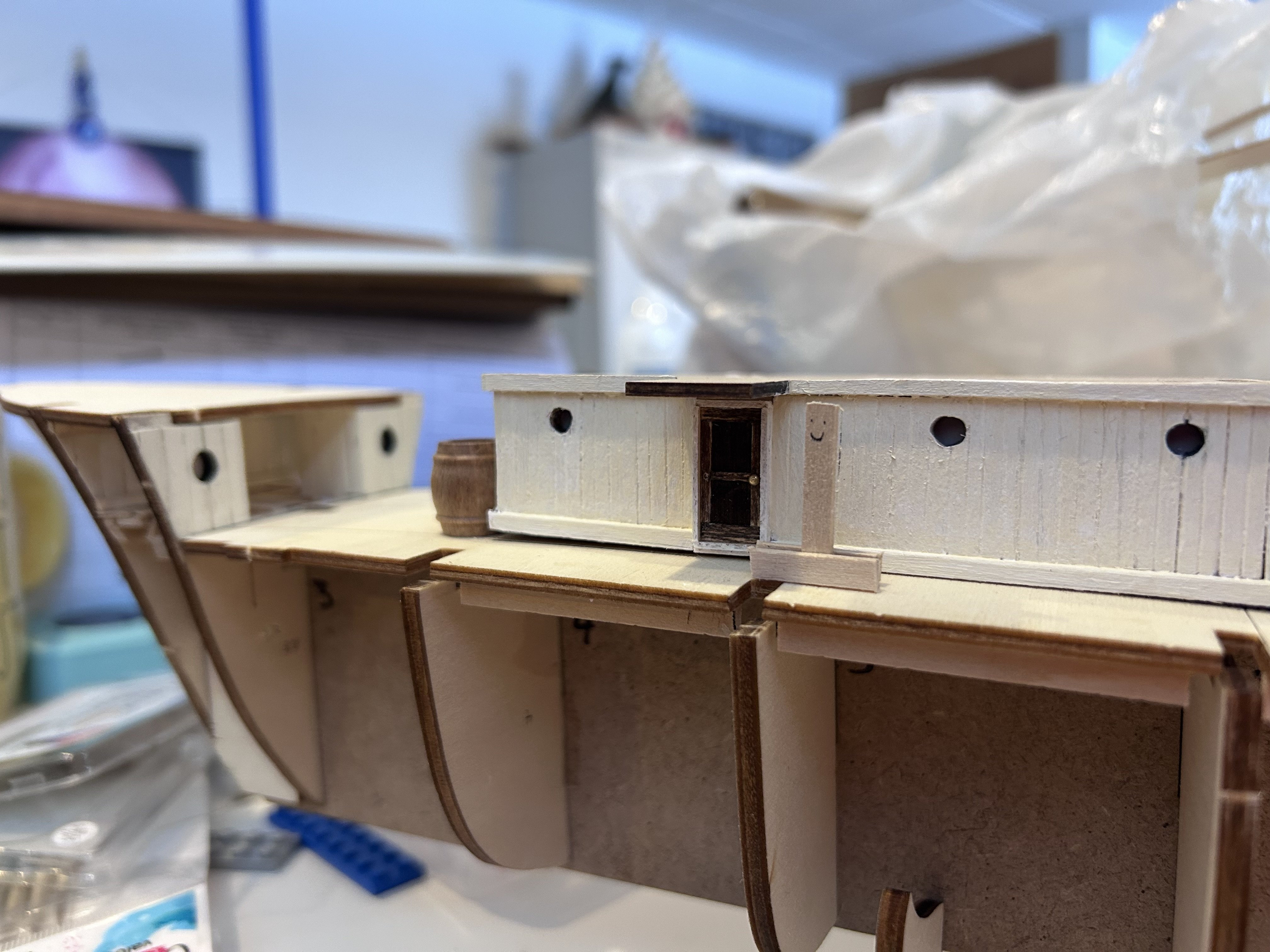 A significant update since my last check-in. I knew as I was building the main galley that I wanted to go with the stripping as seen in builds like @MarcinPrzybys, and so after doing some file work on each plank supplied I think it came out to something that looks much superior to the flat boards the instructions would have me go with. I should also mention that I made each door myself rather than use the supplied brass doors as I think this gives it that much more texture. You’ll notice around the doors there are frames as well, I’m not totally sure this would be accurate to the ship BUT given that ships of then were the precursors to ships of today I thought it would make more sense for the doors to be framed (and especially not flush with the deck) as this would better allow for battening in severe weather and would likewise keep water on deck from getting through the doors. All of this also allowed me to do a test run of the lighting I’ve decided to commit to though jury’s out on exactly what I plan to do for my lighting system, I’m currently using fairy lights but I’m really not sure as to the long term viability of these as opposed to something more heavy duty. Ah well, the point is that it’s a good test to see how it looks for now. So, here’s where I’m left having to decide whether or not I want to do a rough interior to the galley that would be visible from the hatch that was added as the ship neared Antarctica that has been the subject of much debate among other builders. I plan to cut a hole into the ceiling of the galley but I’m currently debating as to whether I want to commit to creating an interior or if I just want to put more of the opaque material in that I used in the portholes (cricket printer material makes for great lightbox windows for the record). So I’ll actually throw that question out to anyone who might be following. I know the answer will likely be “it’s your build” but I’d love to hear other thoughts. Really I’d just be furnishing as far in as one would be able to see looking through the above hatchway but being as I’ve found a flooring pattern that looks close enough to the pattern used on the ship itself I think it’s another one of those things that would make for a fantastic addition. Running total: 25 hours Scale check with Woody, a scale version of a 6’ tall person.