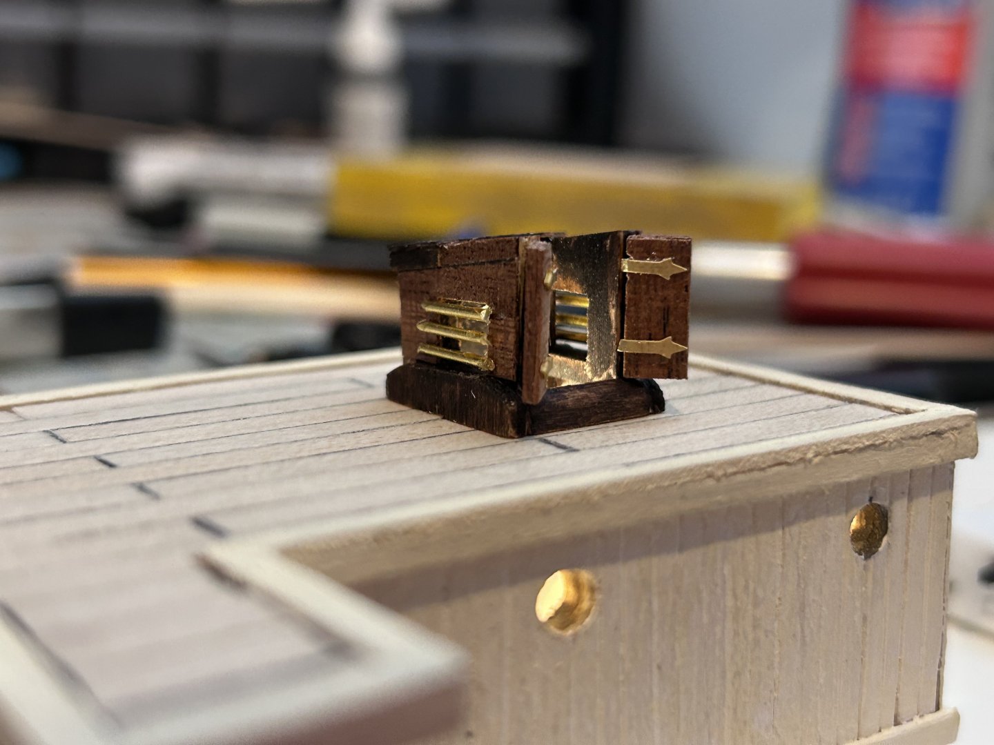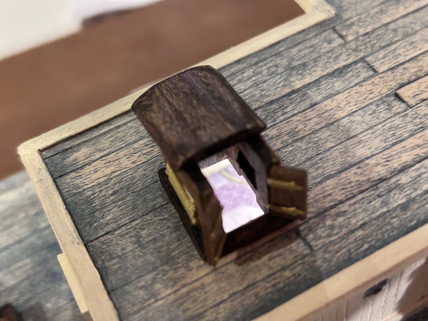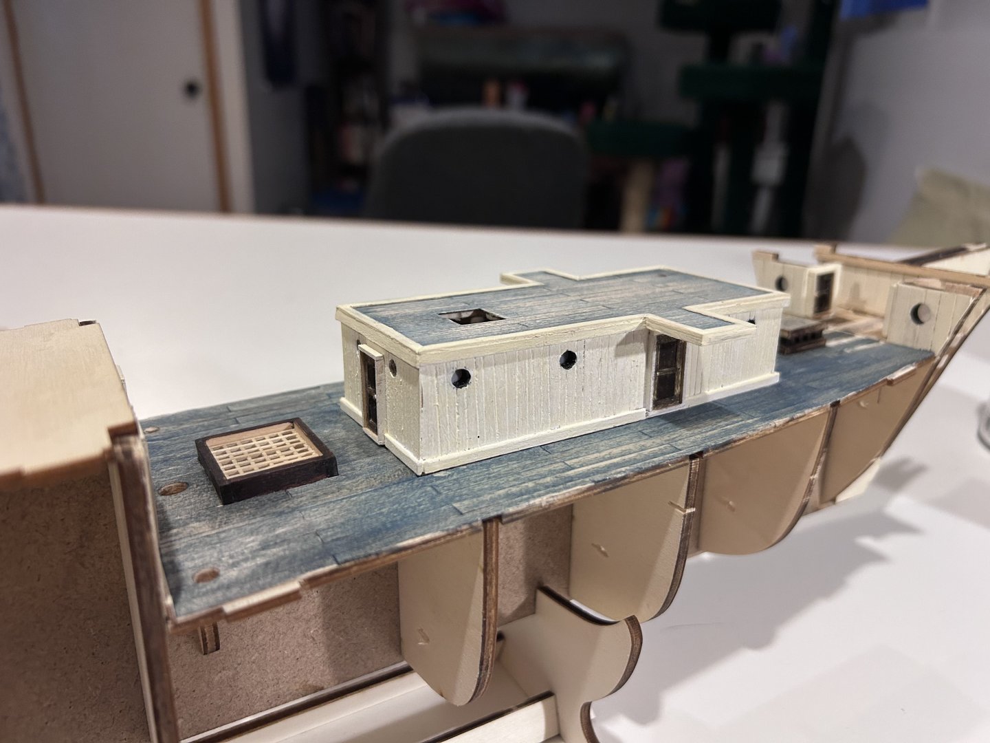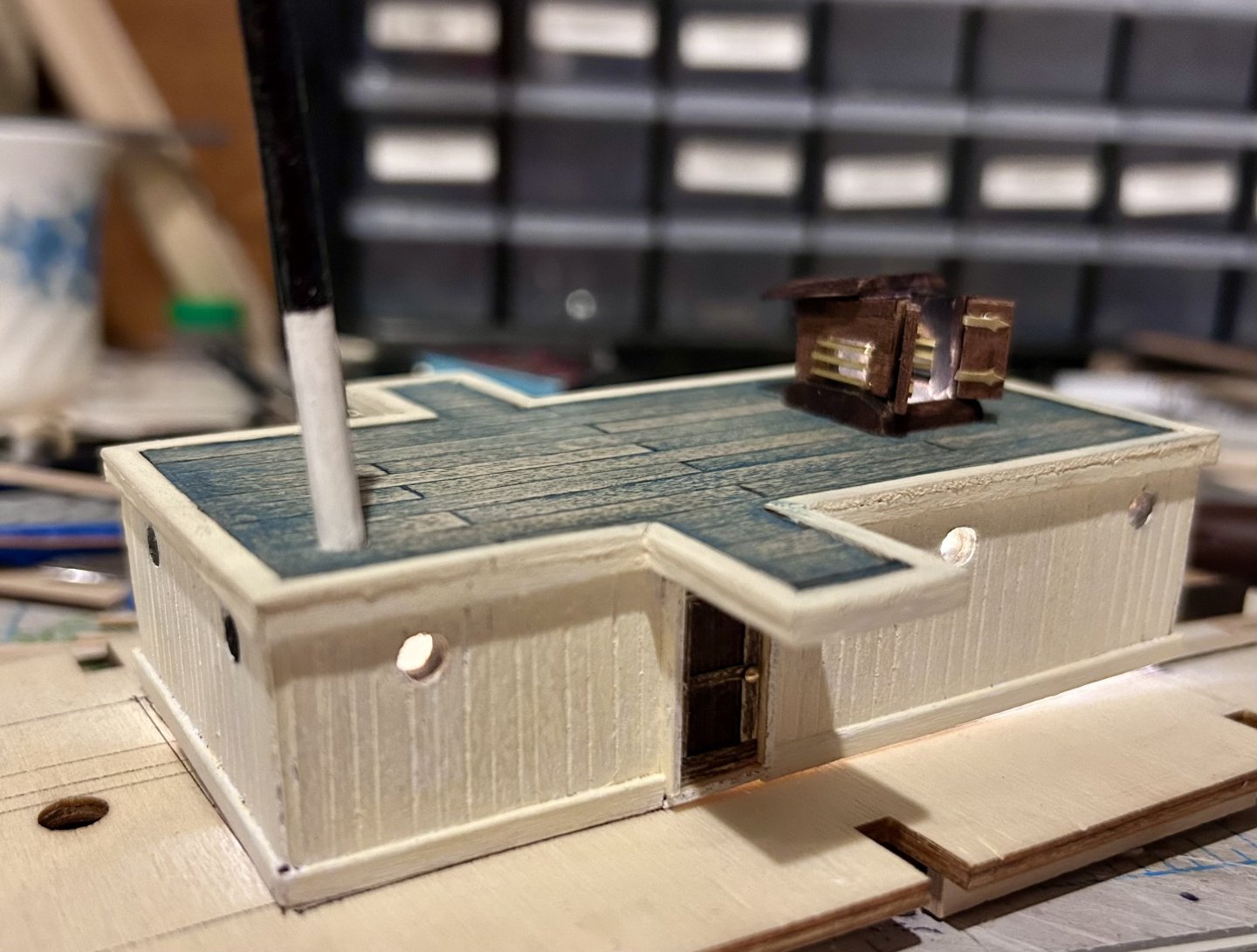 Galley roof planked. Hole cut for skylight/hatchway. 3d printed windlass ordered. After some searching online I finally tracked down a windlass that’s probably about as close as I’ll come to a period accurate windlass. This one, steam powered, is based off a 1914 German ice breaker and… yeah that’s about as close to perfect as I can ask for. If anyone’s interested you can find it here: https://cults3d.com/en/3d-model/game/icebreaker-bow-windlass-print_rc_dream