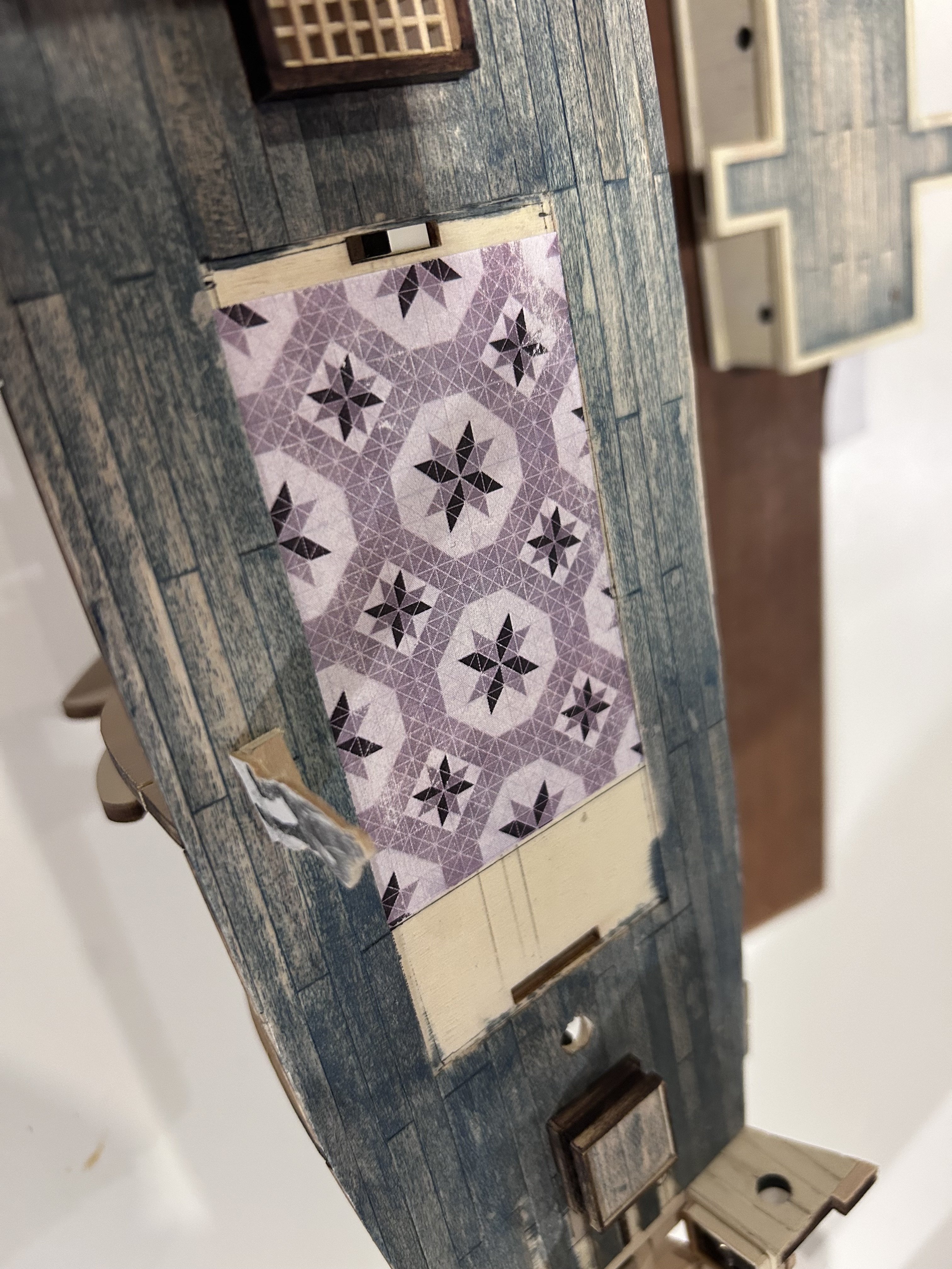 Update on the windlass and lamp rooms: I’ve shingled the inner walls and plan to paint them white. I’ve painted the interior of the portholes gunmetal grey to simulate metal. I have opaque tracing paper coming to line the porthole interiors so there will be light that can come through but not enough to see inside. I have a set of fairy lights coming with 20 lights. This number will be enough to light each room and porthole and provide the needed effect I’m looking for, as you can see in the lower left of bulkhead A3 there’s a hole drilled through which will be used to feed the lights through. Work time today: 4 hours Total time: 10 hours
