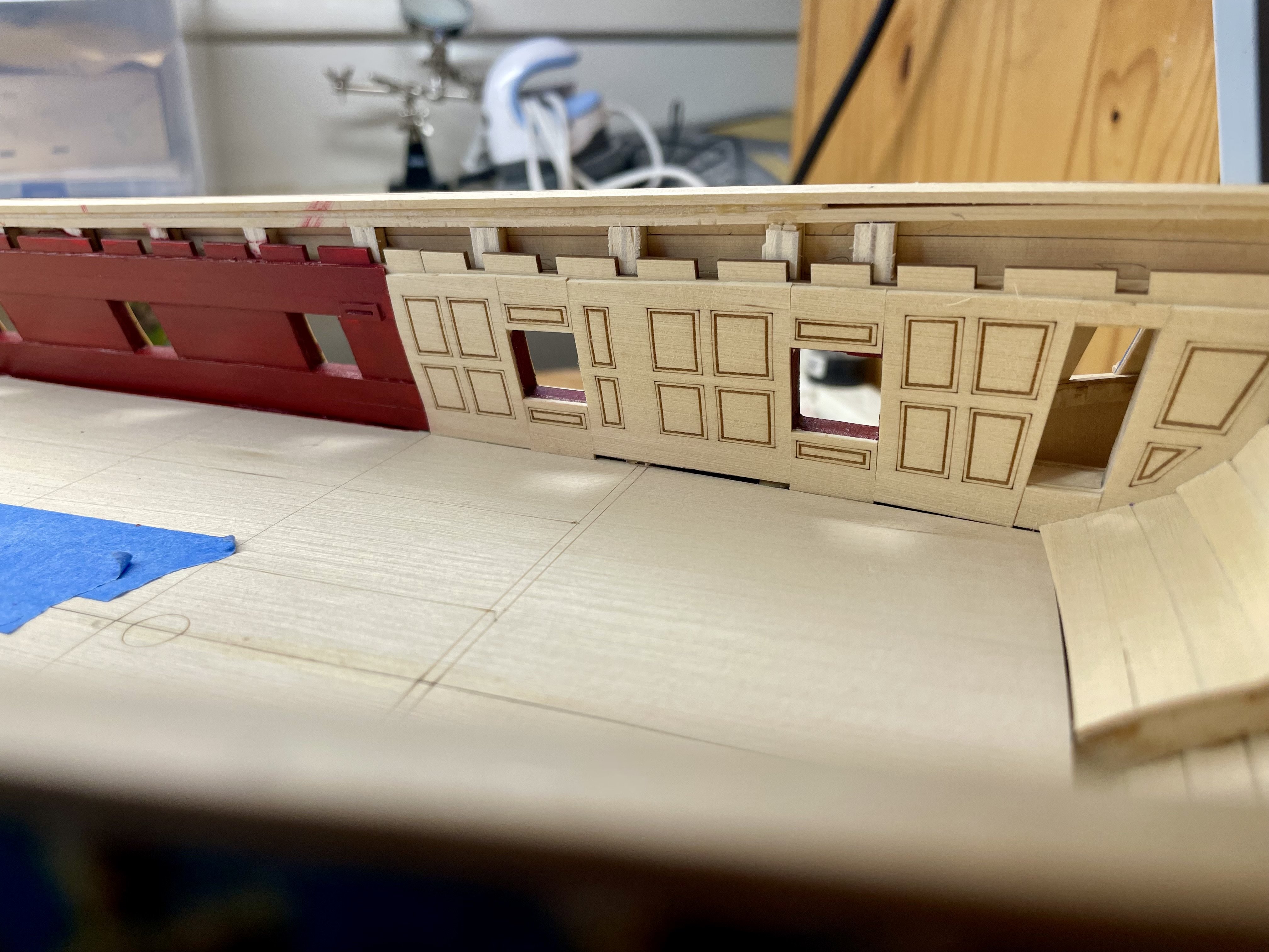 7. Chapter 3 is now complete, took about 6 weeks to work through it. I had a lot of fun learning how to create and use scrapers for the first time to make the fancy moldings. It was very satisfying to work through this chapter as almost every part added brought the exterior of the model to life. However my patience was tried more than once with all the tiny pieces involved in the tops and bottoms of the fluted columns. QG shots showing the now complete look with the rails in the roofs added. I will likely come back and add fancy molding above the windows once I permanently install the windows much later in the build. Right now they are just placed in position with friction holding them in. Included previous picture of the complete stern. And some pictures along the sides of the hull. I've known that my gun ports are slightly high since I completed chapter 1. The friezes and moldings worked out but I will have a little more work cutting in relief for the gun port hinges into the molding on a couple of these in future. I also placed the joints in the upper molding at the catheads on the bow and at one of the swivel gun locations at the stern. You can also see where the channels will be located. Another minor mistake from chapter 1 is that the bollard timbers are a little low. I lined up the opening for the bowsprit with the top of the stem in chapter 1 which ended up being a little low. I ended up removing a little material from the bottoms of the timbers when I should have just left it alone. The bottom side molding therefore lands a little high on the bow. Only those who know what it should look like will ever be able to tell. Now on to chapter 4 Steve