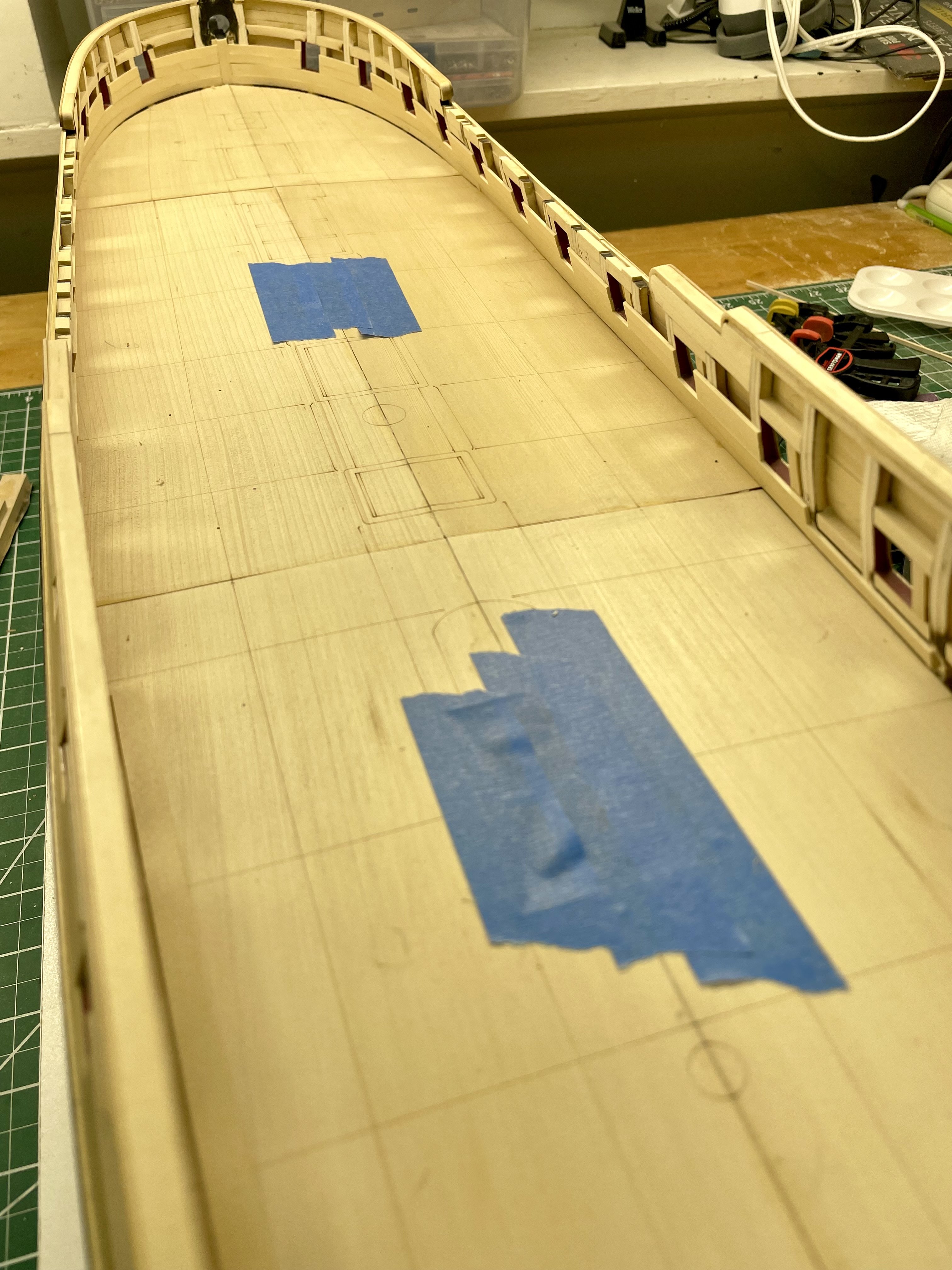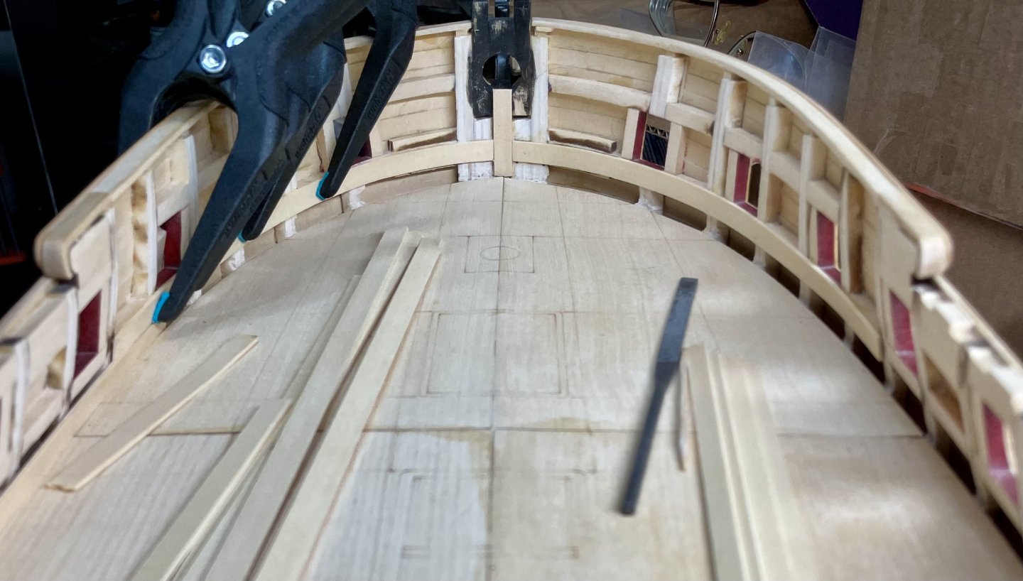 Once again, thanks for the positive comments and likes. And now onto chapter 4. Pretty basic stuff this week with the first few steps of chapter 4 leading up to the installation of the false deck. Added the two sub decks and the beams. I applied one coat of matt water-based sealer to the sub decks to test out if I liked the look. Weighing using a matt finish on the deck, or just keeping it completely natural. I would like to seal the deck planking with something but don't want it to be noticeable. At this point all beams are only dry fit. You can also see the center line I ran the length of the deck. Next was dry fitting the false deck sheets. As I placed the sheets and got them aligned, I followed Chuck's suggestion in the directions and drilled & pinned the pieces in place. All of this still only dry fit. Then it was time to pull it all apart and glue the beams and false deck permanently into place. I ended up adjusting almost all the beams again during final assembly as everything was still just a little too tight and was pushing some of the beams out of alignment. I was able to install the false deck one piece at a time relying on the pre-drilled pin locations for alignment. I used several 1 Kg bags of shot to press the deck pieces down while the glue set. Current state of things. The bow filler pieces are installed. I'm doing one last round of fairing prior to starting on the inner bulwarks. Steve
