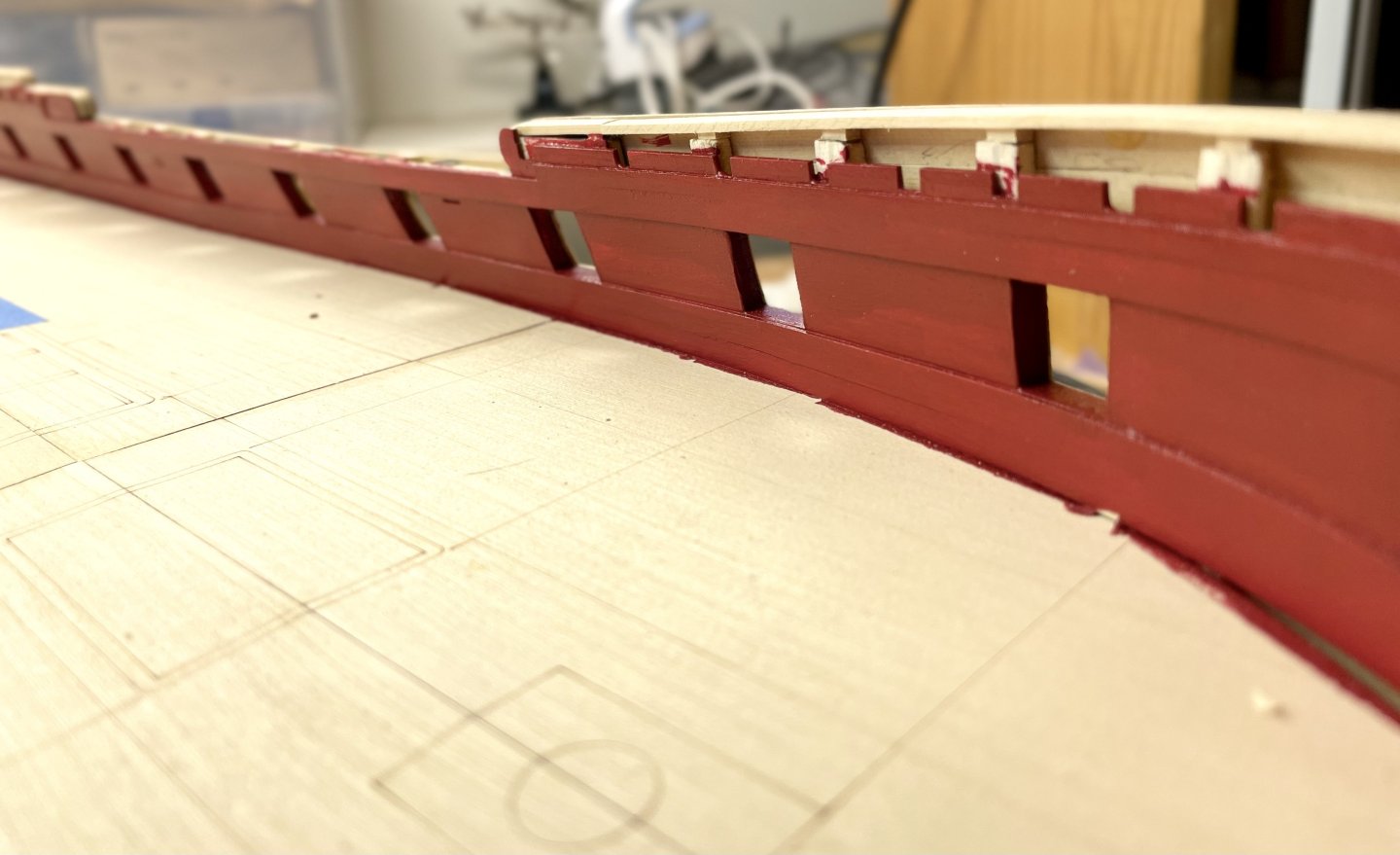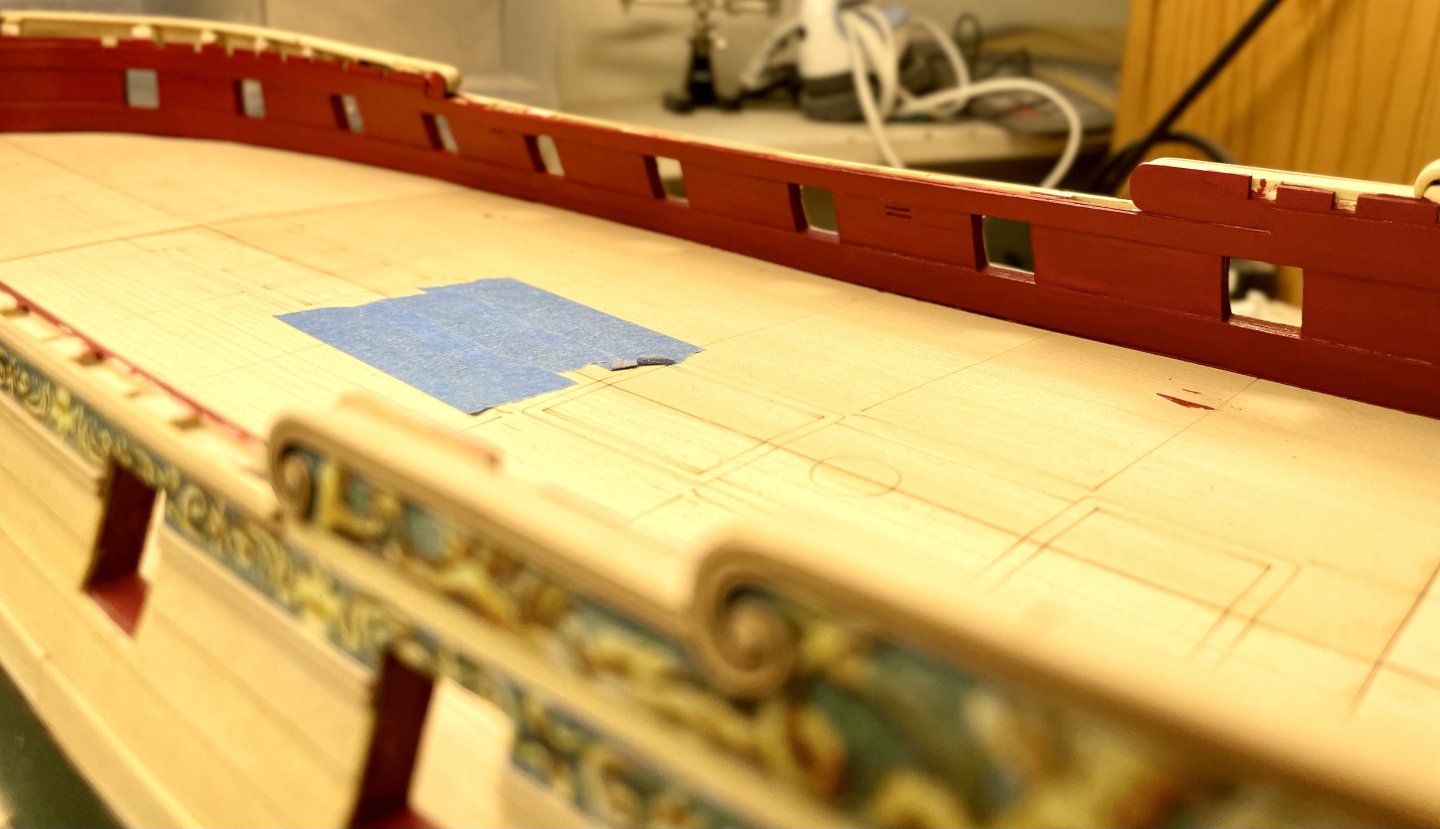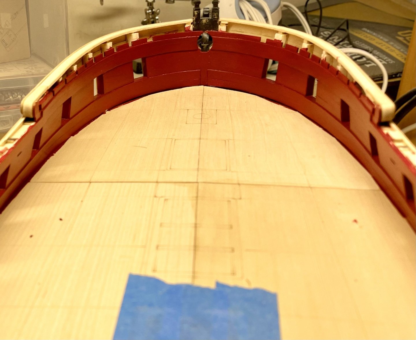 3. This update is about a week later than I anticipated but still making progress. First of all, forgive the bad color balance on this series of photos. I upgraded my phone to iOS 26 and it seems to not be the same any more when it comes to automatically color correcting for the fluorescent lights on my workbench. I'll figure it out eventually. I have the first layer of inboard planking completed and in the process of installing the deck clamps now. View of the bow, rough sanding is completed and the forward deck clamps will be installed tonight. I wet the deck clamps and clamped them in place overnight to set some of the curve into them. Will use some heat per Chuck's instructions during the final install. Looking aft, in the process of dry fitting the deck clamps and checking the placement of the deck beam at the beginning of the paneling. Closer view of checking both sides for equal alignment of the deck clamps. There are some rough spots in the first layer of planking and I'll smooth these out a little more, but they will be covered with the panels and the second layer of planks anyways. Dry fit of the panels checking to see how much work I'll have to fit them between my gun ports. All looks good with a little material to be removed width-wise on all the panels. So it looks like my gun ports are in the right places. Good to know... And where I stopped last night with the aft deck clamps glued into place. Steve