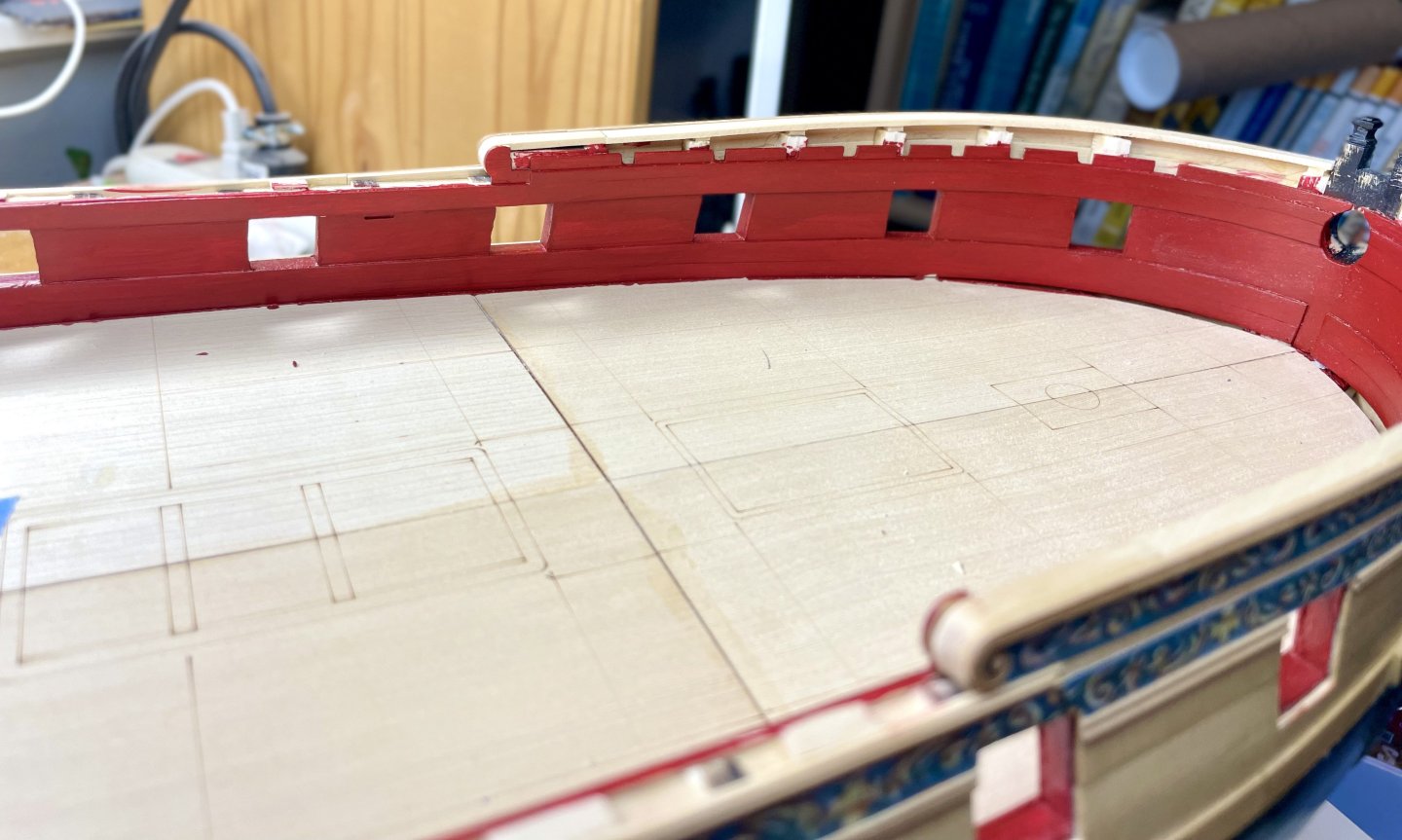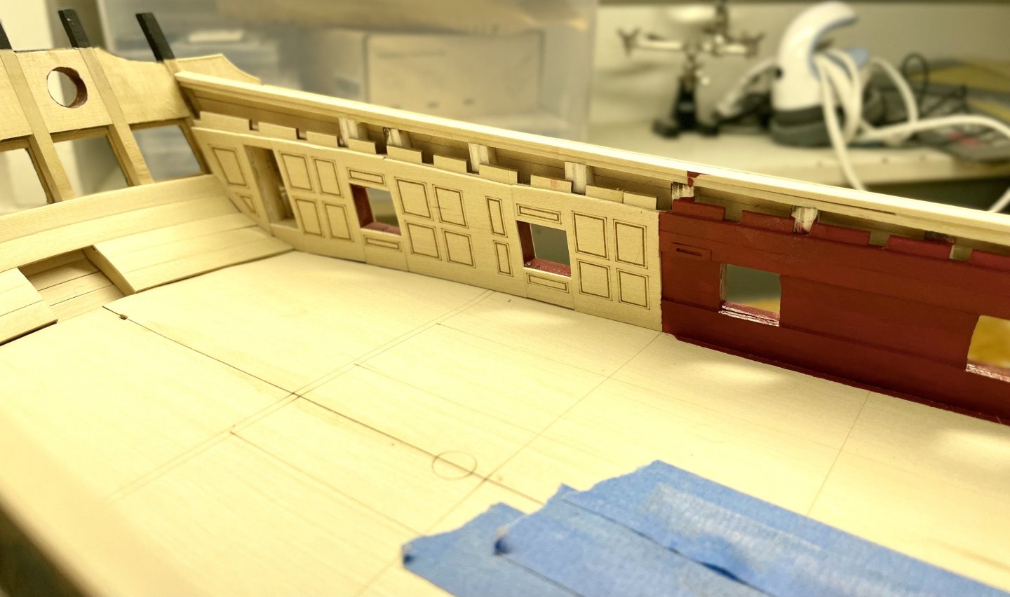 2. Making good progress the past few days. Paneling in the captain's cabin is installed, second layer of planking on the inboard bulwarks is complete up to approx. midships, and I've started dry fitting the planks for the inboard counter at the stern. Completed installing the deck clamps up forward and fairing the planking. Prepared for installing the paneling by painting around the gunports and at the forward edge of the paneling. View of the completed work. The inboard counter planks are just roughed to approximate shape and dry fit for the moment. More fitting work is still needed. But first I'm going to complete the inboard planking up at the bow and then paint the bulwarks. Steve