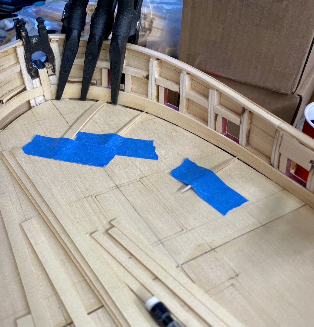 A brief update of progress over the past 10 days or so. Things have been a little slow but hoping to be able to spend some solid time on this over the weekend. Almost half way into planking the inboard bulwarks. I figured the most critical plank placement was the plank immediately below the gun ports which needs to align with the bottom of each port so I started there at the bow. I then added the bottom plank tight against the one already placed. Used some scrap and some toothpicks as levers to apply upward pressure while the glue set. And continued from there working aft. Nothing has been faired yet. Figure about another week of work to wrap this up. The second thinner layer of planking will hide some of my sins on the lower planks where I over-faired the bulwarks down close to the deck. Steve