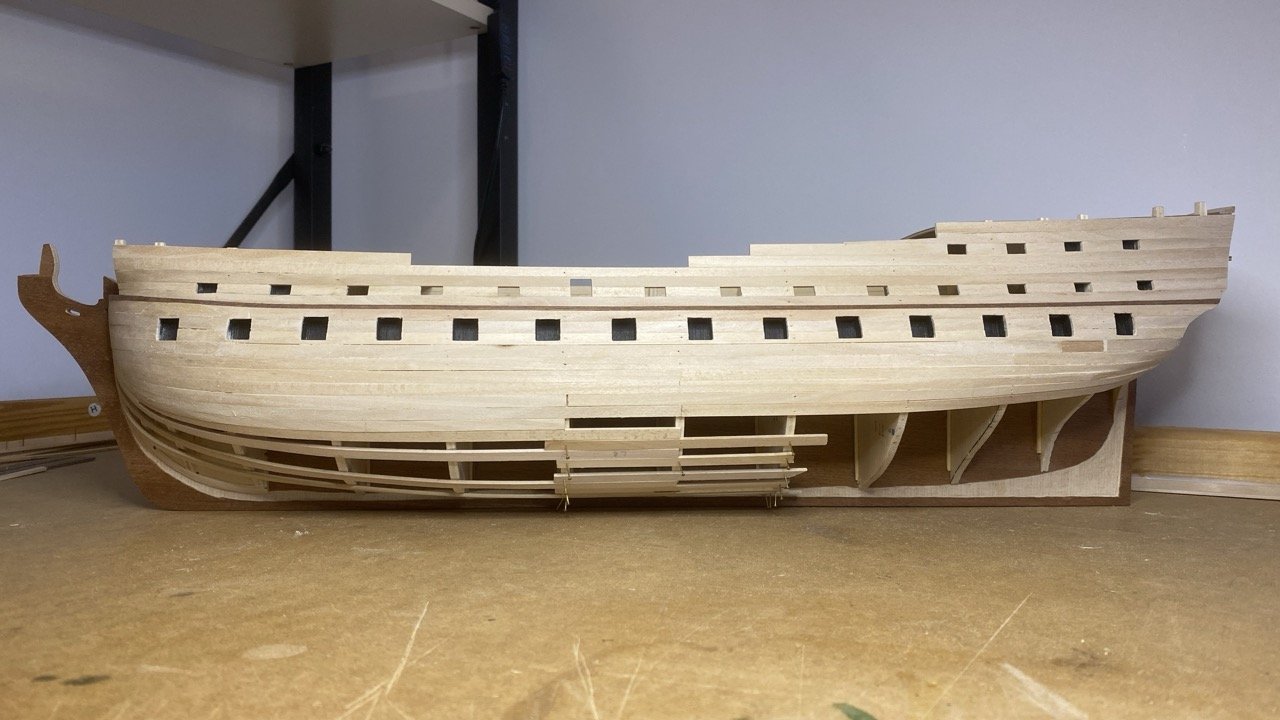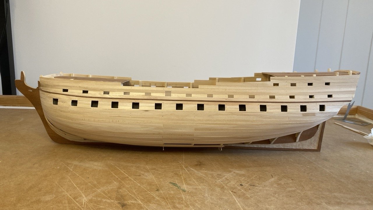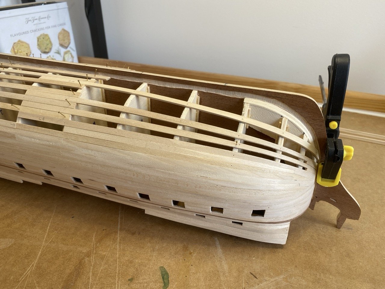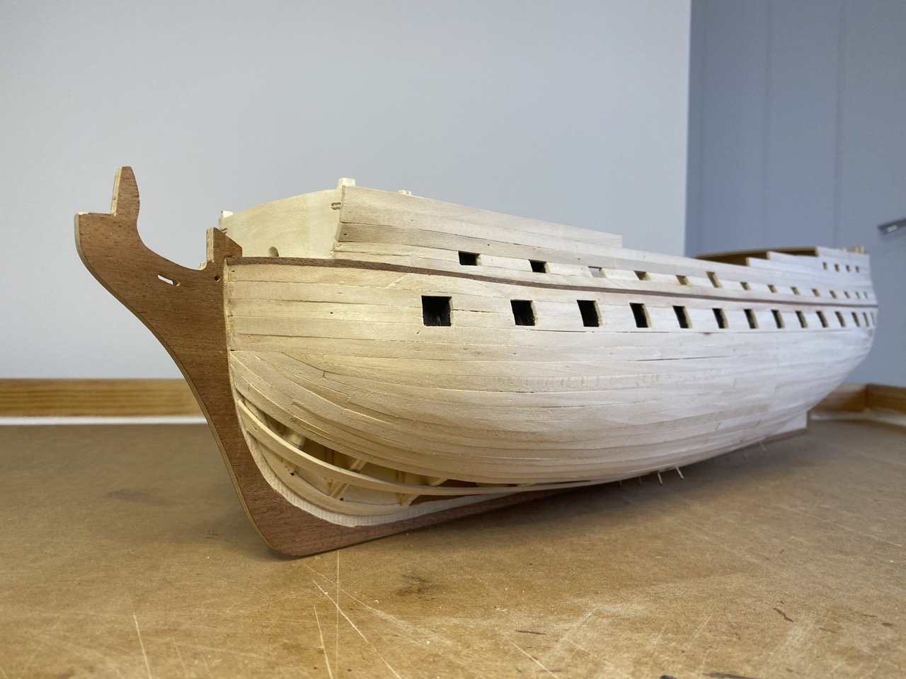First layer of planking underway, with a few interesting decisions and discoveries along the way. I put the first plank on in accordance with the plans. After the glue dried I decided that it was a little bit too low around the third and fourth bulkheads so rather than lift the entire plank I just sawed through it along the centre of the fifth bulkhead, lifted the plank from the 3rd, 4th and 5th bulkheads, and re-glued the plank slightly higher than before. This worked fine and gave a better line along the plank. I then tested where the other planks would lie and realised that the barrels of the canons on the main deck would be hard up against the top of the gun ports after fitting subsequent planks, so I inserted a length of 2mm x 2mm wood above the first plank to raise the subsequent rows of planks above the decks. I had some spare 2x2mm wood from a previous kit, seen in the darker colour on the photos. Planking in the upwards direction was then reasonably straight forward. I deviated from the instructions when fitting the half gun enclosures. The instructions said to fit planks 30a & 30b 10mm apart, and similarly with planks 30c & 30d, and also 30e & 30f, and to then glue the gun enclosures behind those planks. I didn't fancy doing this on the concave hull surfaces as I thought it could make fitting the in-between planks challenging and also a bit awkward for filing the middle region of the edges of the gun enclosures to match the profile of the hull. I also didn't fancy doing it on the convex hull surfaces as this would likely leave a gap between the half-gun enclosure and the protruding hull planks. So in each case I decided to fit the gun enclosures to the first plank (having bevelled the edge to make the gun enclosure proud of the hull for the remaining planks) and then shape the enclosures to the hull and add the remaining three planks per gun-port successively. This then makes it very easy to saw the first half of each gun port using a modelling tenon saw because there aren't any other planks to get in the way. To be honest this deviation from Corel's instructions has worked out quite well, so no real regrets about this decision. One final thing to note is that having fitted plank 30a in accordance with Corel's instructions, I found that the main deck gun ports would be significantly lower than the two stern chaser gun ports, so I've decided that I will cut the main deck gun ports 2mm higher than indicated in the plans. This will also then give a more uniform height spacing between the three rows of gun ports, and effectively compensate for the addition of the 2mm x 2mm strip mentioned above. This kit is proving quite challenging - I suppose because it's only my second build - but I'm enjoying it which is probably what matters most 🙂 N.B. in the last photo you'll spot that I extended the two upper gun ports in the downwards direction instead of the correct upwards direction... oops! I later glued in some filler plank sections to correct this.
