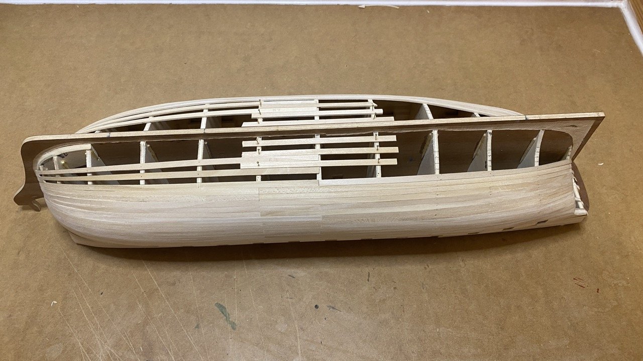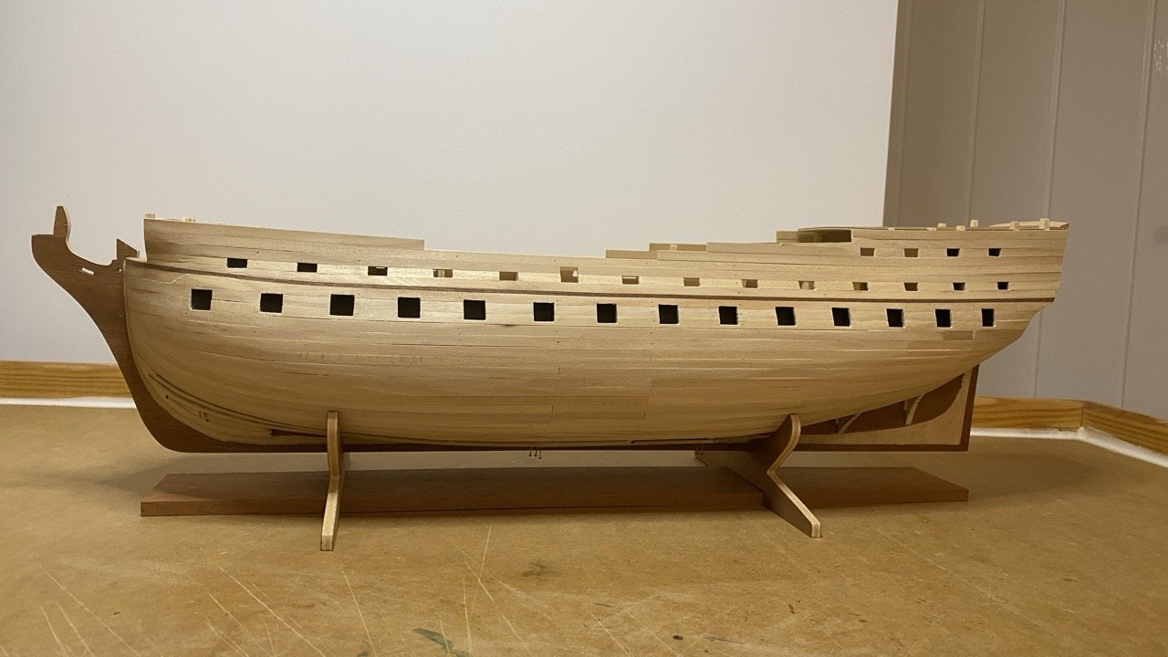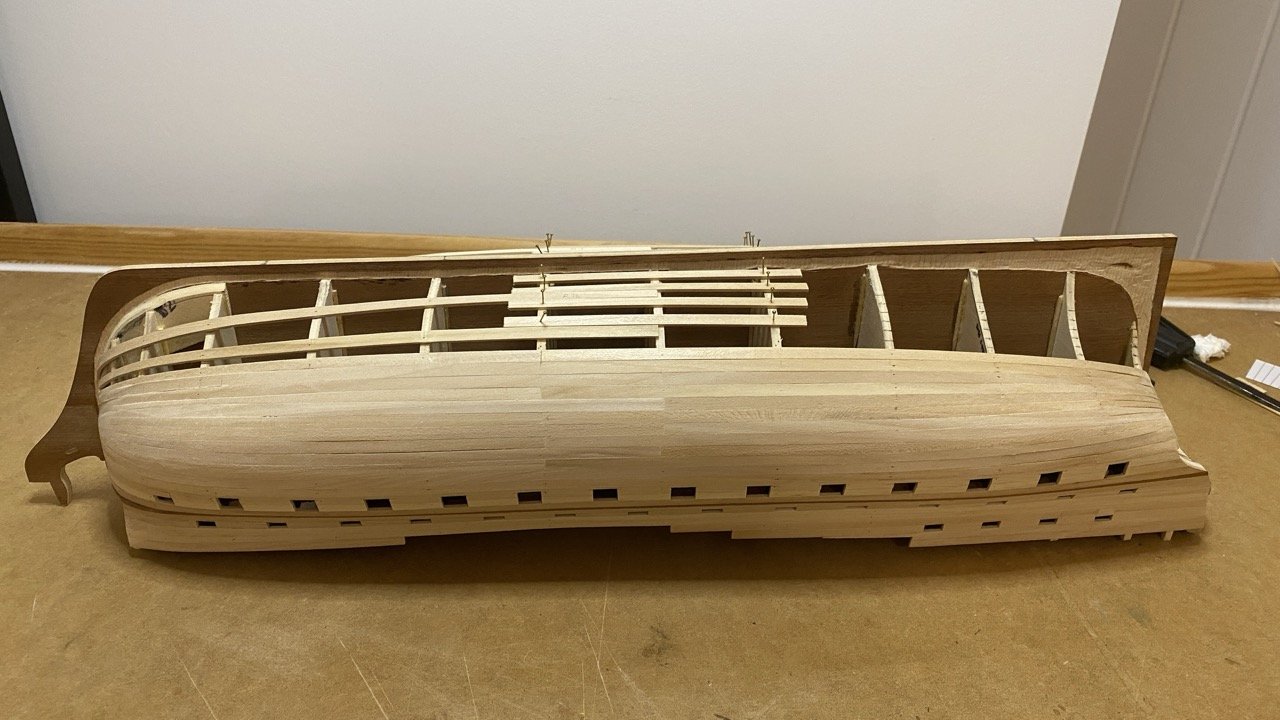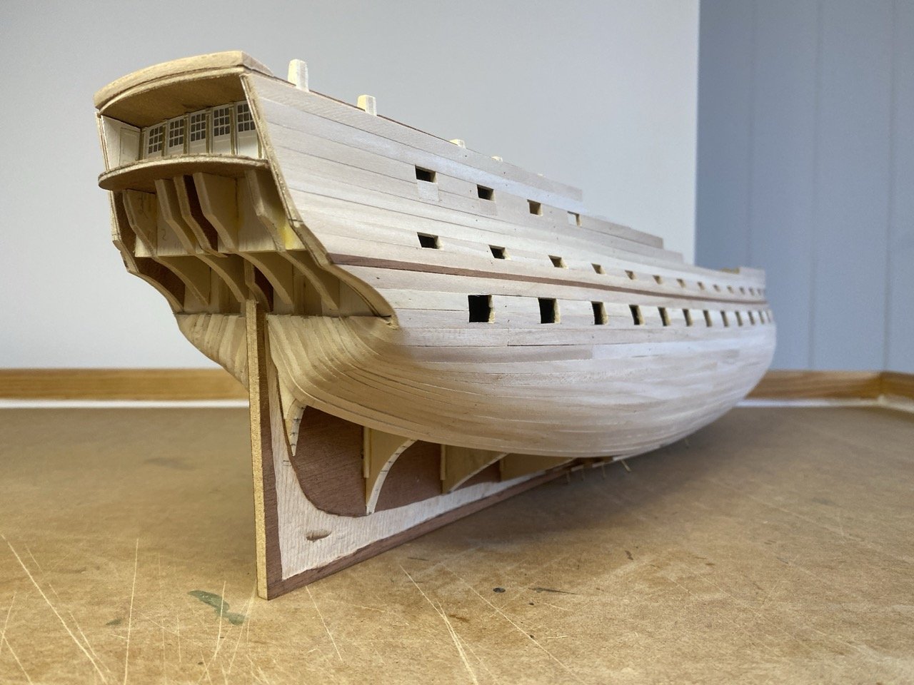 First layer of planking underway, with a few interesting decisions and discoveries along the way. I put the first plank on in accordance with the plans. After the glue dried I decided that it was a little bit too low around the third and fourth bulkheads so rather than lift the entire plank I just sawed through it along the centre of the fifth bulkhead, lifted the plank from the 3rd, 4th and 5th bulkheads, and re-glued the plank slightly higher than before. This worked fine and gave a better line along the plank. I then tested where the other planks would lie and realised that the barrels of the canons on the main deck would be hard up against the top of the gun ports after fitting subsequent planks, so I inserted a length of 2mm x 2mm wood above the first plank to raise the subsequent rows of planks above the decks. I had some spare 2x2mm wood from a previous kit, seen in the darker colour on the photos. Planking in the upwards direction was then reasonably straight forward. I deviated from the instructions when fitting the half gun enclosures. The instructions said to fit planks 30a & 30b 10mm apart, and similarly with planks 30c & 30d, and also 30e & 30f, and to then glue the gun enclosures behind those planks. I didn't fancy doing this on the concave hull surfaces as I thought it could make fitting the in-between planks challenging and also a bit awkward for filing the middle region of the edges of the gun enclosures to match the profile of the hull. I also didn't fancy doing it on the convex hull surfaces as this would likely leave a gap between the half-gun enclosure and the protruding hull planks. So in each case I decided to fit the gun enclosures to the first plank (having bevelled the edge to make the gun enclosure proud of the hull for the remaining planks) and then shape the enclosures to the hull and add the remaining three planks per gun-port successively. This then makes it very easy to saw the first half of each gun port using a modelling tenon saw because there aren't any other planks to get in the way. To be honest this deviation from Corel's instructions has worked out quite well, so no real regrets about this decision. One final thing to note is that having fitted plank 30a in accordance with Corel's instructions, I found that the main deck gun ports would be significantly lower than the two stern chaser gun ports, so I've decided that I will cut the main deck gun ports 2mm higher than indicated in the plans. This will also then give a more uniform height spacing between the three rows of gun ports, and effectively compensate for the addition of the 2mm x 2mm strip mentioned above. This kit is proving quite challenging - I suppose because it's only my second build - but I'm enjoying it which is probably what matters most 🙂 N.B. in the last photo you'll spot that I extended the two upper gun ports in the downwards direction instead of the correct upwards direction... oops! I later glued in some filler plank sections to correct this.