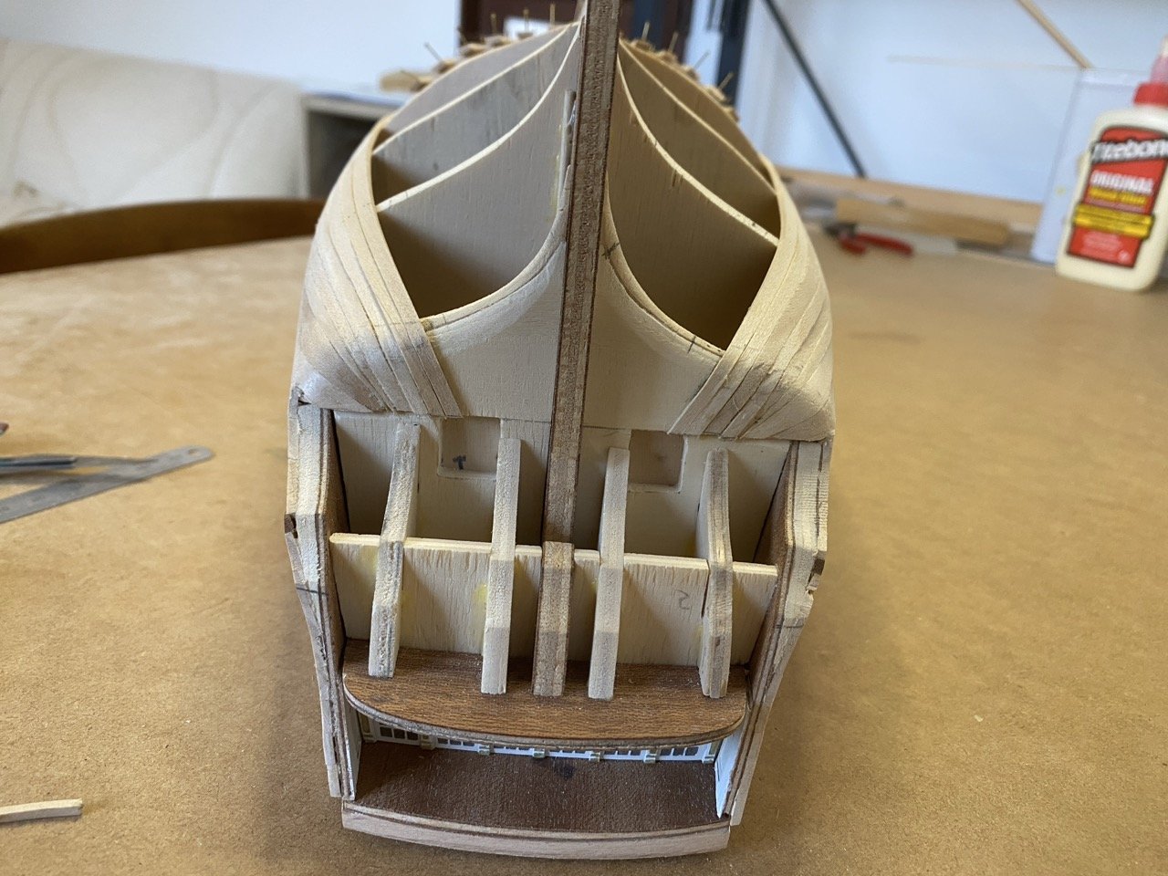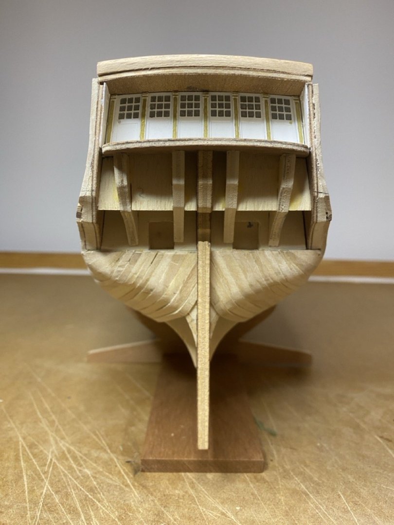 Stern Assembly (24th Jan 2025) I've been working on the stern assembly. I've left it detachable for now so that I can sand it to the desired shape without the keel getting in the way. The second photo shows the deck planking on the stern balcony. The third photo shows a few of the peripheral parts dry-fitted (i.e. without glue) to show how the balcony will look. The balcony doors and windows are made of photo-etched brass and need to be painted.