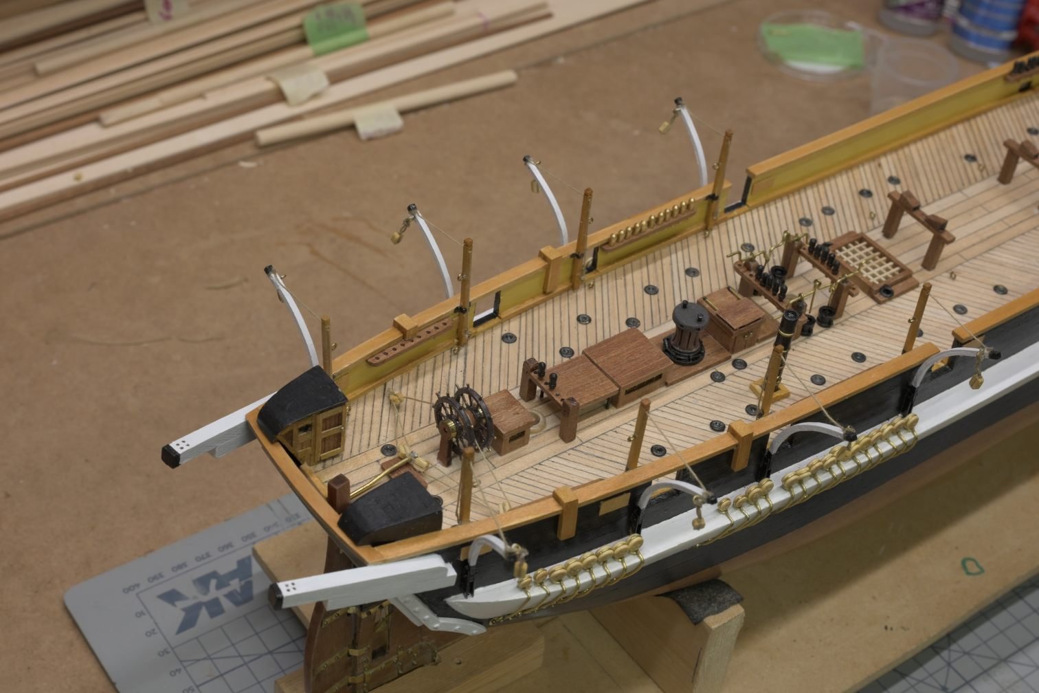 I had never looked at your Terror build, Keith, just the Erebus - Wow! So much good information and tips. Had I looked at it earlier in my build I probably would not have understood a lot of it, and since this is my first ship build I would likely have been overwhelmed! Your capstan looks great, and is along the lines of what I was thinking of attempting. Where did you get your silver-coloured belaying pins - or are they from the kit but painted that way? Just a follow up on the stern davits - as you can see in the photos I went with straight davits, no tapering, no joins. I'm happy with the result, it looks mechanically correct to me.