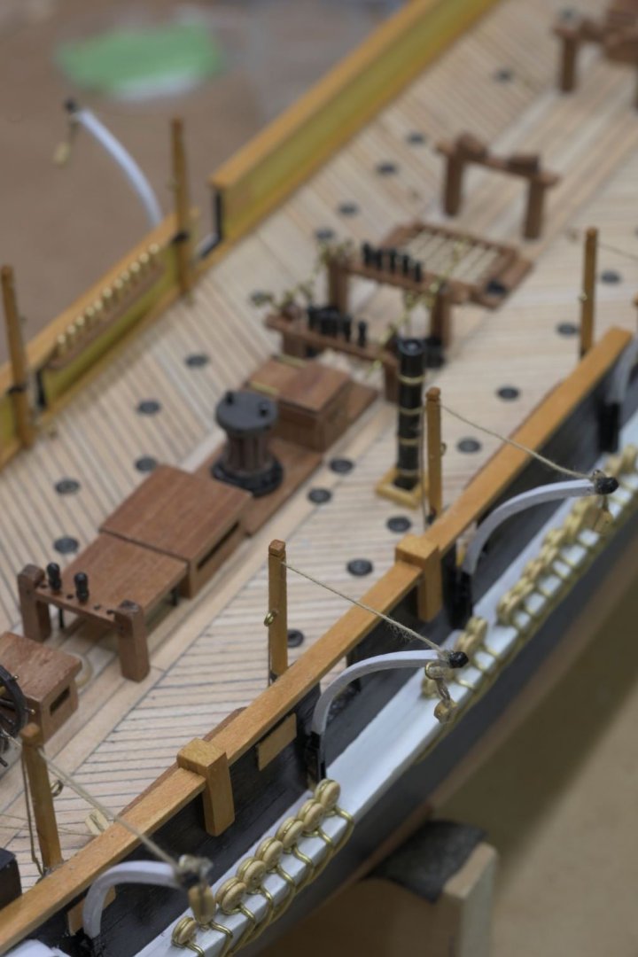 Thanks everyone for all your comments. Nothing new to report until now. There must be a better way to do the chain plates! After the first 20 I thought I should be getting good at making the brass wire parts ... but not so. It's interesting that the pictures in the OcCre instructions (and I have come to realize that they are pictures, not the photos that they appear to be) show loops at each end of the brass wire on some pictures, and no loops at the bottom end in others. Doesn't show an alternate method of fastening them though - just pins. I couldn't get them straight, consistent lengths to the bends. Ah well if I ever build another one I will invent a new approach 😬 This photo shows my version of the capstan, and the Caldercraft 10-spoke wheels installed (but not yet cabled to the rudder). On this - as on all the metal components - I am having difficulty making paint stick, even with metal primer applied. It seems ok , but if I rub my finger over it it flakes off. Is this because water-based acrylic paints are just not as sticky as the ones that fume off and give you headaches? Oh for the good old days .... I did find some brass belaying pins at a "local" supplier (Montreal - only 500 km away). I had already ordered 10 mm ones before the discussion above suggested 8mm might be more appropriate, but these ones do fit in the holes I have already drilled. They are made by Dekam in Italy, distributed in Canada by UDISCO - found them on eBay. Size is not 100% consistent but it looks like any given batch is the same.