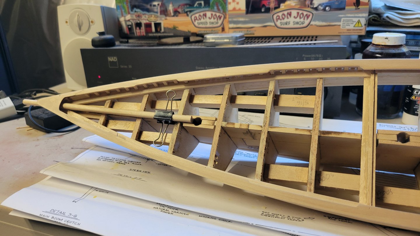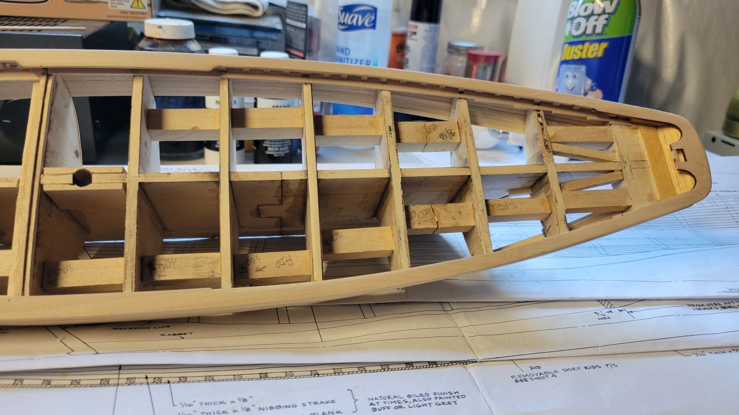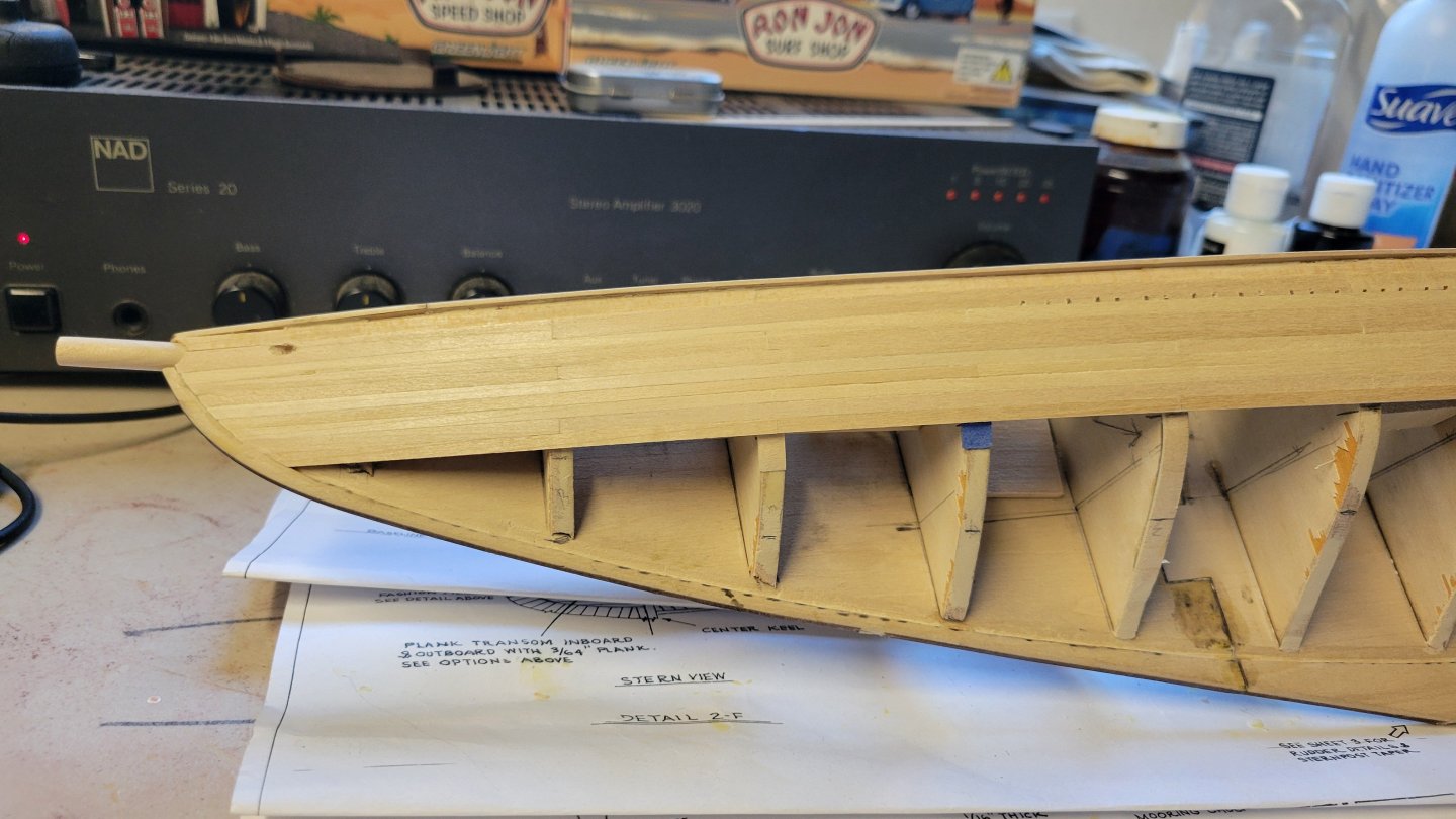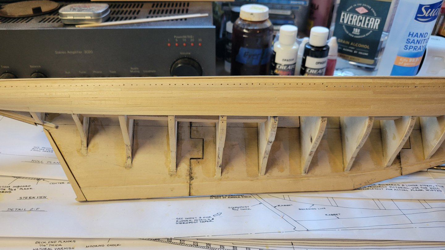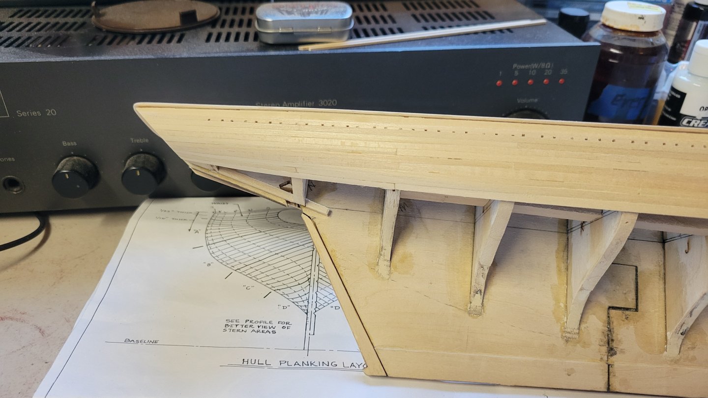 Making some planking progress. From the rail down to planking belt B. Belt A is done. Only 10,002 more planks to go. Feels like it anyway. I'm following the instructions and constantly referencing the plans. On to belt B. I think it will very "interesting" as the planks transition from horizontal to vertical at the stern. I'll have to buckle up and hang on. It's challenging but fun. Wish me luck.