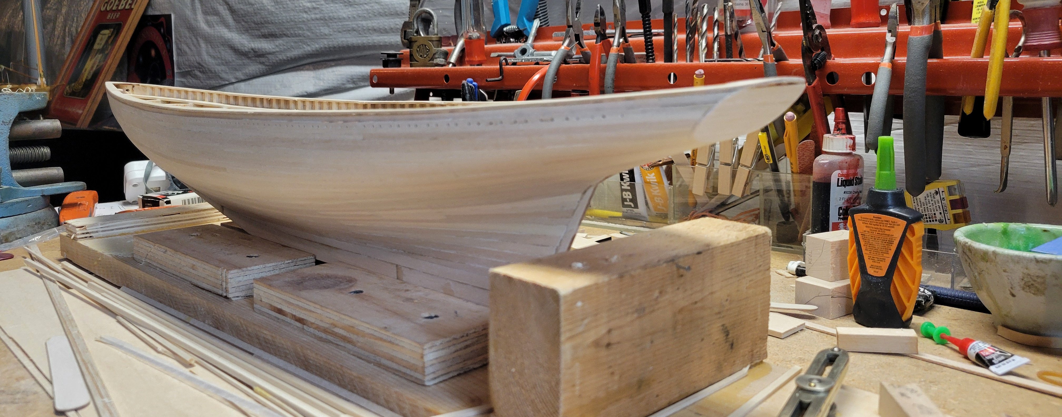 Making some planking progress. From the rail down to planking belt B. Belt A is done. Only 10,002 more planks to go. Feels like it anyway. I'm following the instructions and constantly referencing the plans. On to belt B. I think it will very "interesting" as the planks transition from horizontal to vertical at the stern. I'll have to buckle up and hang on. It's challenging but fun. Wish me luck.