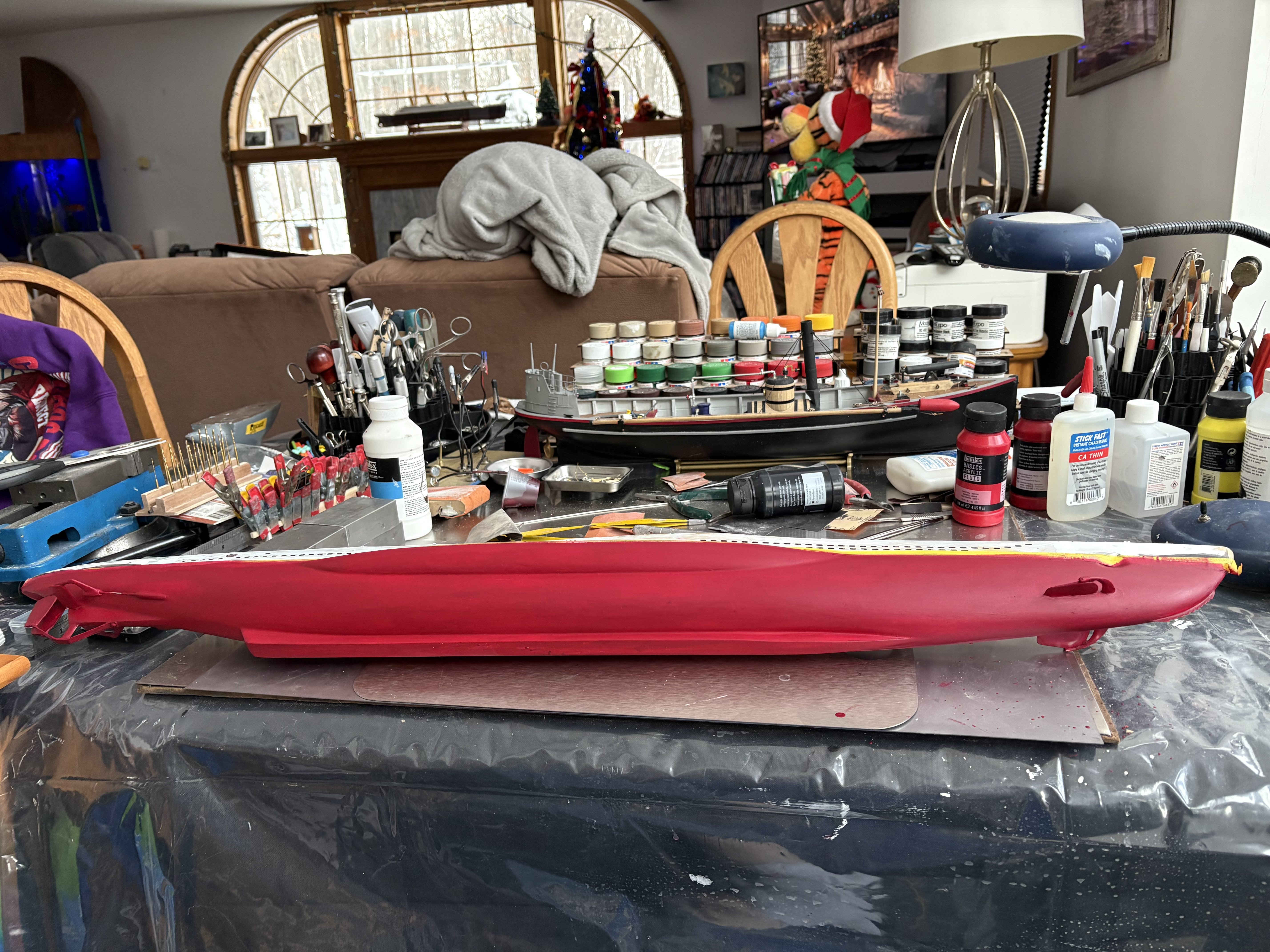 Good Morning to the crew. It’s going to be a great day we are finally ready to prime the hull with Liquitex Gesso after touch up with red spot putty and fine sanding. Update you all after priming. The Admiral