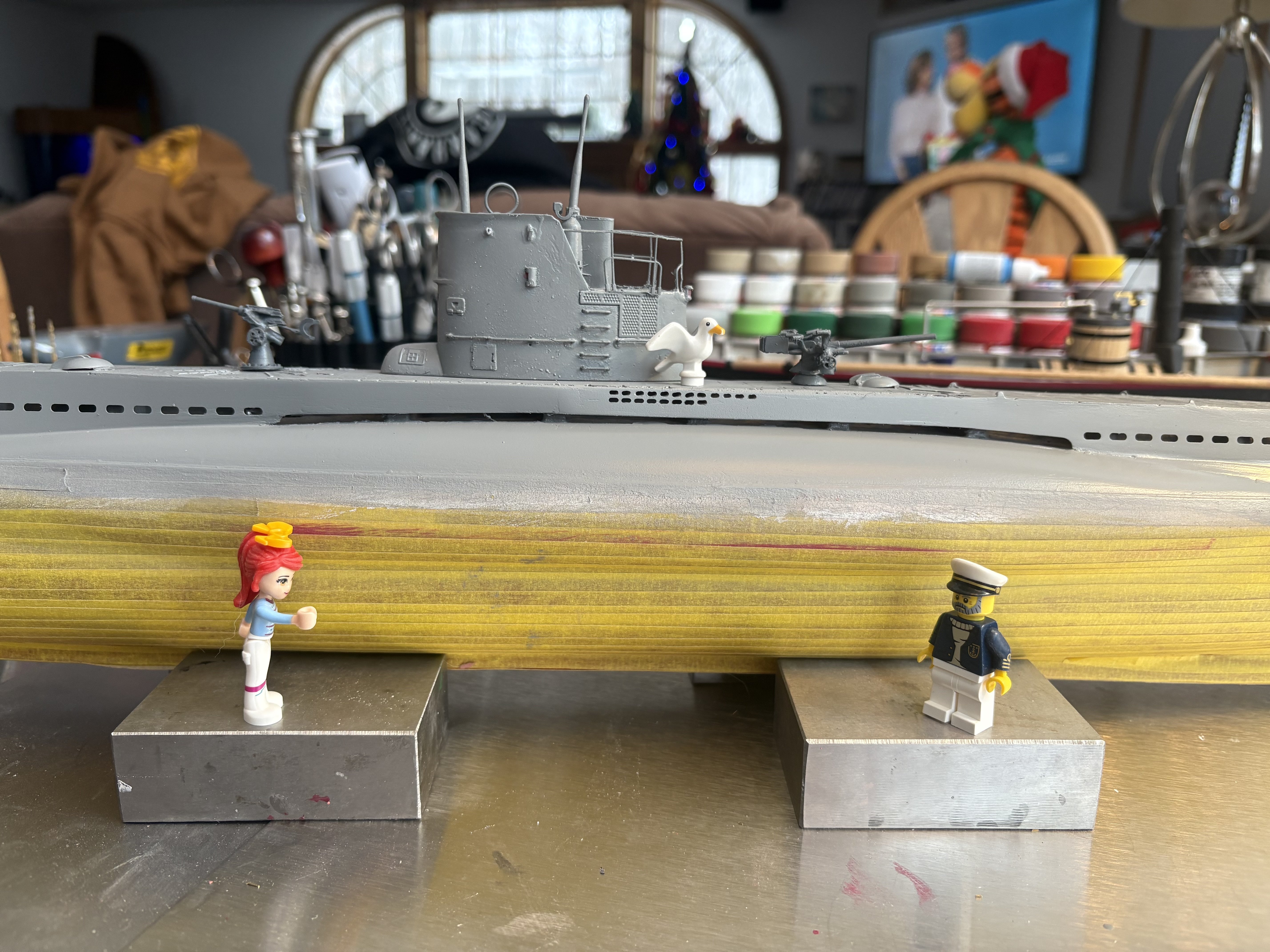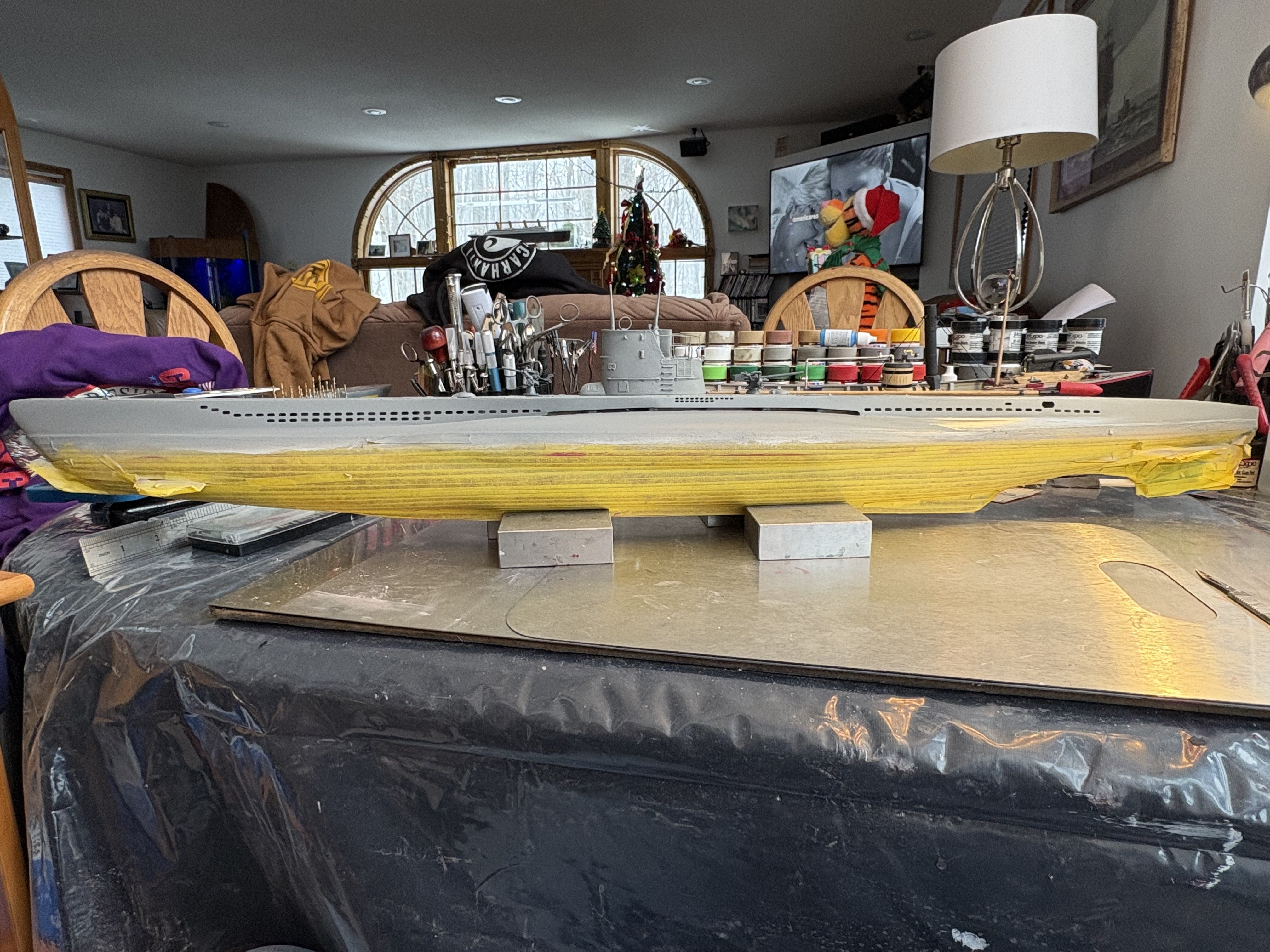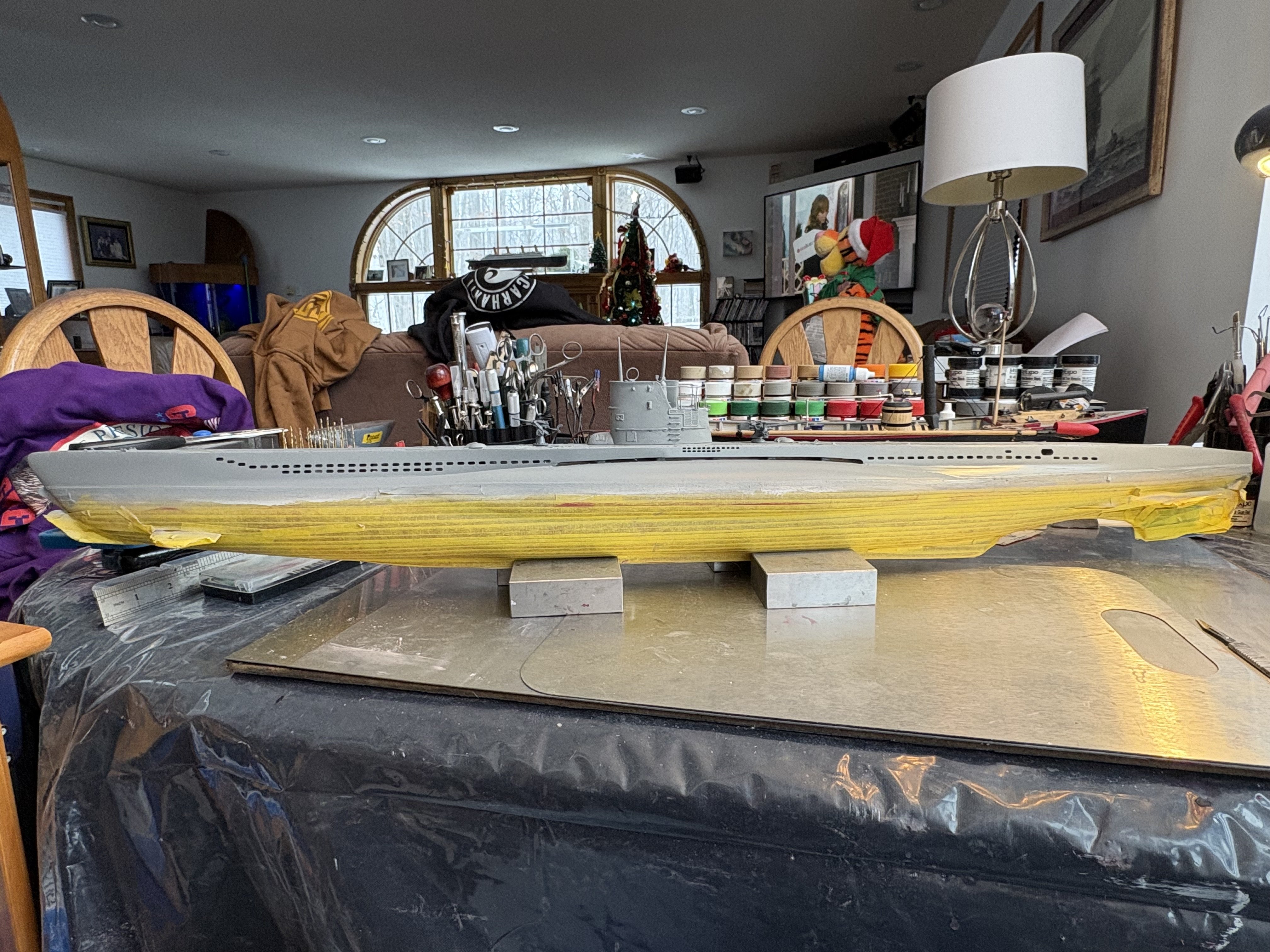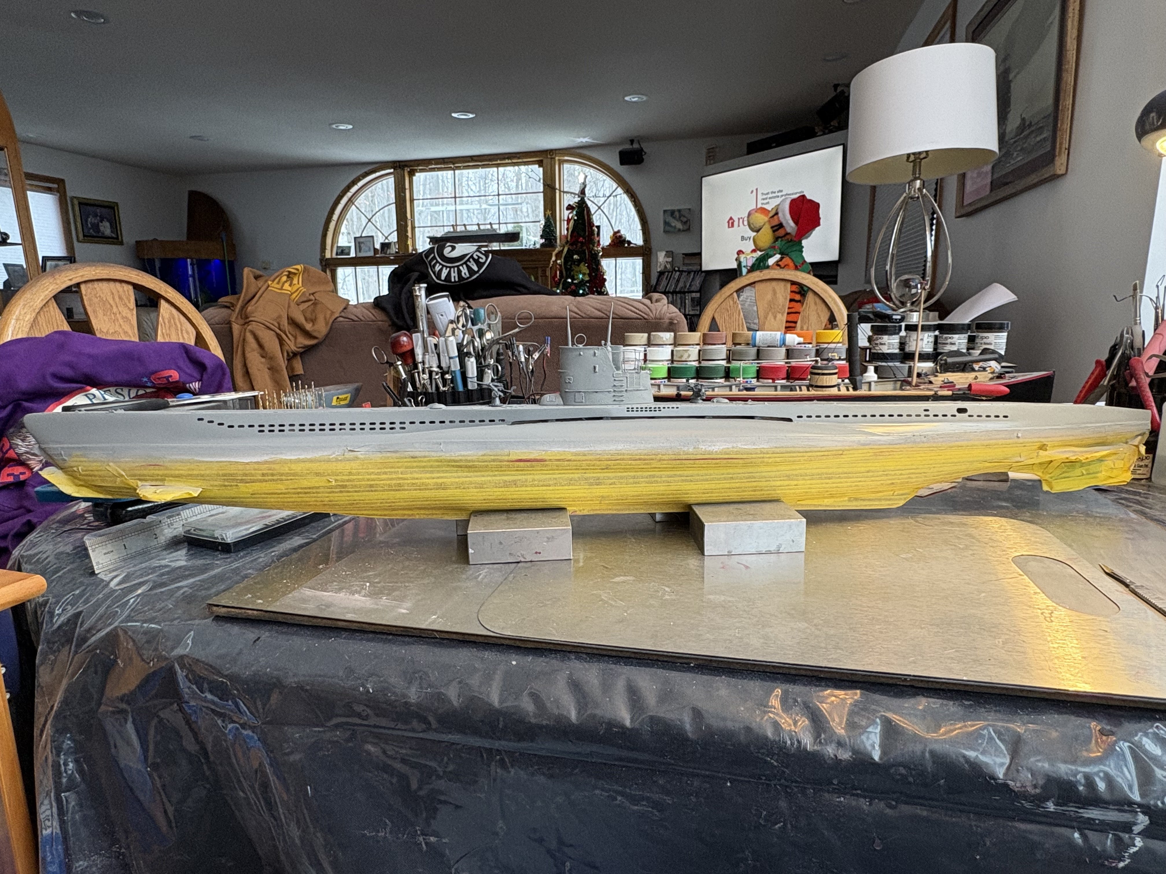 From the sub shipyard. U-47 in dry dock on 1-2-3 blocks (A very useful hobby tool) in primer before fine sanding and marking the waterline. Updated report from the Admiral